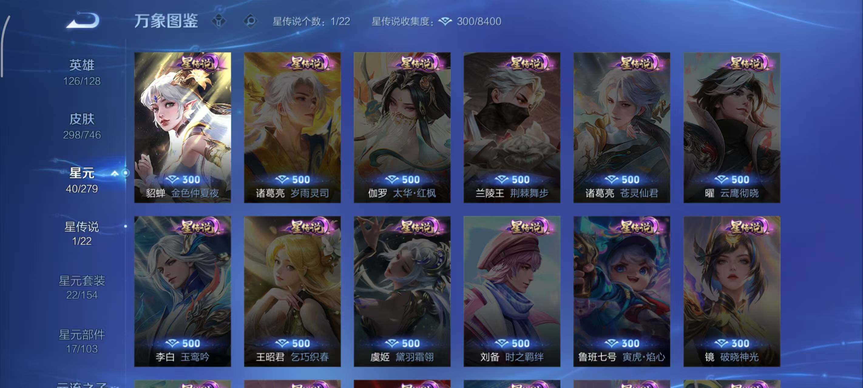 - PX_2095958-贵族等级: V8 英雄数: 124 皮肤数: 285 荣耀水晶: 天鹅之梦 星传说: 金色仲夏夜 传说皮: 云霓雀翎,末日机甲-孙尚香,仲夏夜之梦,音你心动-小乔,音你心动-周瑜,乞巧织情,超时空战士-狄仁杰,花朝如约,挚爱之约,挚爱花嫁,音你闪耀,山海·琳琅生,炽翼辉光 限定皮: 遇见飞天,游园惊梦,梁祝,白鹤梁神女,辉光之辰,白晶晶,天狼溯光者,天狼运算者,热情桑巴,纯白