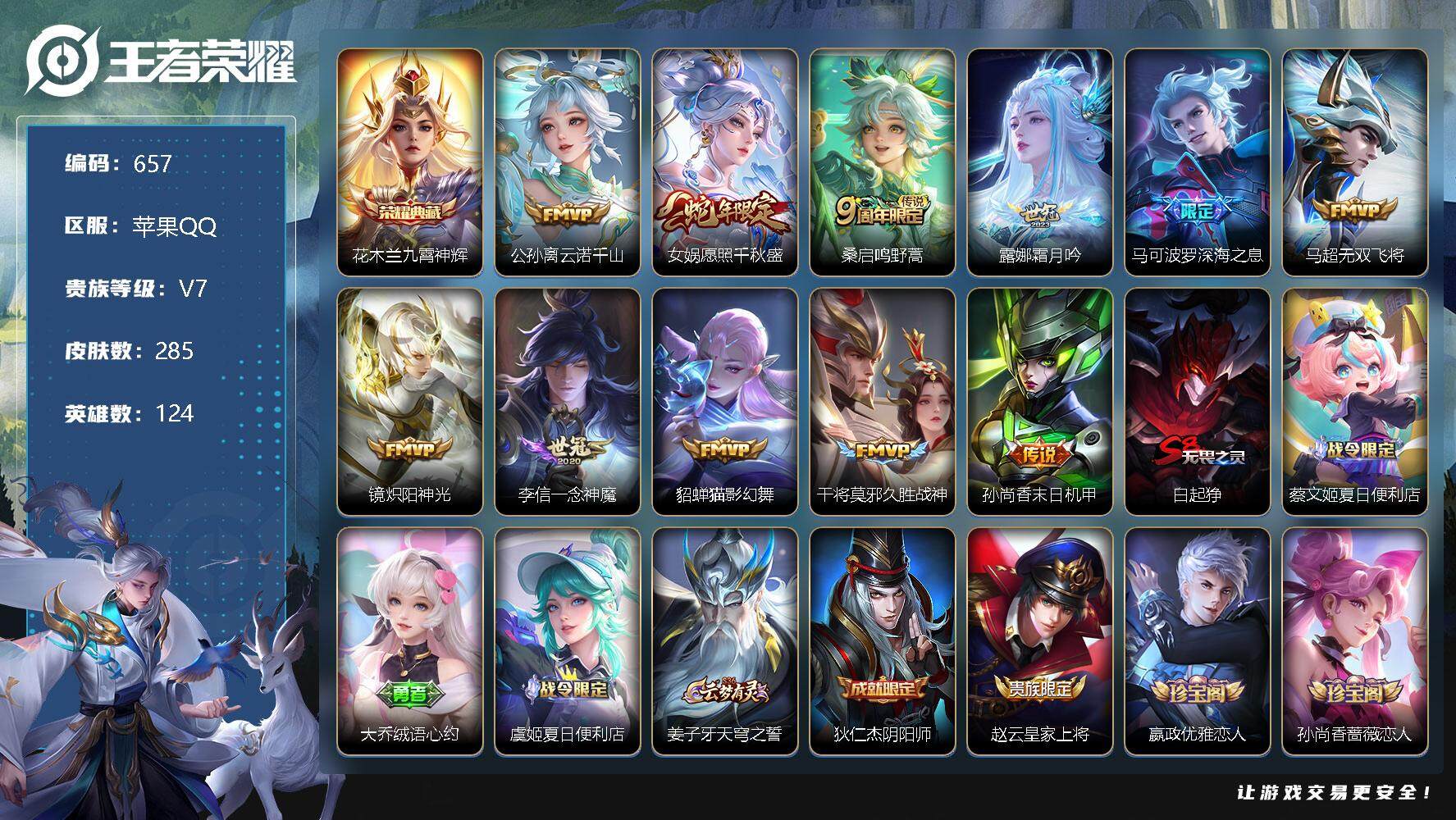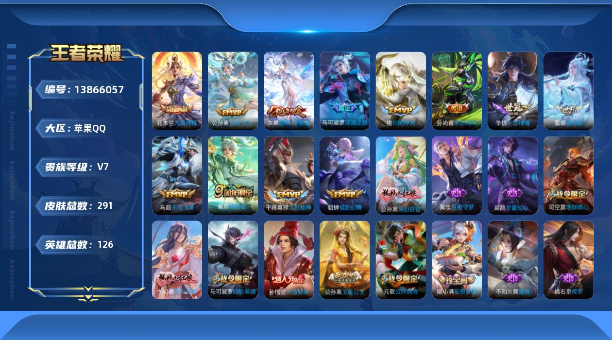[13866057]苹果Q-V7-最强王者段位-124英雄-285皮肤-1典藏-0珍品无双-0无双-0珍品传说-11传说-75史诗 【荣耀典藏】:花木兰九霄神辉 【传说皮肤】:公孙离云诺千山,女娲愿照千秋盛,桑启鸣野蒿,露娜霜月吟,马可波罗深海之息,马超无双飞将,镜炽阳神光,李信一念神魔,貂蝉猫影幻舞,干将莫邪久胜战神,孙尚香末日机甲 【限定皮肤】:白起狰,蔡文姬夏日便利店,大乔绒语心约,虞姬夏日便利店,姜子牙天穹之誓,狄仁杰阴阳师,赵云皇家上将,嬴政优雅恋人,孙尚香蔷薇恋人,鲁班七号狮舞东方,高渐离死亡摇滚,扁鹊奇幻香踪,芈月重明,元歌云间偶戏,元歌无心,夏侯惇朔风刀,曹操烛龙,典韦穷奇,马可波罗暗影游猎,马可波罗深海之息,狄仁杰魔术师,狄仁杰万华元夜,达摩沙漠行僧,项羽海滩派对,老夫子醍醐杖,程咬金演武夺筹,兰陵王金庭之子,亚瑟潮玩骑士王,孙悟空大圣娶亲,牛魔御旌,李元芳云中旅人,钟馗神迹守卫,钟馗驱傩正仪,杨玉环遇见飞天,杨戬潮玩骑兵,雅典娜单词大作战,雅典娜黎明之约,蔡文姬繁星吟游,太乙真人饕餮,太乙真人华丽摇滚,鬼谷子原初探秘者,鬼谷子五谷丰年,百里玄策原初追逐者,弈星混沌棋,梦奇顽趣,公孙离玉兔公主,沈梦溪大漠名商,明世隐疑决卦,裴擒虎李小龙,裴擒虎擒涛扼浪,狂铁御狮,米莱狄御霄,云中君纤云弄巧,盾山御銮,猪八戒西部大镖客,上官婉儿梁祝,西施玲珑珍味,蒙犽狂想玩偶喵,鲁班大师探海日志,桑启海盐诗旅,戈娅驭风魔法,艾琳女武神,艾琳流音漫舞,司空震地狱燃心,阿古朵江河有灵,张良古海寻踪,蒙犽百解令,蒙恬荣光圣徽,鬼谷子天穹祈灯,姬小满妄想食味,沈梦溪龙舞盛年,刘邦剑破天穹,程咬金群星魔术团,周瑜熔金海岸 【赛季限定】:白起狰,芈月重明,夏侯惇朔风刀,曹操烛龙,典韦穷奇,狄仁杰万华元夜,达摩沙漠行僧,老夫子醍醐杖,程咬金演武夺筹,兰陵王金庭之子,张良古海寻踪,牛魔御旌,李元芳云中旅人,钟馗驱傩正仪,雅典娜黎明之约,太乙真人饕餮,鬼谷子原初探秘者,百里玄策原初追逐者,弈星混沌棋,梦奇顽趣,沈梦溪大漠名商,明世隐疑决卦,裴擒虎擒涛扼浪,狂铁御狮,米莱狄御霄,盾山御銮,鲁班大师探海日志,桑启海盐诗旅,鬼谷子天穹祈灯,蒙恬荣光圣徽,刘邦剑破天穹,姜子牙天穹之誓 【战令限定】:蔡文姬夏日便利店,虞姬夏日便利店,鲁班七号狮舞东方,扁鹊奇幻香踪,元歌云间偶戏,马可波罗暗影游猎,艾琳流音漫舞,