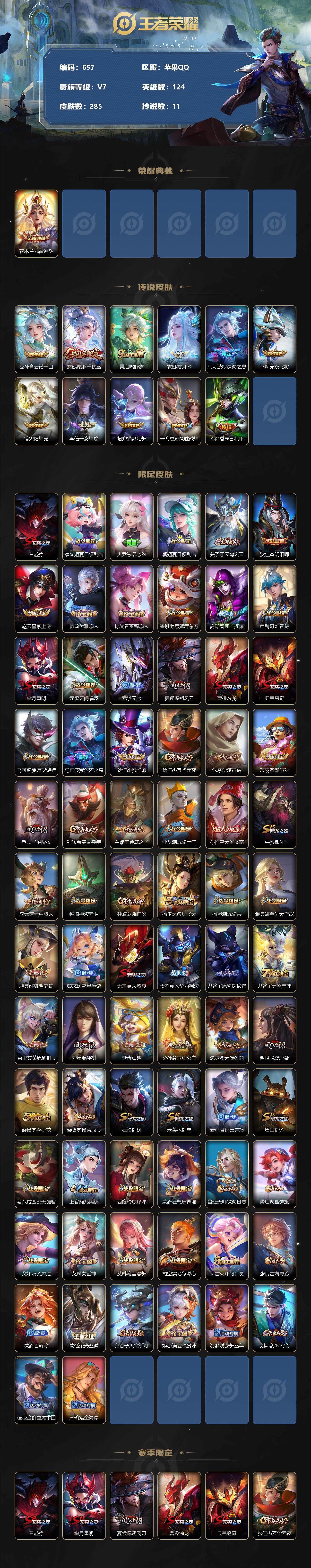 [13866057]苹果Q-V7-最强王者段位-124英雄-285皮肤-1典藏-0珍品无双-0无双-0珍品传说-11传说-75史诗