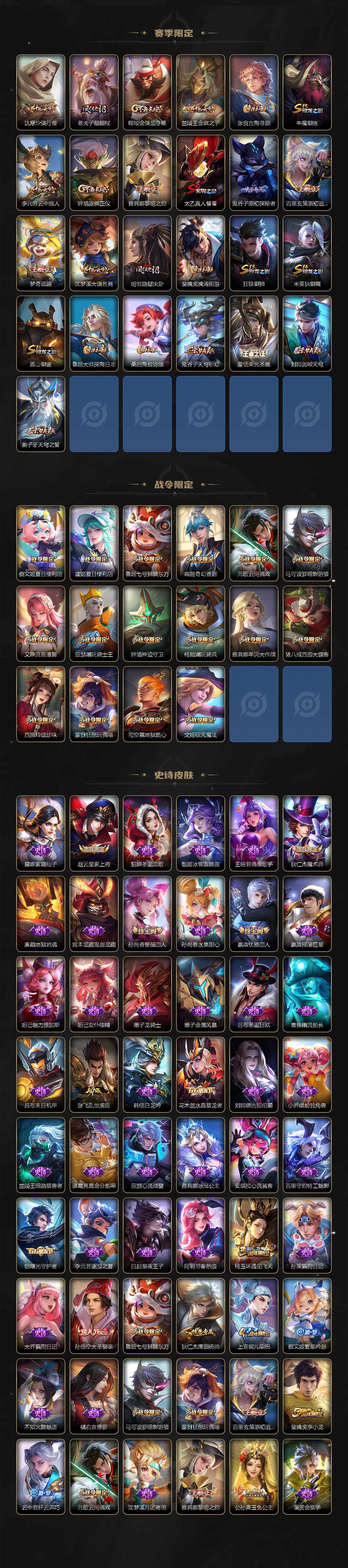 【赛季限定】:白起狰,芈月重明,夏侯惇朔风刀,曹操烛龙,典韦穷奇,狄仁杰万华元夜,达摩沙漠行僧,老夫子醍醐杖,程咬金演武夺筹,兰陵王金庭之子,张良古海寻踪,牛魔御旌,李元芳云中旅人,钟馗驱傩正仪,雅典娜黎明之约,太乙真人饕餮,鬼谷子原初探秘者,百里玄策原初追逐者,弈星混沌棋,梦奇顽趣,沈梦溪大漠名商,明世隐疑决卦,裴擒虎擒涛扼浪,狂铁御狮,米莱狄御霄,盾山御銮,鲁班大师探海日志,桑启海盐诗旅,鬼谷子天穹祈灯,蒙恬荣光圣徽,刘邦剑破天穹,姜子牙天穹之誓