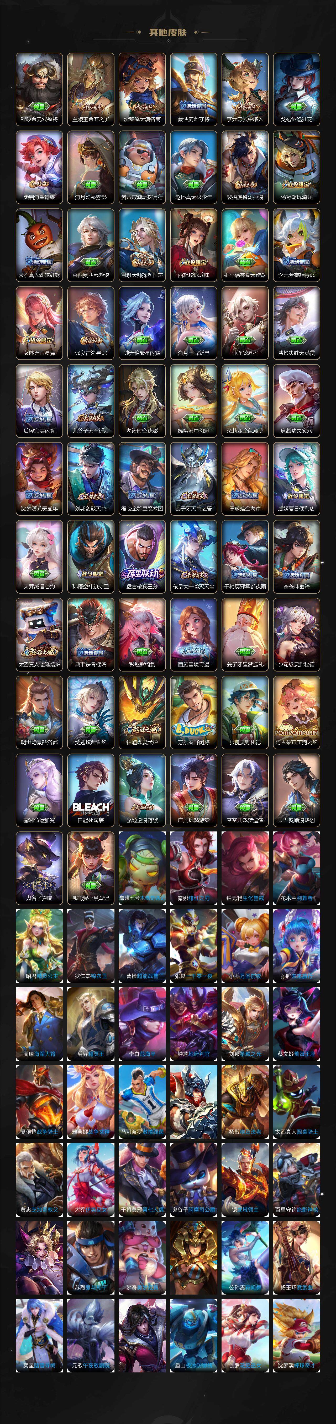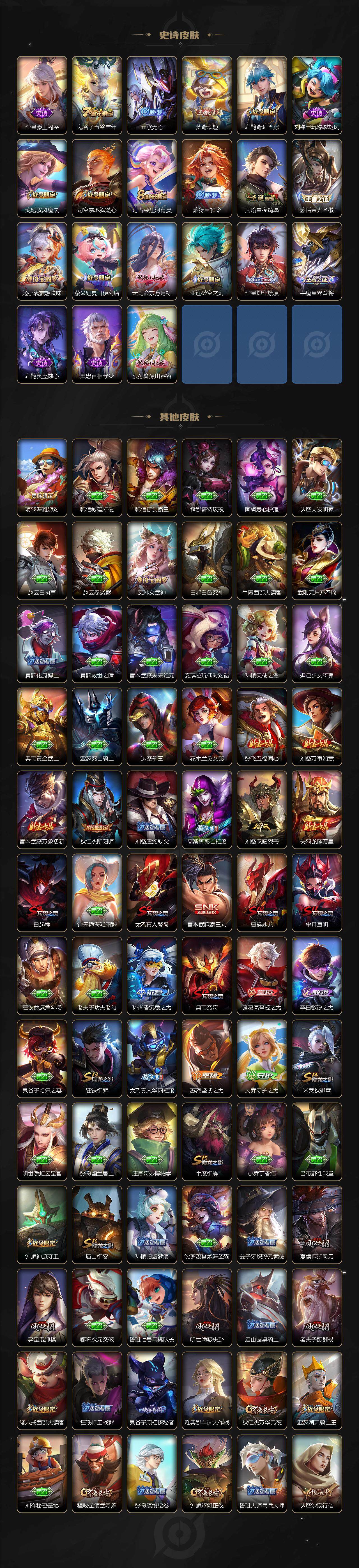 【限定皮肤】:白起狰,蔡文姬夏日便利店,大乔绒语心约,虞姬夏日便利店,姜子牙天穹之誓,狄仁杰阴阳师,赵云皇家上将,嬴政优雅恋人,孙尚香蔷薇恋人,鲁班七号狮舞东方,高渐离死亡摇滚,扁鹊奇幻香踪,芈月重明,元歌云间偶戏,元歌无心,夏侯惇朔风刀,曹操烛龙,典韦穷奇,马可波罗暗影游猎,马可波罗深海之息,狄仁杰魔术师,狄仁杰万华元夜,达摩沙漠行僧,项羽海滩派对,老夫子醍醐杖,程咬金演武夺筹,兰陵王金庭之子,亚瑟潮玩骑士王,孙悟空大圣娶亲,牛魔御旌,李元芳云中旅人,钟馗神迹守卫,钟馗驱傩正仪,杨玉环遇见飞天,杨戬潮玩骑兵,雅典娜单词大作战,雅典娜黎明之约,蔡文姬繁星吟游,太乙真人饕餮,太乙真人华丽摇滚,鬼谷子原初探秘者,鬼谷子五谷丰年,百里玄策原初追逐者,弈星混沌棋,梦奇顽趣,公孙离玉兔公主,沈梦溪大漠名商,明世隐疑决卦,裴擒虎李小龙,裴擒虎擒涛扼浪,狂铁御狮,米莱狄御霄,云中君纤云弄巧,盾山御銮,猪八戒西部大镖客,上官婉儿梁祝,西施玲珑珍味,蒙犽狂想玩偶喵,鲁班大师探海日志,桑启海盐诗旅,戈娅驭风魔法,艾琳女武神,艾琳流音漫舞,司空震地狱燃心,阿古朵江河有灵,张良古海寻踪,蒙犽百解令,蒙恬荣光圣徽,鬼谷子天穹祈灯,姬小满妄想食味,沈梦溪龙舞盛年,刘邦剑破天穹,程咬金群星魔术团,周瑜熔金海岸