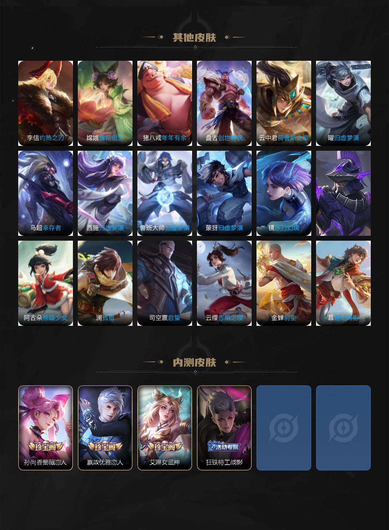 白起狰,太乙真人饕餮,曹操烛龙,芈月重明,典韦穷奇,狂铁御狮,米莱狄御霄,牛魔御旌,盾山御銮,夏侯惇朔风刀,明世隐疑决卦,老夫子醍醐杖,鬼谷子原初探秘者,狄仁杰万华元夜,程咬金演武夺筹,钟馗驱傩正仪,钟馗神迹守卫,鲁班七号狮舞东方,马可波罗暗影游猎,蒙犽狂想玩偶喵,元歌云间偶戏,弈星混沌棋,达摩沙漠行僧,兰陵王金庭之子,沈梦溪大漠名商,李元芳云中旅人,桑启海盐诗旅,裴擒虎擒涛扼浪,鲁班大师探海日志,张良古海寻踪