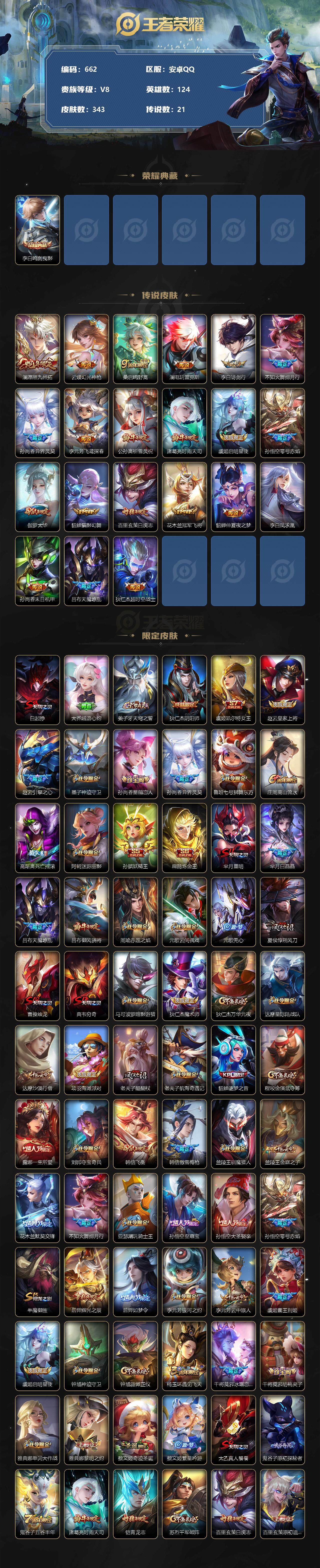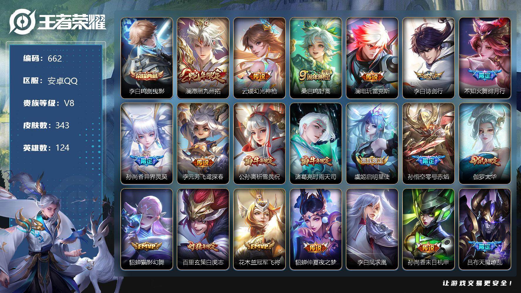 [13866085]安卓Q-V8-最强王者段位-124英雄-343皮肤-1典藏-0珍品无双-0无双-0珍品传说-21传说-97史诗 【荣耀典藏】:李白鸣剑曳影 【传说皮肤】:澜愿照九州拓,云缨幻光神枪,桑启鸣野蒿,澜电玩雷克斯,李白诗剑行,不知火舞绯月行,孙尚香异界灵契,李元芳飞鸢探春,公孙离祈雪灵祝,诸葛亮时雨天司,虞姬启明星使,孙悟空零号赤焰,伽罗太华,貂蝉猫影幻舞,百里玄策白虎志,花木兰冠军飞将,貂蝉仲夏夜之梦,李白凤求凰,孙尚香末日机甲,吕布天魔缭乱,狄仁杰超时空战士 【限定皮肤】:白起狰,大乔绒语心约,姜子牙天穹之誓,狄仁杰阴阳师,虞姬凯尔特女王,赵云皇家上将,赵云引擎之心,墨子神迹守卫,孙尚香蔷薇恋人,孙尚香异界灵契,鲁班七号狮舞东方,庄周高山流水,高渐离死亡摇滚,阿轲迷踪丽影,孙膑妖精王,扁鹊炼金王,芈月重明,芈月白晶晶,吕布天魔缭乱,吕布御风骁将,周瑜赤莲之焰,元歌云间偶戏,元歌无心,夏侯惇朔风刀,曹操烛龙,典韦穷奇,马可波罗暗影游猎,狄仁杰魔术师,狄仁杰万华元夜,达摩星际陆战队,达摩沙漠行僧,项羽海滩派对,老夫子醍醐杖,老夫子航海奇遇记,貂蝉逐梦之音,程咬金演武夺筹,露娜一生所爱,刘邦夺宝奇兵,韩信飞衡,韩信傲雪梅枪,兰陵王驯魔猎人,兰陵王金庭之子,花木兰默契交锋,不知火舞绯月行,亚瑟潮玩骑士王,孙悟空至尊宝,孙悟空大圣娶亲,孙悟空零号赤焰,牛魔御旌,后羿辉光之辰,后羿如梦令,李元芳银河之约,李元芳云中旅人,虞姬霸王别姬,虞姬启明星使,钟馗神迹守卫,钟馗驱傩正仪,杨玉环遇见飞天,干将莫邪冰霜恋舞曲,干将莫邪胡桃夹子,雅典娜单词大作战,雅典娜黎明之约,蔡文姬奇迹圣诞,蔡文姬繁星吟游,太乙真人饕餮,鬼谷子原初探秘者,鬼谷子五谷丰年,诸葛亮时雨天司,铠青龙志,苏烈千军破阵,百里玄策白虎志,百里玄策原初追逐者,百里守约朱雀志,弈星混沌棋,梦奇顽趣,公孙离蜜橘之夏,公孙离祈雪灵祝,沈梦溪星空之诺,沈梦溪大漠名商,明世隐疑决卦,裴擒虎天狼狩猎者,裴擒虎李小龙,裴擒虎擒涛扼浪,狂铁御狮,米莱狄御霄,米莱狄胡桃异想国,云中君纤云弄巧,伽罗太华,盾山御銮,猪八戒西部大镖客,猪八戒猪悟能,上官婉儿梁祝,上官婉儿天狼绘梦者,嫦娥拒霜思,西施玲珑珍味,蒙犽狂想玩偶喵,鲁班大师探海日志,桑启海盐诗旅,戈娅驭风魔法,阿古朵江河有灵,张良古海寻踪,蒙犽百解令,蒙恬荣光圣徽,鬼谷子天穹祈灯,沈梦溪