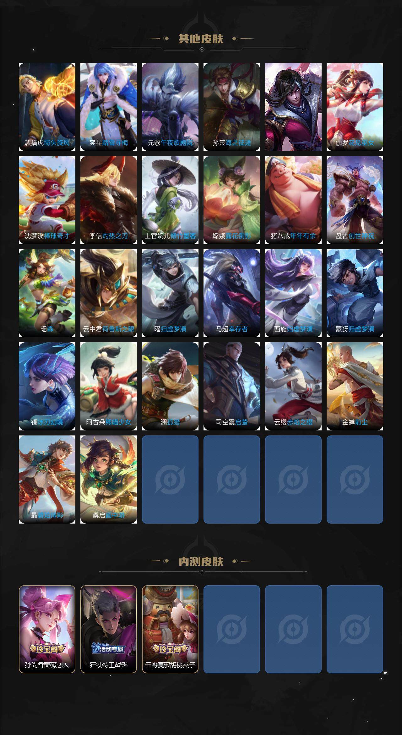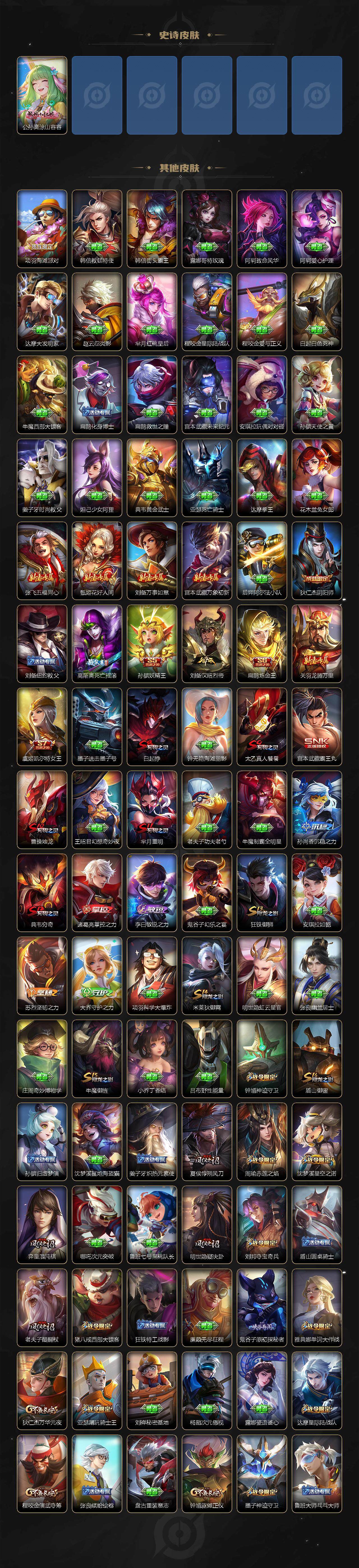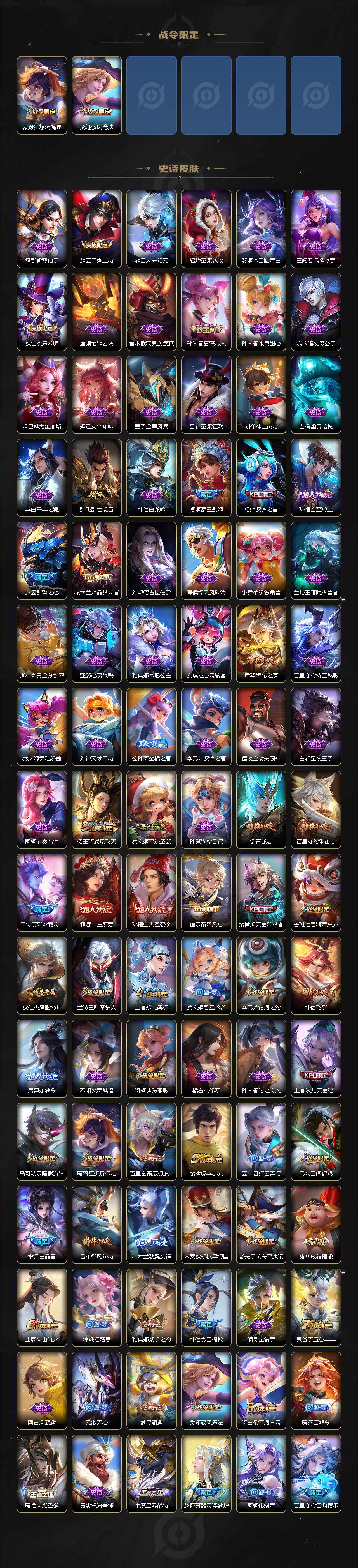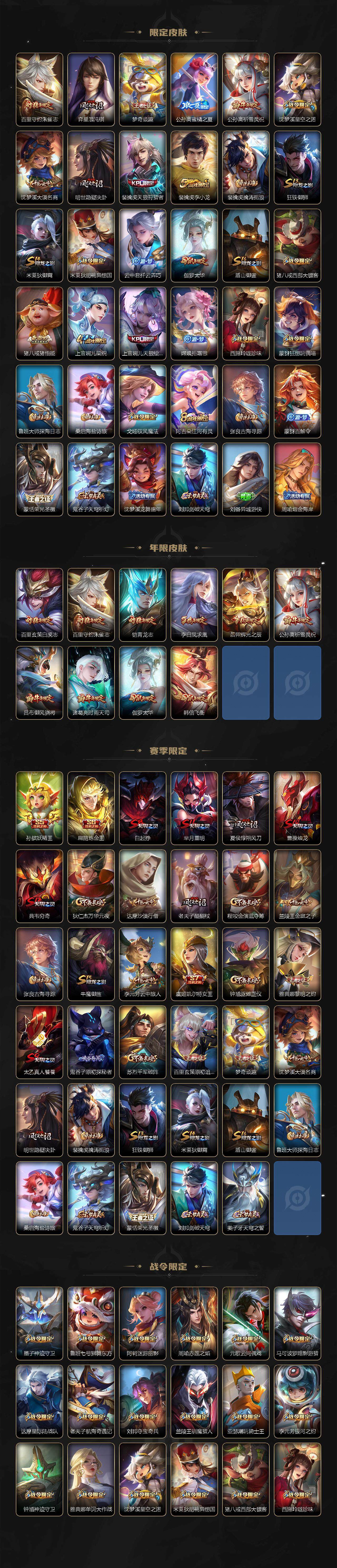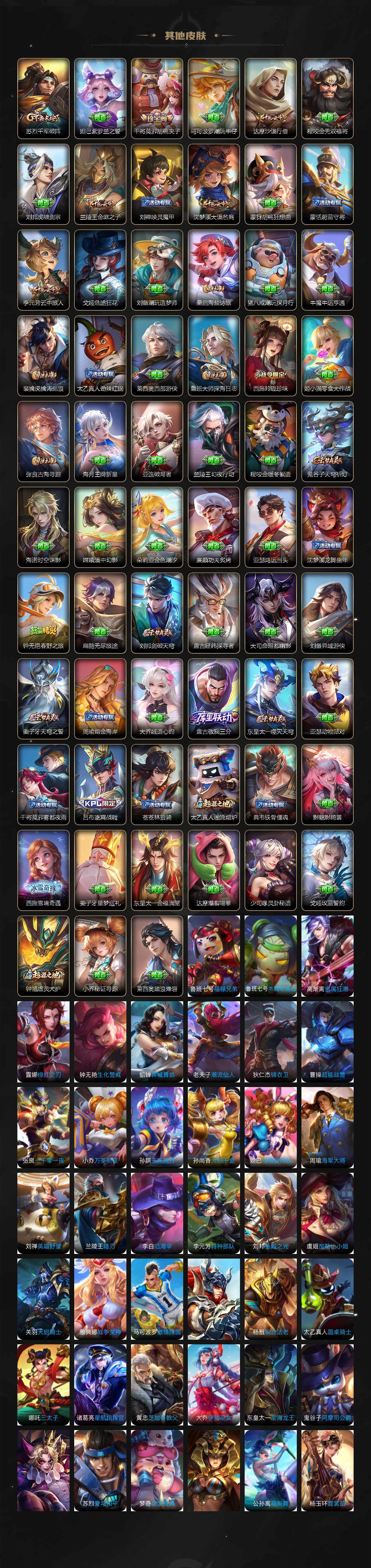【限定皮肤】:白起狰,大乔绒语心约,姜子牙天穹之誓,狄仁杰阴阳师,虞姬凯尔特女王,赵云皇家上将,赵云引擎之心,墨子神迹守卫,孙尚香蔷薇恋人,孙尚香异界灵契,鲁班七号狮舞东方,庄周高山流水,高渐离死亡摇滚,阿轲迷踪丽影,孙膑妖精王,扁鹊炼金王,芈月重明,芈月白晶晶,吕布天魔缭乱,吕布御风骁将,周瑜赤莲之焰,元歌云间偶戏,元歌无心,夏侯惇朔风刀,曹操烛龙,典韦穷奇,马可波罗暗影游猎,狄仁杰魔术师,狄仁杰万华元夜,达摩星际陆战队,达摩沙漠行僧,项羽海滩派对,老夫子醍醐杖,老夫子航海奇遇记,貂蝉逐梦之音,程咬金演武夺筹,露娜一生所爱,刘邦夺宝奇兵,韩信飞衡,韩信傲雪梅枪,兰陵王驯魔猎人,兰陵王金庭之子,花木兰默契交锋,不知火舞绯月行,亚瑟潮玩骑士王,孙悟空至尊宝,孙悟空大圣娶亲,孙悟空零号赤焰,牛魔御旌,后羿辉光之辰,后羿如梦令,李元芳银河之约,李元芳云中旅人,虞姬霸王别姬,虞姬启明星使,钟馗神迹守卫,钟馗驱傩正仪,杨玉环遇见飞天,干将莫邪冰霜恋舞曲,干将莫邪胡桃夹子,雅典娜单词大作战,雅典娜黎明之约,蔡文姬奇迹圣诞,蔡文姬繁星吟游,太乙真人饕餮,鬼谷子原初探秘者,鬼谷子五谷丰年,诸葛亮时雨天司,铠青龙志,苏烈千军破阵,百里玄策白虎志,百里玄策原初追逐者,百里守约朱雀志,弈星混沌棋,梦奇顽趣,公孙离蜜橘之夏,公孙离祈雪灵祝,沈梦溪星空之诺,沈梦溪大漠名商,明世隐疑决卦,裴擒虎天狼狩猎者,裴擒虎李小龙,裴擒虎擒涛扼浪,狂铁御狮,米莱狄御霄,米莱狄胡桃异想国,云中君纤云弄巧,伽罗太华,盾山御銮,猪八戒西部大镖客,猪八戒猪悟能,上官婉儿梁祝,上官婉儿天狼绘梦者,嫦娥拒霜思,西施玲珑珍味,蒙犽狂想玩偶喵,鲁班大师探海日志,桑启海盐诗旅,戈娅驭风魔法,阿古朵江河有灵,张良古海寻踪,蒙犽百解令,蒙恬荣光圣徽,鬼谷子天穹祈灯,沈梦溪