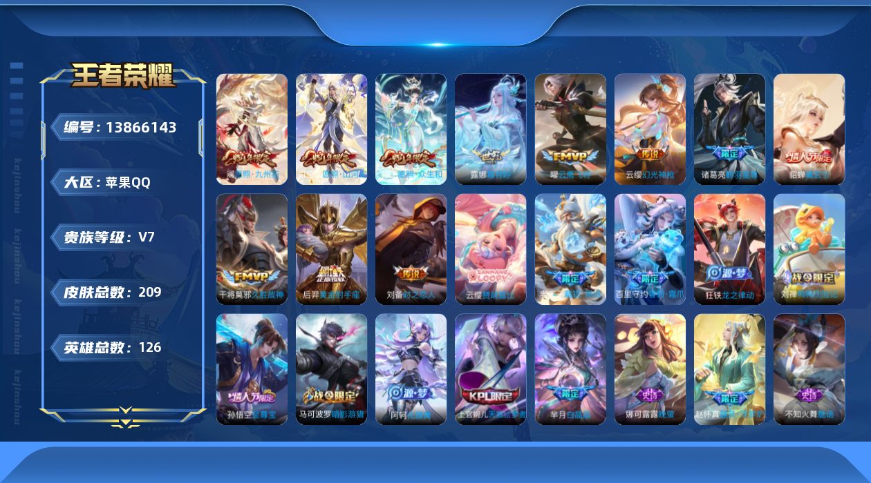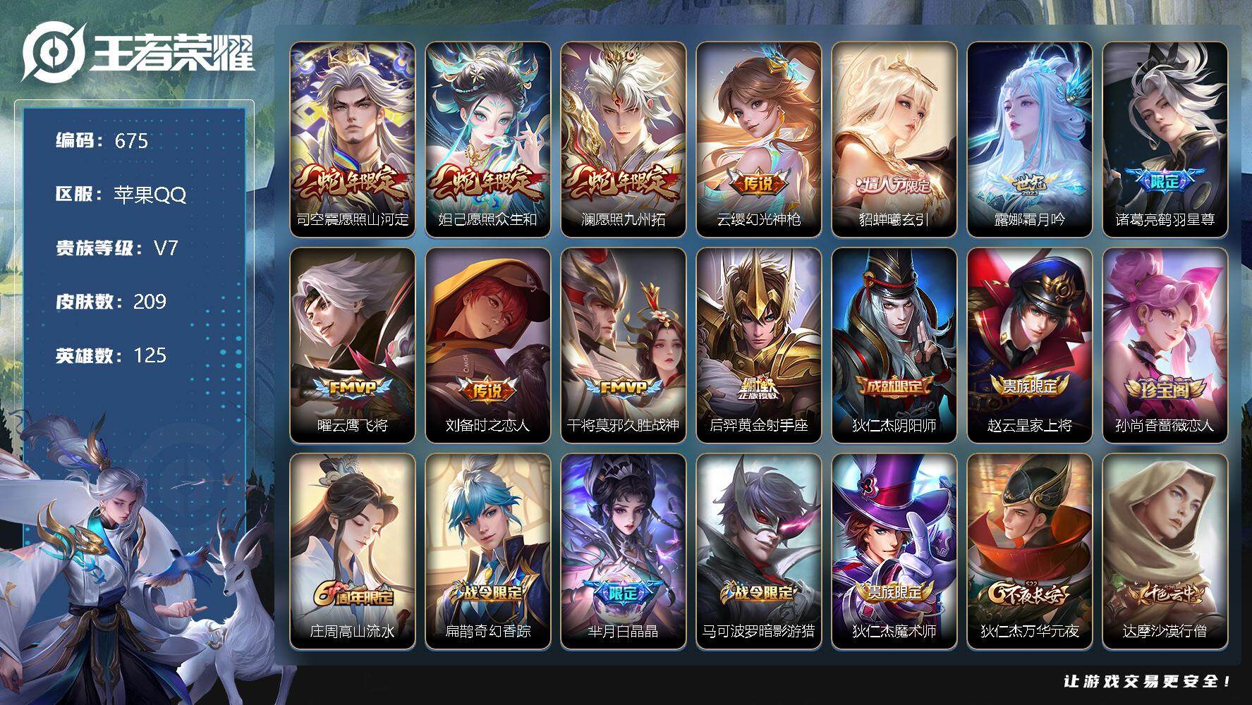 [13866143]苹果Q-V7-最强王者段位-125英雄-209皮肤-0典藏-0珍品无双-0无双-0珍品传说-11传说-64史诗