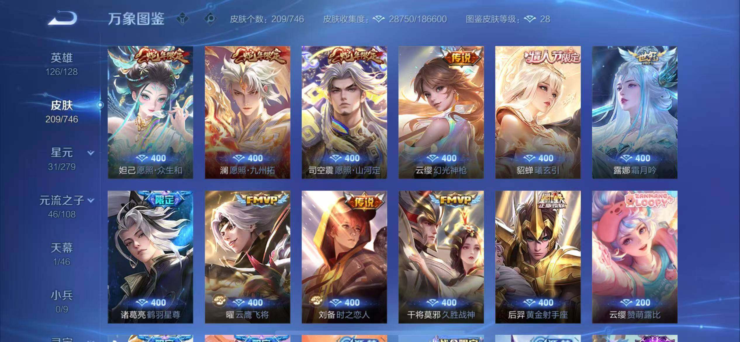 【史诗皮肤】:项羽苍穹之光,露娜紫霞仙子,赵云皇家上将,赵云未来纪元,貂蝉圣诞恋歌,甄姬冰雪圆舞曲,王昭君偶像歌手,狄仁杰魔术师,廉颇地狱岩魂,宫本武藏鬼剑武藏,孙尚香蔷薇恋人,孙尚香水果甜心,嬴政暗夜贵公子,嬴政摇滚巨星,妲己女仆咖啡,墨子金属风暴,吕布圣诞狂欢,曹操幽灵船长,吕布末日机甲,孙悟空至尊宝,刘邦德古拉伯爵,夏侯惇乘风破浪,小乔缤纷独角兽,兰陵王暗隐猎兽者,诸葛亮黄金分割率,亚瑟心灵战警,百里守约特工魅影,铠曙光守护者,蔡文姬舞动绿茵,李元芳逐浪之夏,白起星夜王子,阿轲节奏热浪,大乔猫狗日记,狄仁杰鹰眼统帅,上官婉儿梁祝,娜可露露晚萤,不知火舞魅语,橘右京修罗,上官婉儿天狼绘梦者,马可波罗暗影游猎,裴擒虎李小龙,云中君纤云弄巧,芈月白晶晶,蒙犽龙鼓争鸣,干将莫邪真爱魔法,庄周高山流水,嫦娥拒霜思,夏洛特永昼,扁鹊奇幻香踪,蒙犽百解令,周瑜