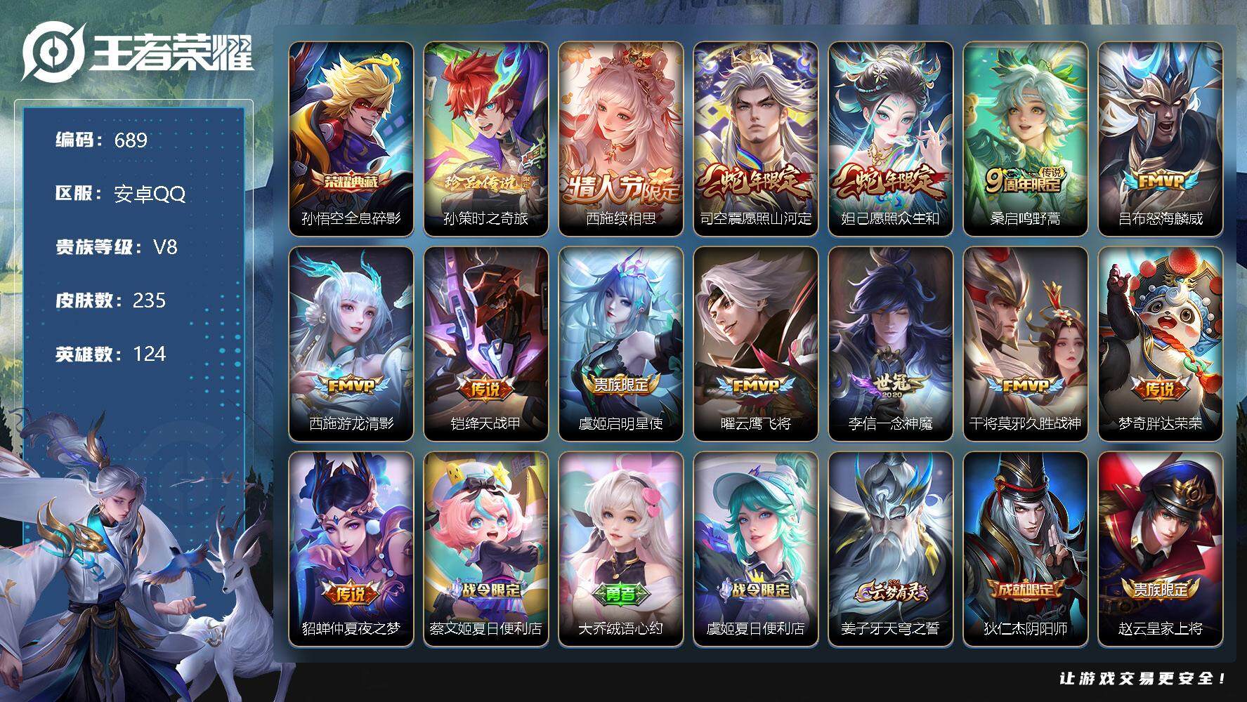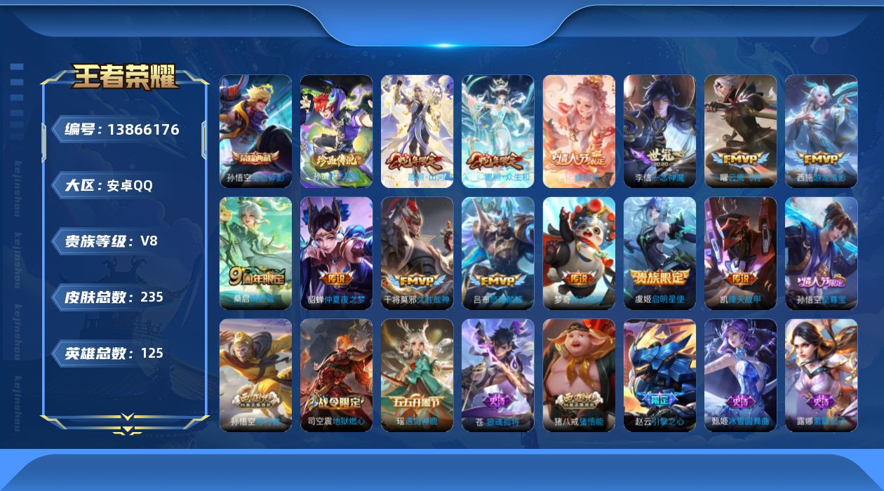 [13866176]安卓Q-V8-至尊星耀III段位-124英雄-235皮肤-1典藏-0珍品无双-0无双-1珍品传说-13传说-62史诗