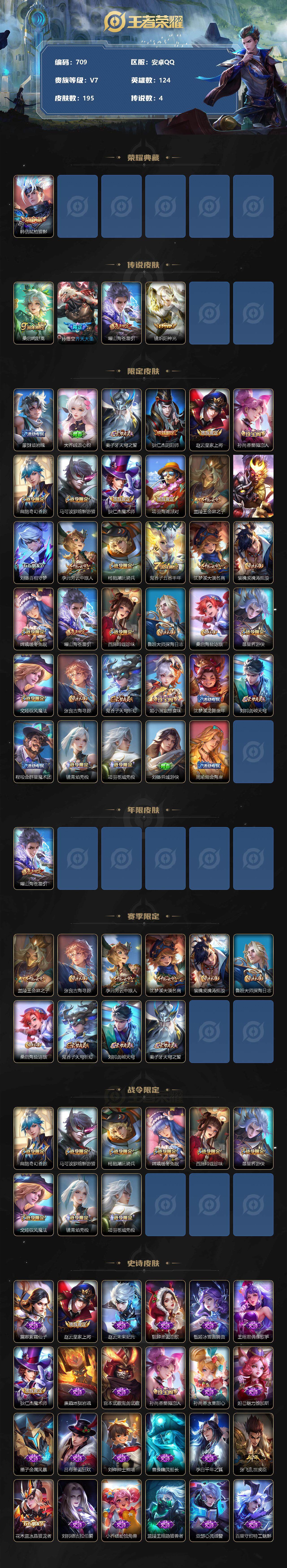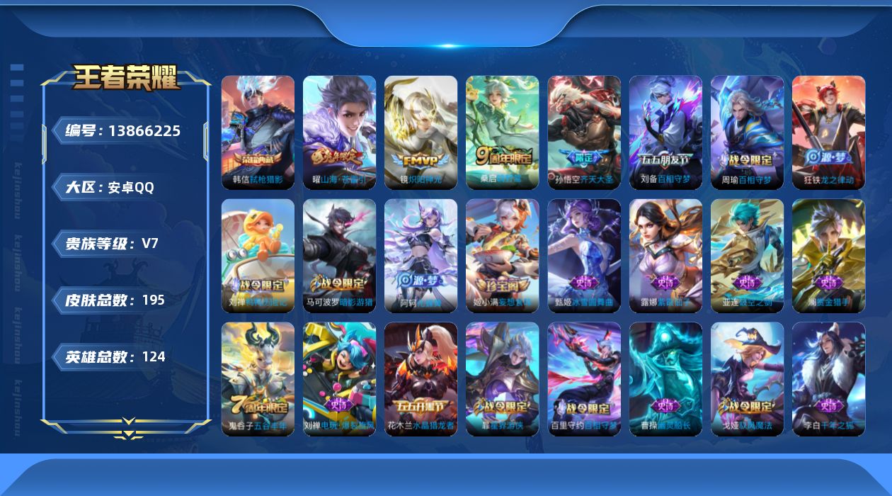 [13866225]安卓Q-V7-至尊星耀V段位-124英雄-195皮肤-1典藏-0珍品无双-0无双-0珍品传说-4传说-51史诗