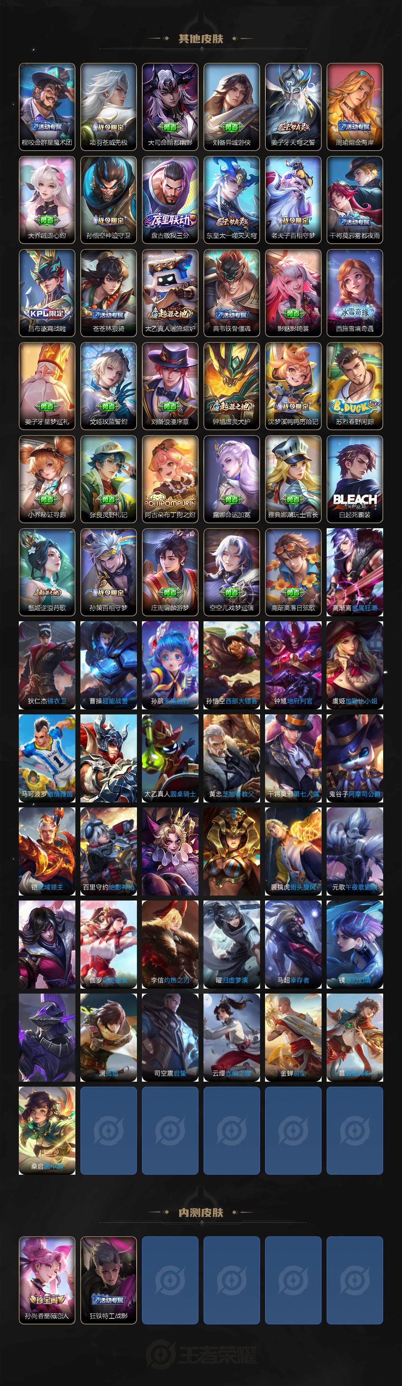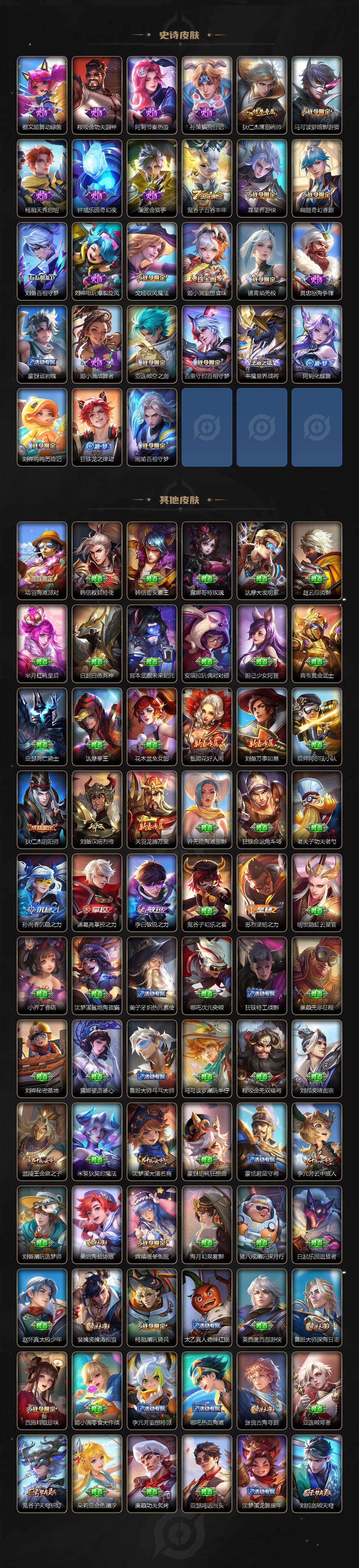 【史诗皮肤】:露娜紫霞仙子,赵云皇家上将,赵云未来纪元,貂蝉圣诞恋歌,甄姬冰雪圆舞曲,王昭君偶像歌手,狄仁杰魔术师,廉颇地狱岩魂,宫本武藏鬼剑武藏,孙尚香蔷薇恋人,孙尚香水果甜心,妲己魅力维加斯,墨子金属风暴,吕布圣诞狂欢,刘禅绅士熊喵,曹操幽灵船长,李白千年之狐,张飞乱世虎臣,花木兰水晶猎龙者,刘邦德古拉伯爵,小乔缤纷独角兽,兰陵王暗隐猎兽者,亚瑟心灵战警,百里守约特工魅影,蔡文姬舞动绿茵,程咬金功夫厨神,阿轲节奏热浪,孙策猫狗日记,狄仁杰鹰眼统帅,马可波罗暗影游猎,杨戬天秀启明,钟馗乐园奇幻夜,澜赏金猎手,鬼谷子五谷丰年,暃星界游侠,扁鹊奇幻香踪,刘备百相守梦,刘禅电玩爆裂旋风,戈娅驭风魔法,姬小满妄想食味,镜青焰无极,黄忠怒海争锋,蒙犽顽岩魄,姬小满战舞者,亚连破空之剑,百里守约百相守梦,牛魔星界战将,阿轲化蝶舞,刘禅鸭鸭历险记,狂铁龙之律动,周瑜百相守梦