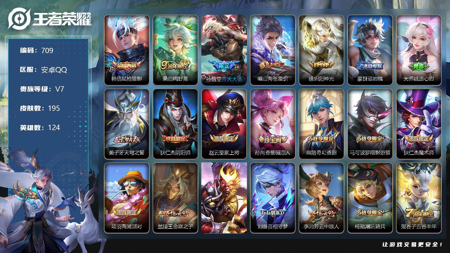 [13866225]安卓Q-V7-至尊星耀V段位-124英雄-195皮肤-1典藏-0珍品无双-0无双-0珍品传说-4传说-51史诗 【荣耀典藏】:韩信弑枪猎影 【传说皮肤】:桑启鸣野蒿,孙悟空齐天大圣,曜山海苍雷引,镜炽阳神光 【限定皮肤】:蒙犽顽岩魄,大乔绒语心约,姜子牙天穹之誓,狄仁杰阴阳师,赵云皇家上将,孙尚香蔷薇恋人,扁鹊奇幻香踪,马可波罗暗影游猎,狄仁杰魔术师,项羽海滩派对,兰陵王金庭之子,孙悟空齐天大圣,刘备百相守梦,李元芳云中旅人,杨戬潮玩骑兵,鬼谷子五谷丰年,沈梦溪大漠名商,裴擒虎擒涛扼浪,嫦娥暖冬兔眠,曜山海苍雷引,西施玲珑珍味,鲁班大师探海日志,桑启海盐诗旅,暃星界游侠,戈娅驭风魔法,张良古海寻踪,鬼谷子天穹祈灯,姬小满妄想食味,沈梦溪龙舞盛年,刘邦剑破天穹,程咬金群星魔术团,镜青焰无极,项羽苍威无极,刘备异域游侠,周瑜熔金海岸 【年限皮肤】:曜山海苍雷引 【赛季限定】:兰陵王金庭之子,张良古海寻踪,李元芳云中旅人,沈梦溪大漠名商,裴擒虎擒涛扼浪,鲁班大师探海日志,桑启海盐诗旅,鬼谷子天穹祈灯,刘邦剑破天穹,姜子牙天穹之誓 【战令限定】:扁鹊奇幻香踪,马可波罗暗影游猎,杨戬潮玩骑兵,嫦娥暖冬兔眠,西施玲珑珍味,暃星界游侠,戈娅驭风魔法,镜青焰无极,项羽苍威无极 【史诗皮肤】:露娜紫霞仙子,赵云皇家上将,赵云未来纪元,貂蝉圣诞恋歌,甄姬冰雪圆舞曲,王昭君偶像歌手,狄仁杰魔术师,廉颇地狱岩魂,宫本武藏鬼剑武藏,孙尚香蔷薇恋人,孙尚香水果甜心,妲己魅力维加斯,墨子金属风暴,吕布圣诞狂欢,刘禅绅士熊喵,曹操幽灵船长,李白千年之狐,张飞乱世虎臣,花木兰水晶猎龙者,刘邦德古拉伯爵,小乔缤纷独角兽,兰陵王暗隐猎兽者,亚瑟心灵战警,百里守约特工魅影,蔡文姬舞动绿茵,程咬金功夫厨神,阿轲节奏热浪,孙策猫狗日记,狄仁杰鹰眼统帅,马可波罗暗影游猎,杨戬天秀启明,钟馗乐园奇幻夜,澜赏金猎手,鬼谷子五谷丰年,暃星界游侠,扁鹊奇幻香踪,刘备百相守梦,刘禅电玩爆裂旋风,戈娅驭风魔法,姬小满妄想食味,镜青焰无极,黄忠怒海争锋,蒙犽顽岩魄,姬小满战舞者,亚连破空之剑,百里守约百相守梦,牛魔星界战将,阿轲化蝶舞,刘禅鸭鸭历险记,狂铁龙之律动,周瑜百相守梦 【其他皮肤】:项羽海滩派对,韩信教廷特使,韩信街头霸王,露娜哥特玫瑰,达摩大发明家,赵云忍炎影,芈月红桃皇后,白起白色死神,宫本武藏未来纪元,安琪