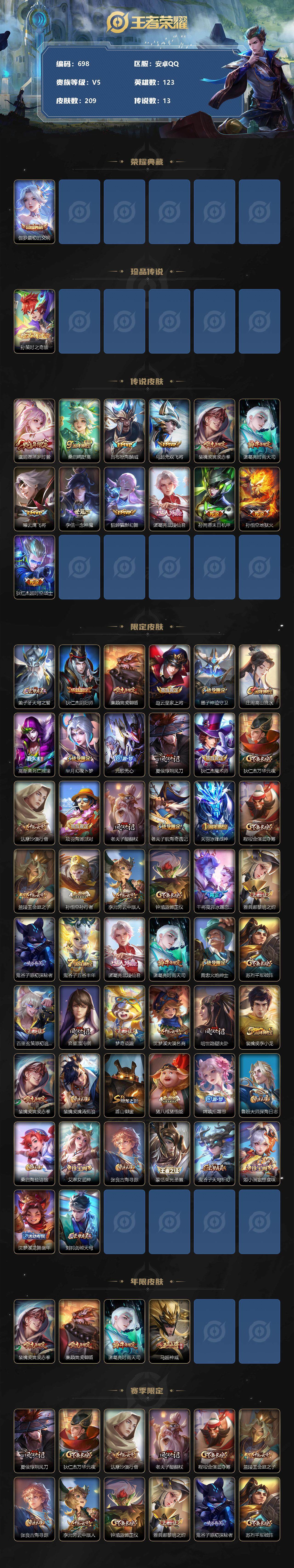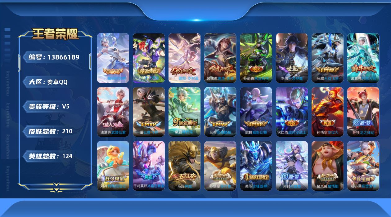 [13866189]安卓Q-V5-最强王者段位-123英雄-209皮肤-1典藏-0珍品无双-0无双-1珍品传说-13传说-58史诗