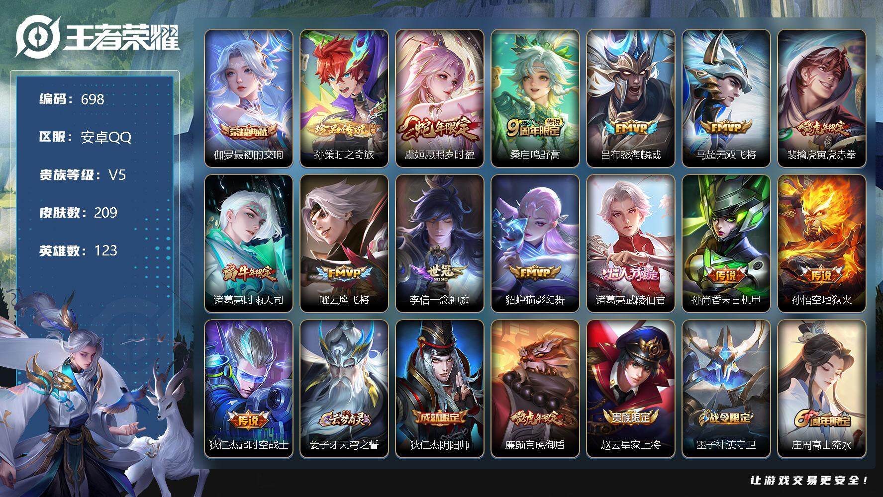 [13866189]安卓Q-V5-最强王者段位-123英雄-209皮肤-1典藏-0珍品无双-0无双-1珍品传说-13传说-58史诗 【荣耀典藏】:伽罗最初的交响 【珍品传说】:孙策时之奇旅 【传说皮肤】:虞姬愿照岁时盈,桑启鸣野蒿,吕布怒海麟威,马超无双飞将,裴擒虎寅虎赤拳,诸葛亮时雨天司,曜云鹰飞将,李信一念神魔,貂蝉猫影幻舞,诸葛亮武陵仙君,孙尚香末日机甲,孙悟空地狱火,狄仁杰超时空战士 【限定皮肤】:姜子牙天穹之誓,狄仁杰阴阳师,廉颇寅虎御盾,赵云皇家上将,墨子神迹守卫,庄周高山流水,高渐离死亡摇滚,芈月幻夜卜梦,元歌无心,夏侯惇朔风刀,狄仁杰魔术师,狄仁杰万华元夜,达摩沙漠行僧,项羽海滩派对,老夫子醍醐杖,老夫子航海奇遇记,关羽冰锋战神,程咬金演武夺筹,兰陵王金庭之子,孙悟空孙行者,李元芳云中旅人,钟馗驱傩正仪,干将莫邪冰霜恋舞曲,雅典娜黎明之约,鬼谷子原初探秘者,鬼谷子五谷丰年,诸葛亮武陵仙君,诸葛亮时雨天司,黄忠火炮绅士,苏烈千军破阵,百里玄策原初追逐者,弈星混沌棋,梦奇顽趣,沈梦溪大漠名商,明世隐疑决卦,裴擒虎李小龙,裴擒虎寅虎赤拳,裴擒虎擒涛扼浪,盾山御銮,猪八戒猪悟能,嫦娥拒霜思,鲁班大师探海日志,桑启海盐诗旅,艾琳女武神,张良古海寻踪,蒙恬荣光圣徽,鬼谷子天穹祈灯,姬小满妄想食味,沈梦溪龙舞盛年,刘邦剑破天穹 【年限皮肤】:裴擒虎寅虎赤拳,廉颇寅虎御盾,诸葛亮时雨天司,马超神威 【赛季限定】:夏侯惇朔风刀,狄仁杰万华元夜,达摩沙漠行僧,老夫子醍醐杖,程咬金演武夺筹,兰陵王金庭之子,张良古海寻踪,李元芳云中旅人,钟馗驱傩正仪,雅典娜黎明之约,鬼谷子原初探秘者,苏烈千军破阵,百里玄策原初追逐者,弈星混沌棋,梦奇顽趣,沈梦溪大漠名商,明世隐疑决卦,裴擒虎擒涛扼浪,盾山御銮,鲁班大师探海日志,桑启海盐诗旅,鬼谷子天穹祈灯,蒙恬荣光圣徽,刘邦剑破天穹,姜子牙天穹之誓 【战令限定】:墨子神迹守卫,芈月幻夜卜梦,老夫子航海奇遇记,黄忠火炮绅士 【史诗皮肤】:露娜紫霞仙子,赵云皇家上将,貂蝉圣诞恋歌,甄姬冰雪圆舞曲,狄仁杰魔术师,宫本武藏鬼剑武藏,孙尚香水果甜心,妲己魅力维加斯,墨子金属风暴,曹操幽灵船长,李白千年之狐,张飞乱世虎臣,韩信白龙吟,关羽冰锋战神,花木兰水晶猎龙者,刘邦德古拉伯爵,夏侯惇乘风破浪,兰陵王暗隐猎兽者,安琪拉心灵骇客,百里守约特工魅影,铠曙光守护者,李元芳