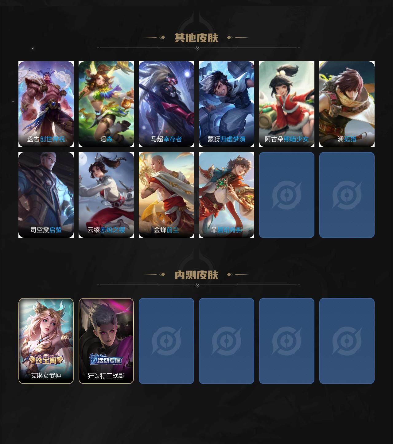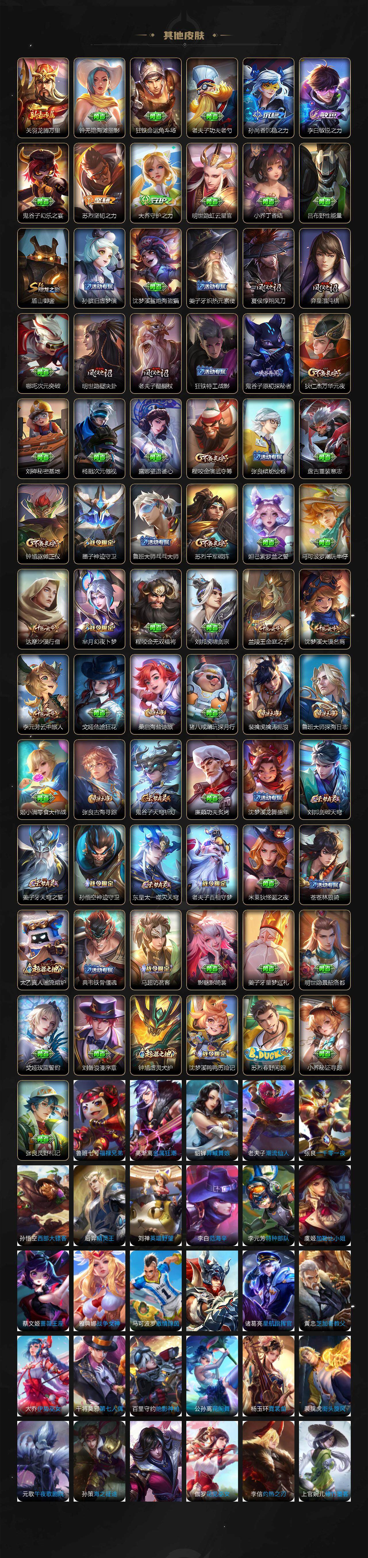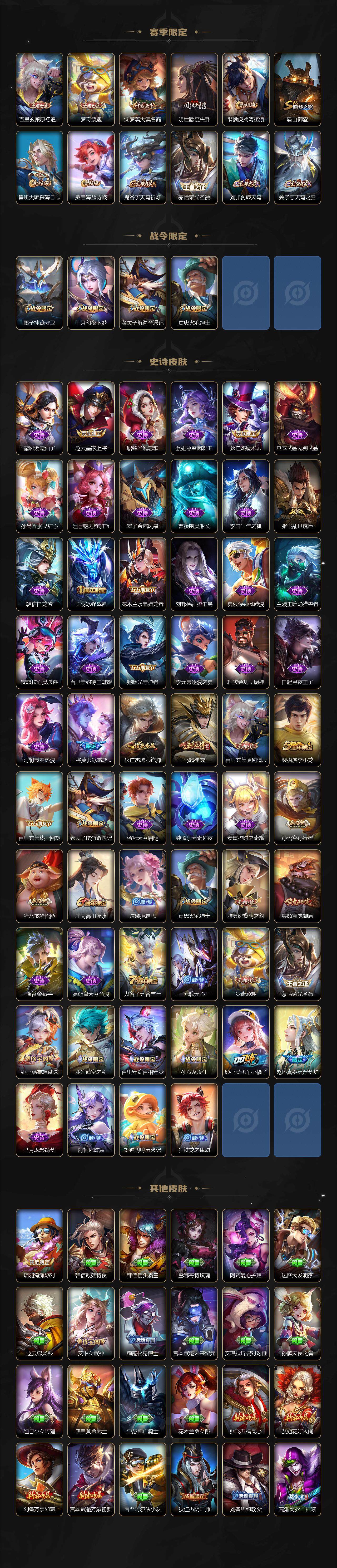 【赛季限定】:夏侯惇朔风刀,狄仁杰万华元夜,达摩沙漠行僧,老夫子醍醐杖,程咬金演武夺筹,兰陵王金庭之子,张良古海寻踪,李元芳云中旅人,钟馗驱傩正仪,雅典娜黎明之约,鬼谷子原初探秘者,苏烈千军破阵,百里玄策原初追逐者,弈星混沌棋,梦奇顽趣,沈梦溪大漠名商,明世隐疑决卦,裴擒虎擒涛扼浪,盾山御銮,鲁班大师探海日志,桑启海盐诗旅,鬼谷子天穹祈灯,蒙恬荣光圣徽,刘邦剑破天穹,姜子牙天穹之誓