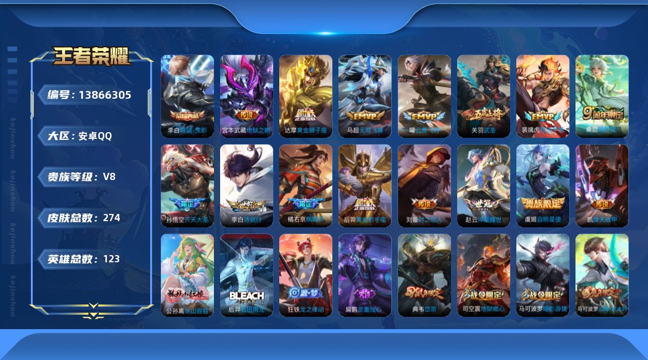 [13866305]安卓Q-V8-最强王者段位-123英雄-274皮肤-1典藏-0珍品无双-0无双-0珍品传说-15传说-91史诗