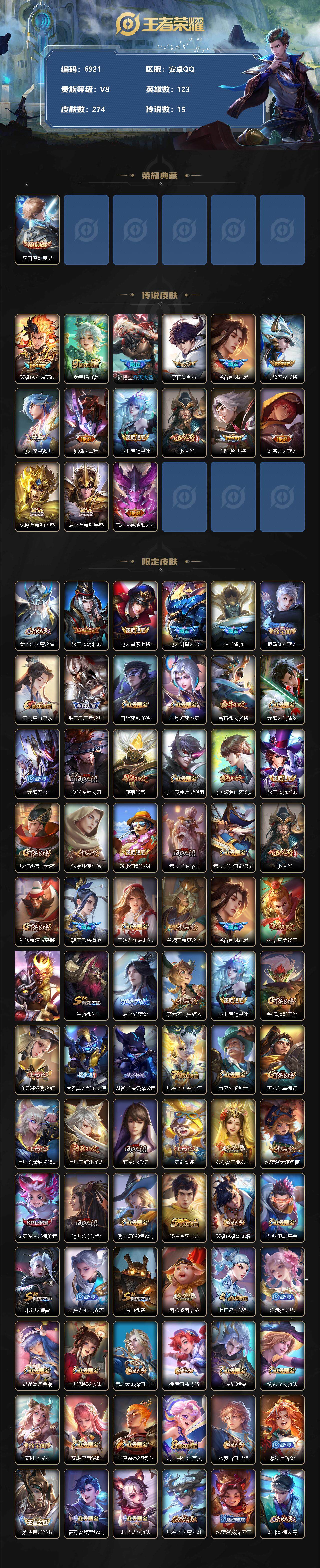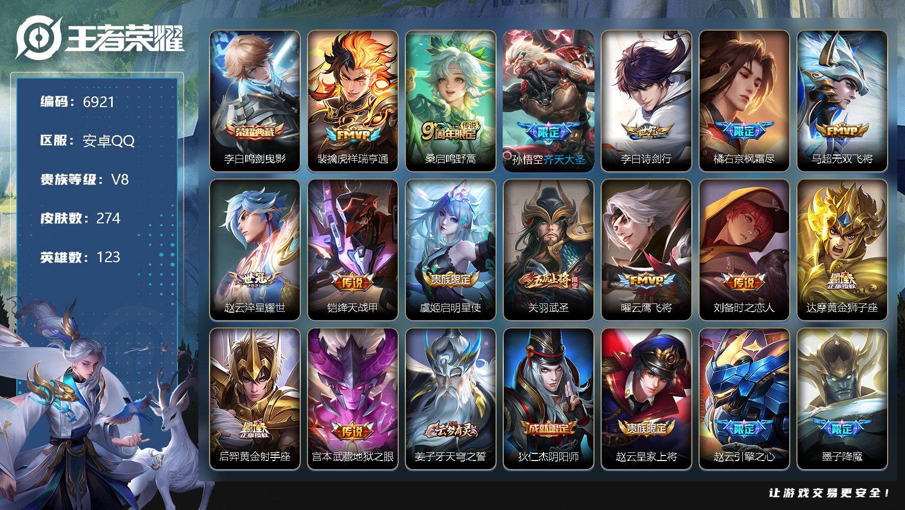 [13866305]安卓Q-V8-最强王者段位-123英雄-274皮肤-1典藏-0珍品无双-0无双-0珍品传说-15传说-91史诗 【荣耀典藏】:李白鸣剑曳影 【传说皮肤】:裴擒虎祥瑞亨通,桑启鸣野蒿,孙悟空齐天大圣,李白诗剑行,橘右京枫霜尽,马超无双飞将,赵云淬星耀世,铠绛天战甲,虞姬启明星使,关羽武圣,曜云鹰飞将,刘备时之恋人,达摩黄金狮子座,后羿黄金射手座,宫本武藏地狱之眼 【限定皮肤】:姜子牙天穹之誓,狄仁杰阴阳师,赵云皇家上将,赵云引擎之心,墨子降魔,嬴政优雅恋人,庄周高山流水,钟无艳王者之锤,白起夜都怪侠,芈月幻夜卜梦,吕布御风骁将,元歌云间偶戏,元歌无心,夏侯惇朔风刀,典韦岱宗,马可波罗暗影游猎,马可波罗山海玄木吟,狄仁杰魔术师,狄仁杰万华元夜,达摩沙漠行僧,项羽海滩派对,老夫子醍醐杖,老夫子航海奇遇记,关羽武圣,程咬金演武夺筹,韩信傲雪梅枪,王昭君午后时光,兰陵王金庭之子,橘右京枫霜尽,孙悟空美猴王,孙悟空齐天大圣,牛魔御旌,后羿如梦令,李元芳云中旅人,虞姬启明星使,钟馗驱傩正仪,雅典娜黎明之约,太乙真人华丽摇滚,鬼谷子原初探秘者,鬼谷子五谷丰年,黄忠火炮绅士,苏烈千军破阵,百里玄策原初追逐者,百里守约朱雀志,弈星混沌棋,梦奇顽趣,公孙离玉兔公主,沈梦溪大漠名商,沈梦溪匿光破解者,明世隐疑决卦,明世隐吟游魔法,裴擒虎李小龙,裴擒虎擒涛扼浪,狂铁电玩高手,米莱狄御霄,云中君纤云弄巧,盾山御銮,猪八戒猪悟能,上官婉儿梁祝,嫦娥拒霜思,嫦娥暖冬兔眠,西施玲珑珍味,鲁班大师探海日志,桑启海盐诗旅,暃星界游侠,戈娅驭风魔法,艾琳女武神,艾琳流音漫舞,司空震地狱燃心,阿古朵江河有灵,张良古海寻踪,蒙犽百解令,蒙恬荣光圣徽,高渐离燃音魔法,妲己灵卜魔法,鬼谷子天穹祈灯,沈梦溪龙舞盛年,刘邦剑破天穹,程咬金群星魔术团,周瑜熔金海岸 【年限皮肤】:百里守约朱雀志,孙悟空美猴王,吕布御风骁将,典韦岱宗,关羽武圣,马可波罗山海玄木吟 【赛季限定】:夏侯惇朔风刀,狄仁杰万华元夜,达摩沙漠行僧,老夫子醍醐杖,程咬金演武夺筹,兰陵王金庭之子,张良古海寻踪,牛魔御旌,李元芳云中旅人,钟馗驱傩正仪,雅典娜黎明之约,鬼谷子原初探秘者,苏烈千军破阵,百里玄策原初追逐者,弈星混沌棋,梦奇顽趣,沈梦溪大漠名商,明世隐疑决卦,裴擒虎擒涛扼浪,米莱狄御霄,盾山御銮,鲁班大师探海日志,桑启海盐诗旅,鬼谷子天穹祈灯