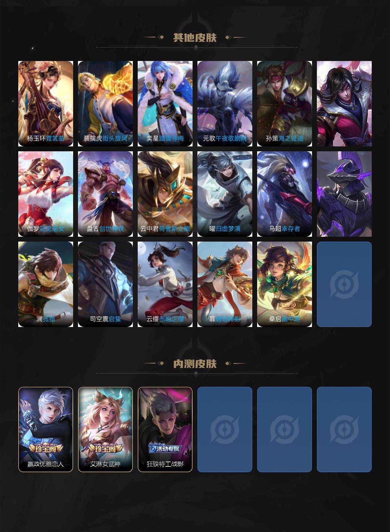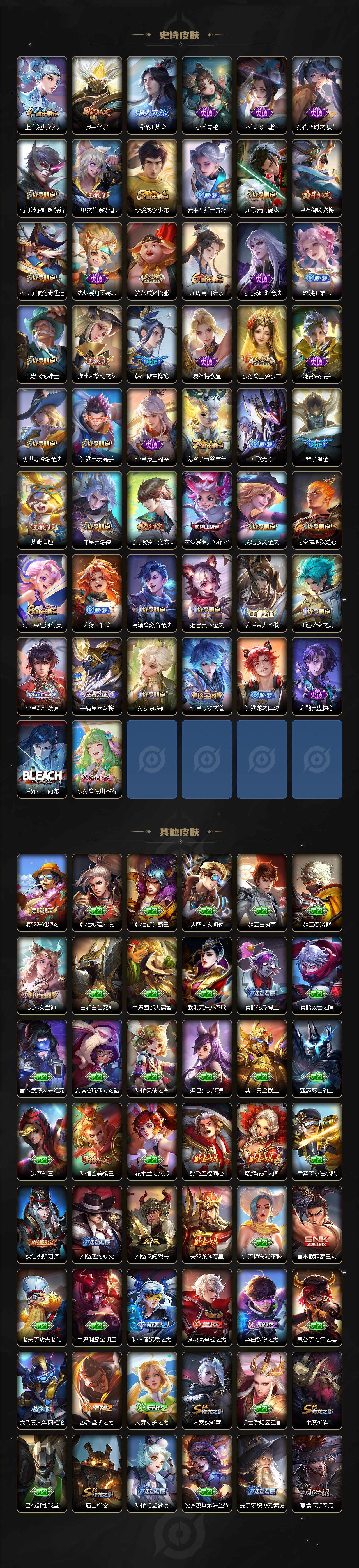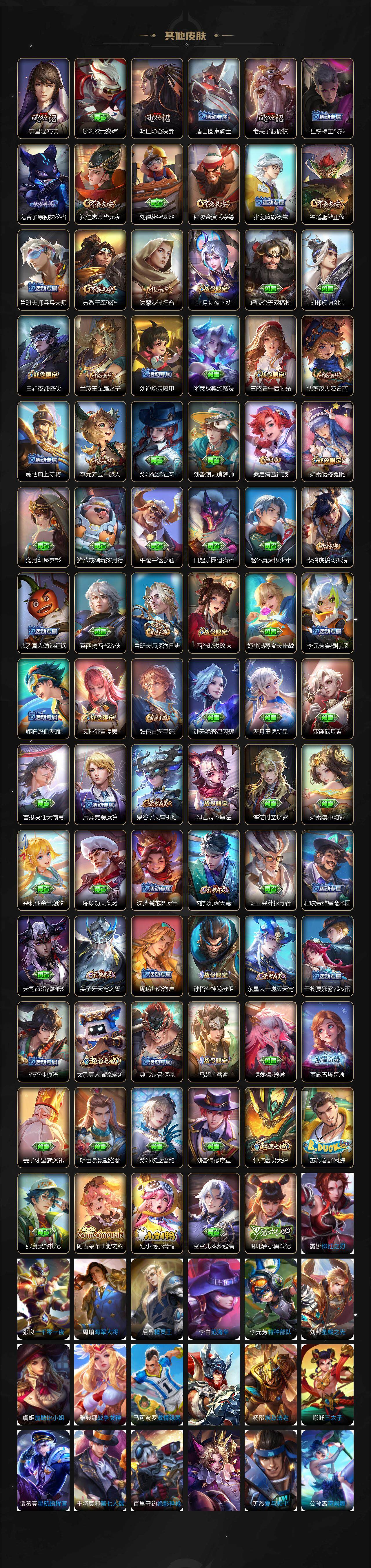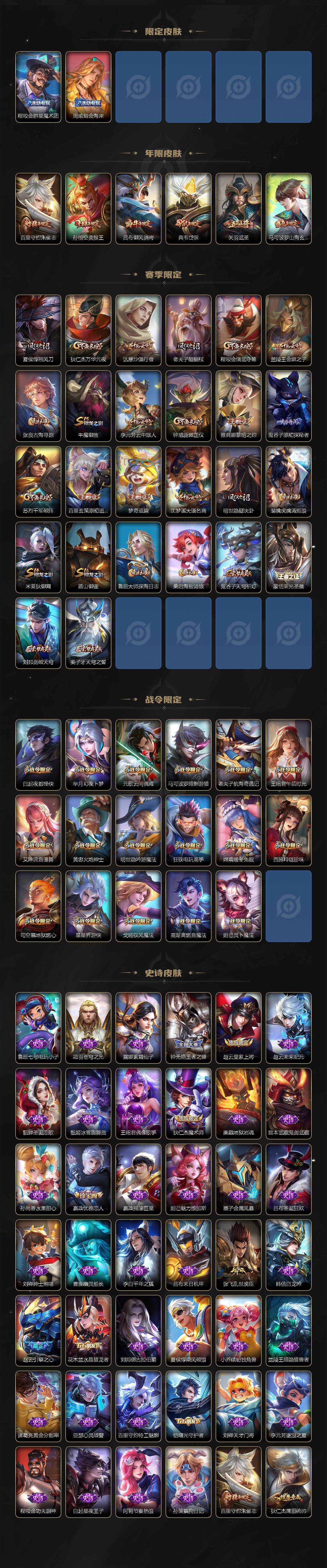 【限定皮肤】:姜子牙天穹之誓,狄仁杰阴阳师,赵云皇家上将,赵云引擎之心,墨子降魔,嬴政优雅恋人,庄周高山流水,钟无艳王者之锤,白起夜都怪侠,芈月幻夜卜梦,吕布御风骁将,元歌云间偶戏,元歌无心,夏侯惇朔风刀,典韦岱宗,马可波罗暗影游猎,马可波罗山海玄木吟,狄仁杰魔术师,狄仁杰万华元夜,达摩沙漠行僧,项羽海滩派对,老夫子醍醐杖,老夫子航海奇遇记,关羽武圣,程咬金演武夺筹,韩信傲雪梅枪,王昭君午后时光,兰陵王金庭之子,橘右京枫霜尽,孙悟空美猴王,孙悟空齐天大圣,牛魔御旌,后羿如梦令,李元芳云中旅人,虞姬启明星使,钟馗驱傩正仪,雅典娜黎明之约,太乙真人华丽摇滚,鬼谷子原初探秘者,鬼谷子五谷丰年,黄忠火炮绅士,苏烈千军破阵,百里玄策原初追逐者,百里守约朱雀志,弈星混沌棋,梦奇顽趣,公孙离玉兔公主,沈梦溪大漠名商,沈梦溪匿光破解者,明世隐疑决卦,明世隐吟游魔法,裴擒虎李小龙,裴擒虎擒涛扼浪,狂铁电玩高手,米莱狄御霄,云中君纤云弄巧,盾山御銮,猪八戒猪悟能,上官婉儿梁祝,嫦娥拒霜思,嫦娥暖冬兔眠,西施玲珑珍味,鲁班大师探海日志,桑启海盐诗旅,暃星界游侠,戈娅驭风魔法,艾琳女武神,艾琳流音漫舞,司空震地狱燃心,阿古朵江河有灵,张良古海寻踪,蒙犽百解令,蒙恬荣光圣徽,高渐离燃音魔法,妲己灵卜魔法,鬼谷子天穹祈灯,沈梦溪龙舞盛年,刘邦剑破天穹,程咬金群星魔术团,周瑜熔金海岸