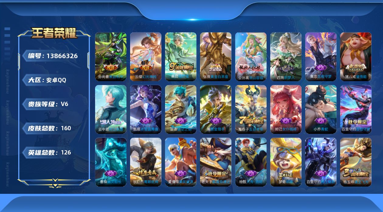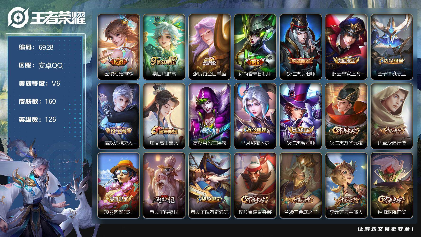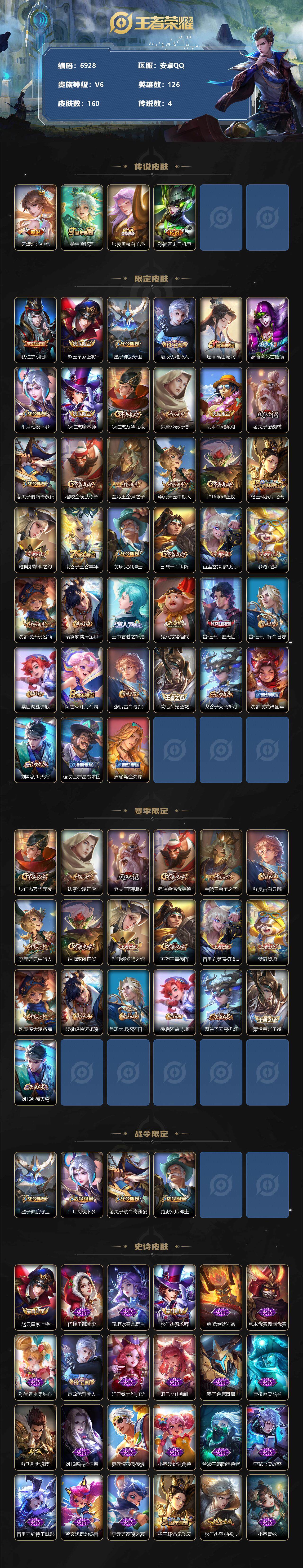 [13866326]安卓Q-V6-永恒钻石I段位-126英雄-160皮肤-0典藏-0珍品无双-0无双-0珍品传说-4传说-45史诗