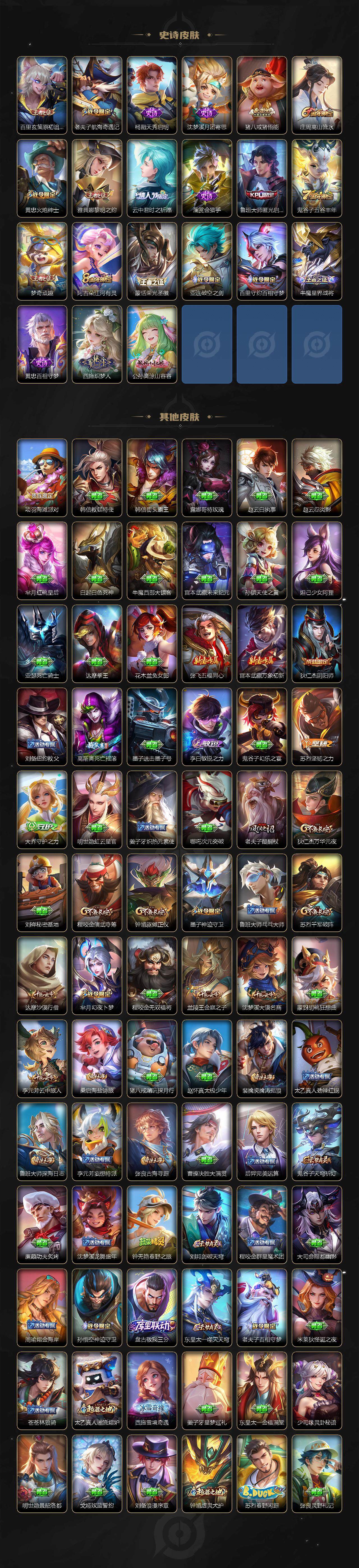【史诗皮肤】:赵云皇家上将,貂蝉圣诞恋歌,甄姬冰雪圆舞曲,狄仁杰魔术师,廉颇地狱岩魂,宫本武藏鬼剑武藏,孙尚香水果甜心,嬴政优雅恋人,妲己魅力维加斯,妲己女仆咖啡,墨子金属风暴,曹操幽灵船长,张飞乱世虎臣,刘邦德古拉伯爵,夏侯惇乘风破浪,小乔缤纷独角兽,兰陵王暗隐猎兽者,亚瑟心灵战警,百里守约特工魅影,蔡文姬舞动绿茵,李元芳逐浪之夏,杨玉环遇见飞天,狄仁杰鹰眼统帅,小乔青蛇,百里玄策原初追逐者,老夫子航海奇遇记,杨戬天秀启明,沈梦溪月团寄思,猪八戒猪悟能,庄周高山流水,黄忠火炮绅士,雅典娜黎明之约,云中君时之祈愿,澜赏金猎手,鲁班大师匿光启智者,鬼谷子五谷丰年,梦奇顽趣,阿古朵江河有灵,蒙恬荣光圣徽,亚连破空之剑,百里守约百相守梦,牛魔星界战将,黄忠百相守梦,西施织梦人,公孙离涂山容容