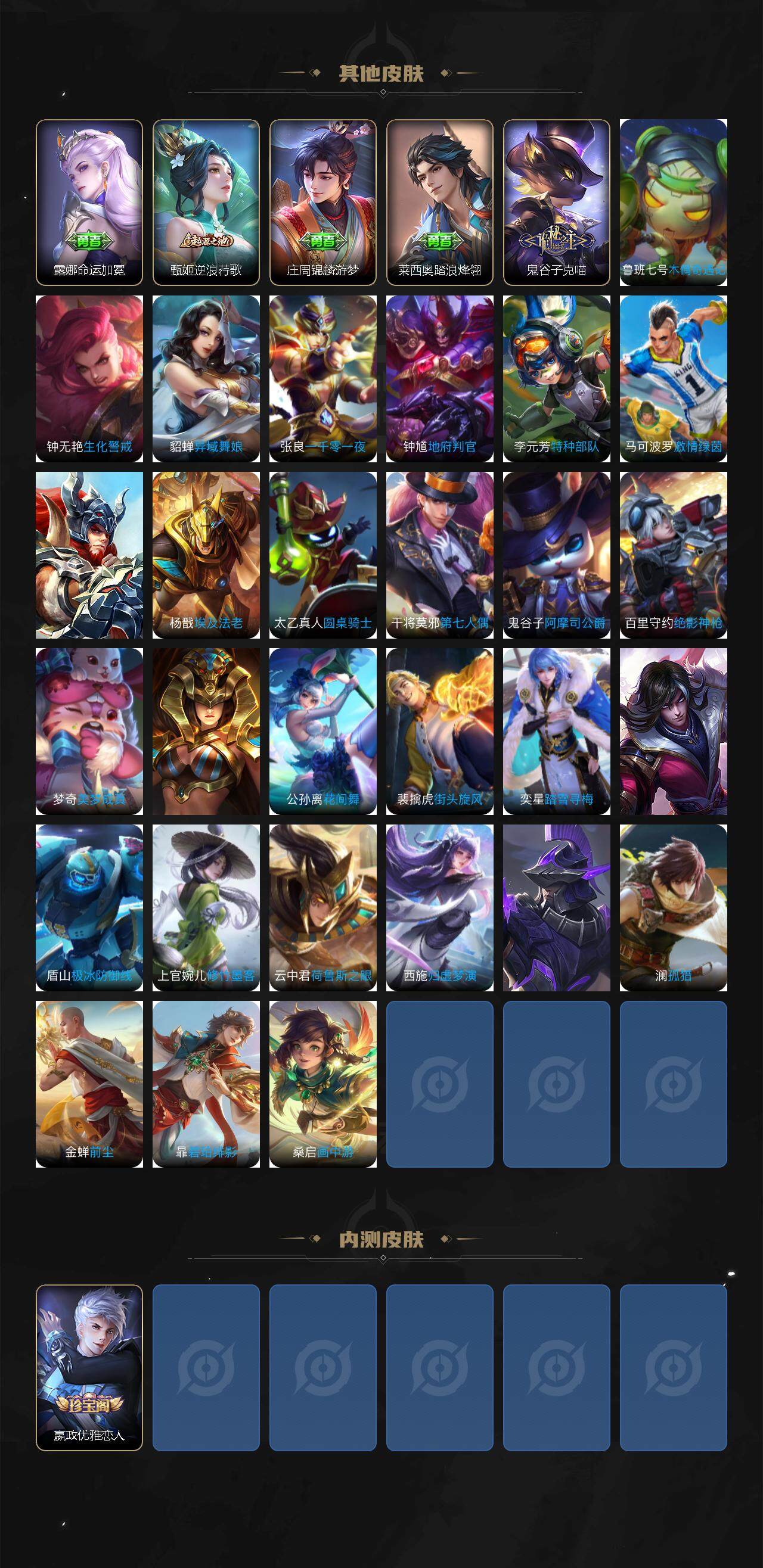 【赛季限定】:狄仁杰万华元夜,达摩沙漠行僧,老夫子醍醐杖,程咬金演武夺筹,兰陵王金庭之子,张良古海寻踪,李元芳云中旅人,钟馗驱傩正仪,雅典娜黎明之约,苏烈千军破阵,百里玄策原初追逐者,梦奇顽趣,沈梦溪大漠名商,裴擒虎擒涛扼浪,鲁班大师探海日志,桑启海盐诗旅,鬼谷子天穹祈灯,蒙恬荣光圣徽,刘邦剑破天穹