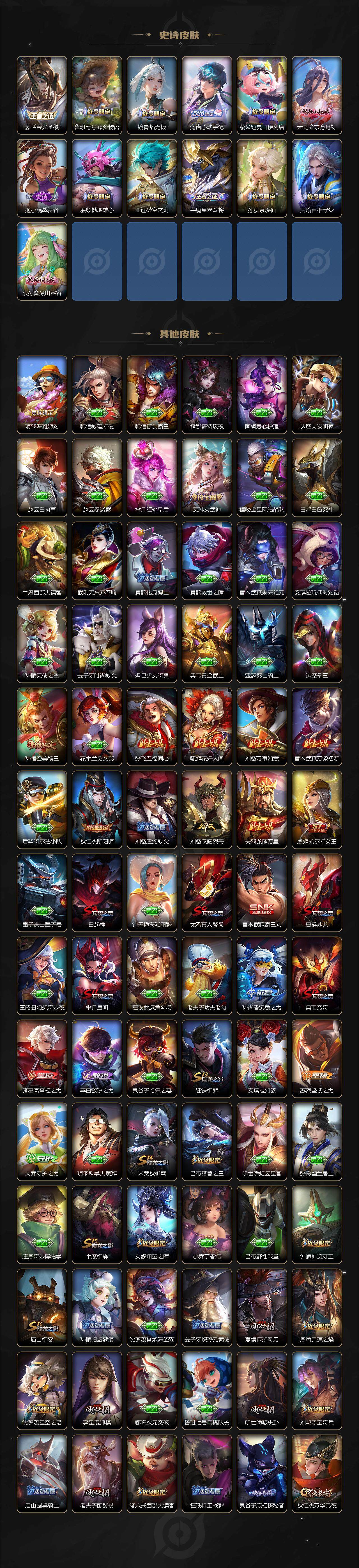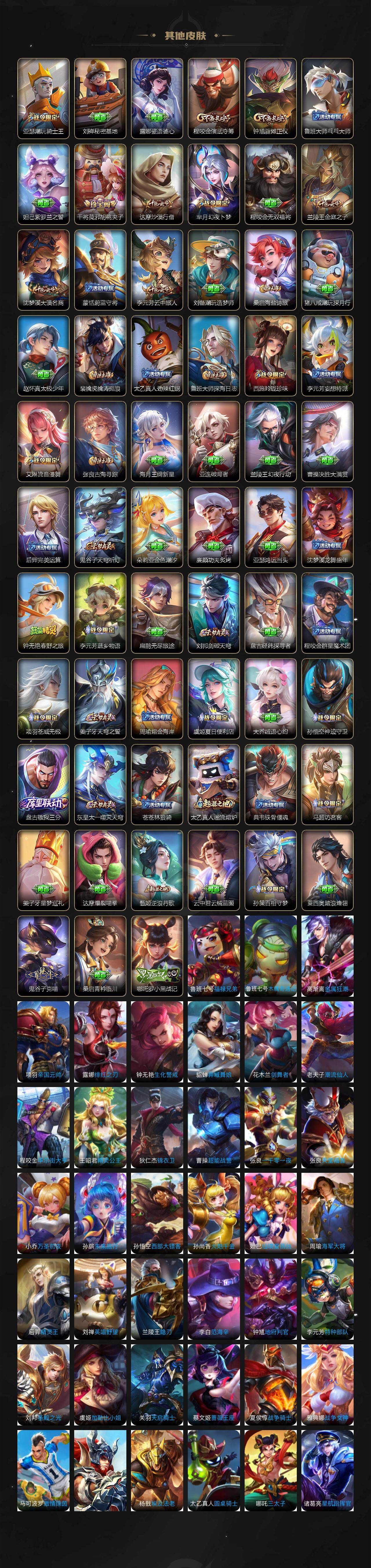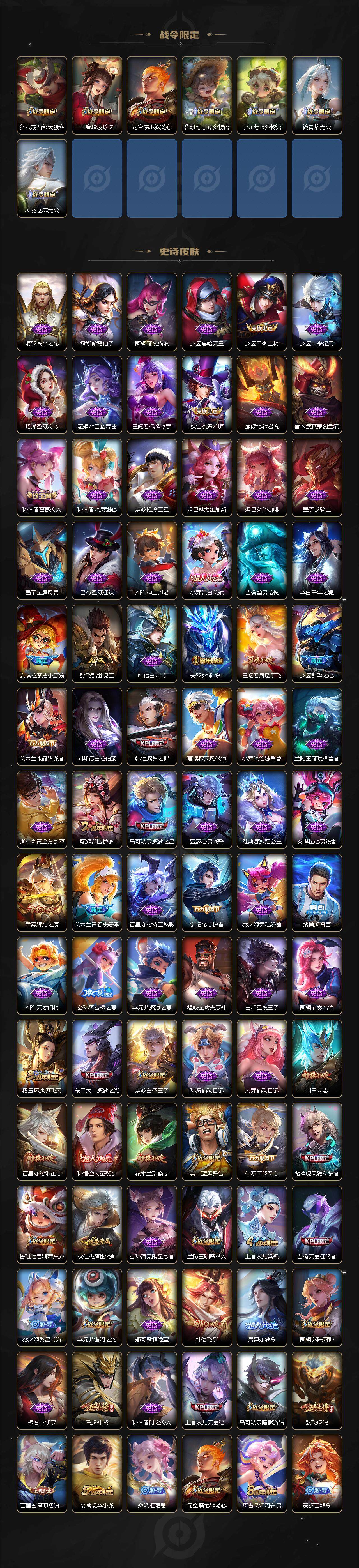【限定皮肤】:白起狰,蔡文姬夏日便利店,大乔绒语心约,虞姬夏日便利店,姜子牙天穹之誓,狄仁杰阴阳师,小乔纯白花嫁,虞姬凯尔特女王,赵云皇家上将,赵云引擎之心,嬴政白昼王子,孙尚香蔷薇恋人,鲁班七号狮舞东方,阿轲迷踪丽影,芈月重明,芈月幻夜卜梦,吕布猎兽之王,周瑜赤莲之焰,夏侯惇朔风刀,甄姬游园惊梦,曹操烛龙,曹操天狼征服者,典韦穷奇,典韦蓝屏警告,马可波罗逐梦之星,马可波罗暗影游猎,狄仁杰魔术师,狄仁杰万华元夜,达摩沙漠行僧,项羽海滩派对,老夫子醍醐杖,关羽冰锋战神,安琪拉魔法小厨娘,程咬金演武夺筹,刘邦夺宝奇兵,韩信逐梦之影,韩信飞衡,王昭君凤凰于飞,兰陵王驯魔猎人,兰陵王金庭之子,花木兰青春决赛季,花木兰瑞麟志,亚瑟潮玩骑士王,孙悟空美猴王,孙悟空大圣娶亲,牛魔御旌,后羿辉光之辰,后羿如梦令,张飞虎魄,李元芳银河之约,李元芳云中旅人,虞姬启明星使,钟馗神迹守卫,钟馗驱傩正仪,杨玉环遇见飞天,杨戬永曜之星,女娲朔望之晖,干将莫邪胡桃夹子,蔡文姬繁星吟游,太乙真人饕餮,东皇太一逐梦之光,鬼谷子原初探秘者,诸葛亮武陵仙君,铠青龙志,百里玄策白虎志,百里玄策原初追逐者,百里守约朱雀志,弈星混沌棋,公孙离蜜橘之夏,沈梦溪星空之诺,沈梦溪大漠名商,明世隐疑决卦,裴擒虎天狼狩猎者,裴擒虎李小龙,裴擒虎擒涛扼浪,狂铁御狮,米莱狄御霄,伽罗太华,盾山御銮,猪八戒西部大镖客,上官婉儿梁祝,上官婉儿天狼绘梦者,嫦娥拒霜思,西施玲珑珍味,鲁班大师探海日志,桑启海盐诗旅,艾琳女武神,艾琳流音漫舞,司空震地狱燃心,阿古朵江河有灵,张良古海寻踪,裴擒虎梅西,蒙犽百解令,蒙恬荣光圣徽,鬼谷子天穹祈灯,沈梦溪龙舞盛年,鲁班七号蔬乡物语,李元芳蔬乡物语,刘邦剑破天穹,程咬金群星魔术团,镜青焰无极,项羽苍威无极,海诺心动手记,周瑜熔金海岸
