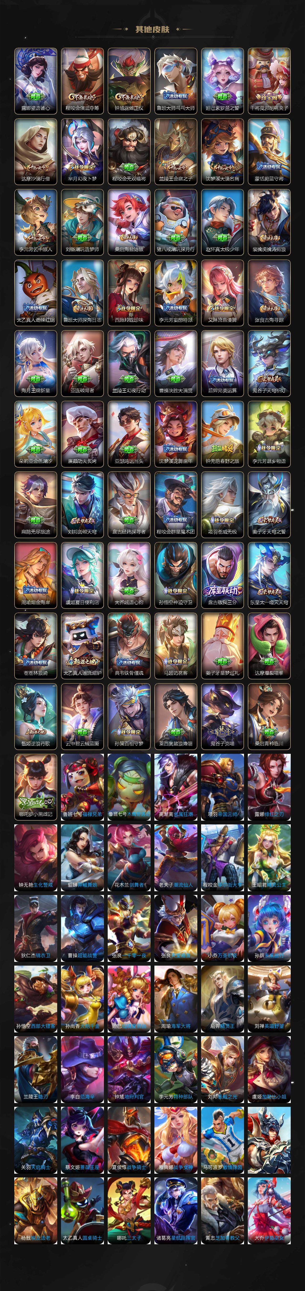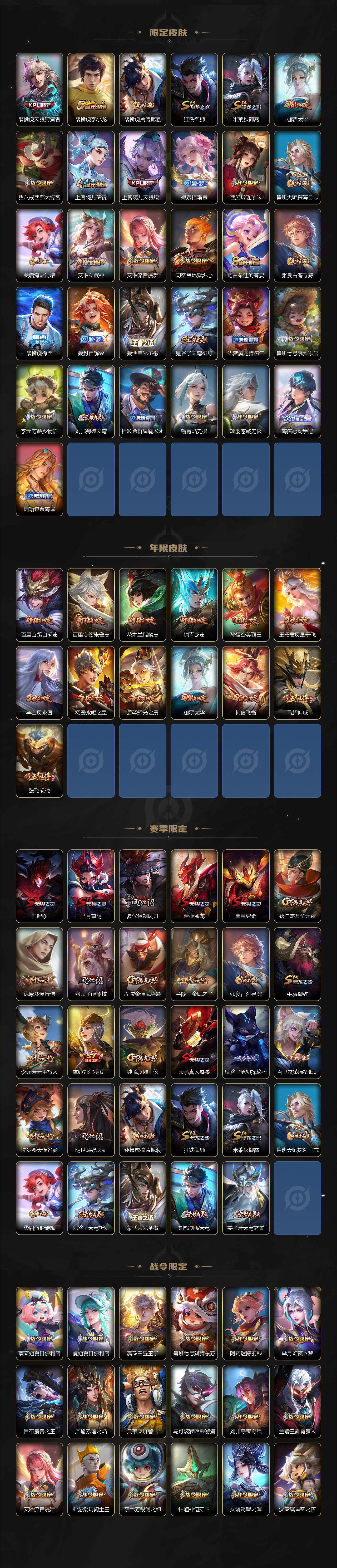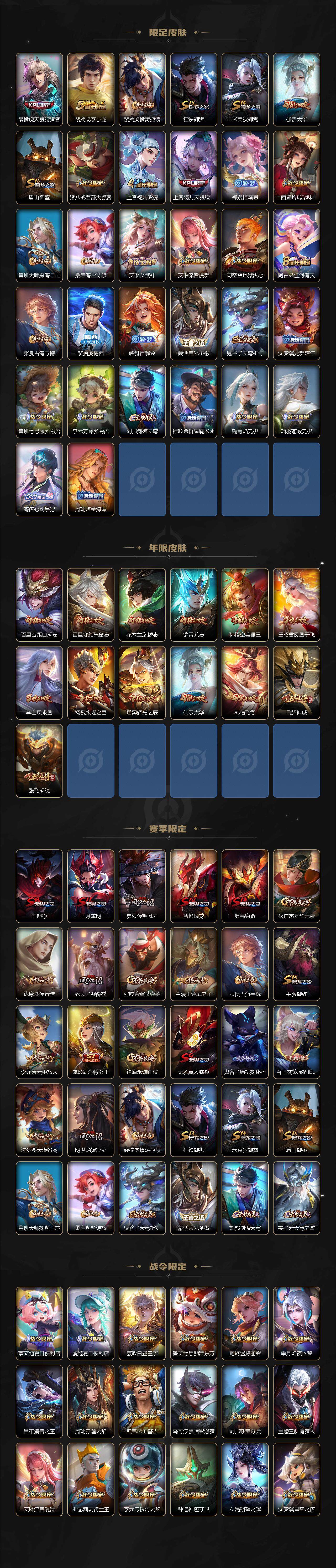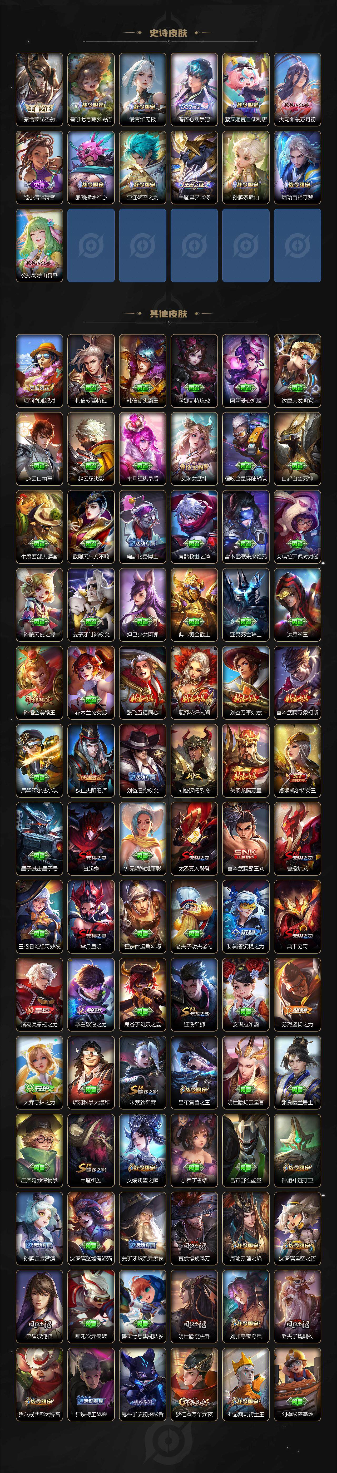 【限定皮肤】:白起狰,蔡文姬夏日便利店,大乔绒语心约,虞姬夏日便利店,姜子牙天穹之誓,狄仁杰阴阳师,小乔纯白花嫁,虞姬凯尔特女王,赵云皇家上将,赵云引擎之心,嬴政白昼王子,孙尚香蔷薇恋人,鲁班七号狮舞东方,阿轲迷踪丽影,芈月重明,芈月幻夜卜梦,吕布猎兽之王,周瑜赤莲之焰,夏侯惇朔风刀,甄姬游园惊梦,曹操烛龙,曹操天狼征服者,典韦穷奇,典韦蓝屏警告,马可波罗逐梦之星,马可波罗暗影游猎,狄仁杰魔术师,狄仁杰万华元夜,达摩沙漠行僧,项羽海滩派对,老夫子醍醐杖,关羽冰锋战神,安琪拉魔法小厨娘,程咬金演武夺筹,刘邦夺宝奇兵,韩信逐梦之影,韩信飞衡,王昭君凤凰于飞,兰陵王驯魔猎人,兰陵王金庭之子,花木兰青春决赛季,花木兰瑞麟志,亚瑟潮玩骑士王,孙悟空美猴王,孙悟空大圣娶亲,牛魔御旌,后羿辉光之辰,后羿如梦令,张飞虎魄,李元芳银河之约,李元芳云中旅人,虞姬启明星使,钟馗神迹守卫,钟馗驱傩正仪,杨玉环遇见飞天,杨戬永曜之星,女娲朔望之晖,干将莫邪胡桃夹子,蔡文姬繁星吟游,太乙真人饕餮,东皇太一逐梦之光,鬼谷子原初探秘者,诸葛亮武陵仙君,铠青龙志,百里玄策白虎志,百里玄策原初追逐者,百里守约朱雀志,弈星混沌棋,公孙离蜜橘之夏,沈梦溪星空之诺,沈梦溪大漠名商,明世隐疑决卦,裴擒虎天狼狩猎者,裴擒虎李小龙,裴擒虎擒涛扼浪,狂铁御狮,米莱狄御霄,伽罗太华,盾山御銮,猪八戒西部大镖客,上官婉儿梁祝,上官婉儿天狼绘梦者,嫦娥拒霜思,西施玲珑珍味,鲁班大师探海日志,桑启海盐诗旅,艾琳女武神,艾琳流音漫舞,司空震地狱燃心,阿古朵江河有灵,张良古海寻踪,裴擒虎梅西,蒙犽百解令,蒙恬荣光圣徽,鬼谷子天穹祈灯,沈梦溪龙舞盛年,鲁班七号蔬乡物语,李元芳蔬乡物语,刘邦剑破天穹,程咬金群星魔术团,镜青焰无极,项羽苍威无极,海诺心动手记,周瑜熔金海岸