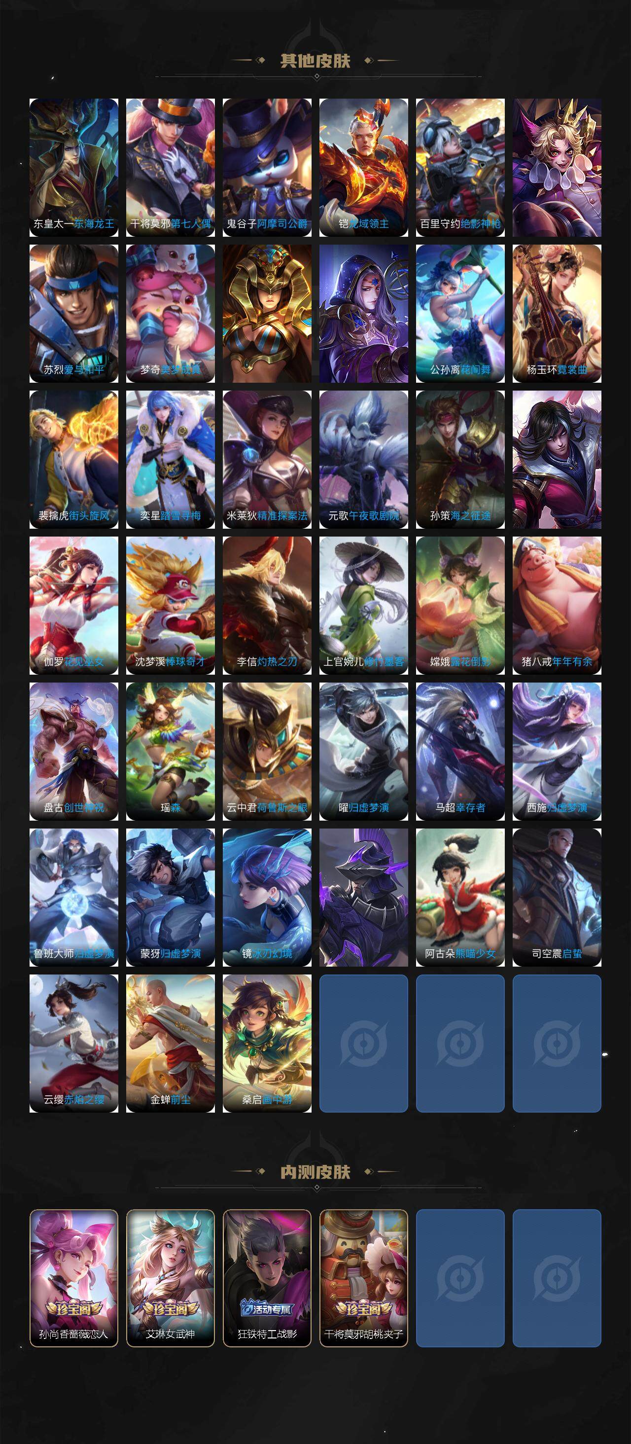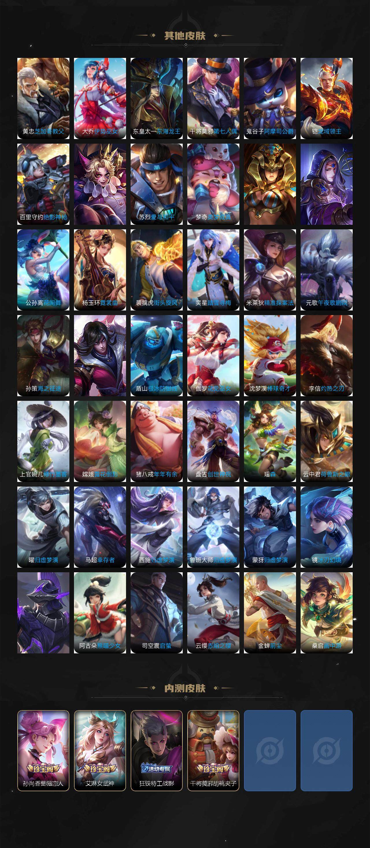 虞姬凯尔特女王,白起狰,太乙真人饕餮,曹操烛龙,芈月重明,典韦穷奇,狂铁御狮,米莱狄御霄,牛魔御旌,盾山御銮,夏侯惇朔风刀,明世隐疑决卦,老夫子醍醐杖,鬼谷子原初探秘者,狄仁杰万华元夜,程咬金演武夺筹,钟馗驱傩正仪,吕布猎兽之王,嬴政白昼王子,女娲朔望之晖,典韦蓝屏警告,钟馗神迹守卫,鲁班七号狮舞东方,沈梦溪星空之诺,李元芳银河之约,刘邦夺宝奇兵,马可波罗暗影游猎,弈星混沌棋,达摩沙漠行僧,兰陵王金庭之子,沈梦溪大漠名商,李元芳云中旅人,桑启海盐诗旅,裴擒虎擒涛扼浪,鲁班大师探海日志,张良古海寻踪,项羽苍威无极,镜青焰无极