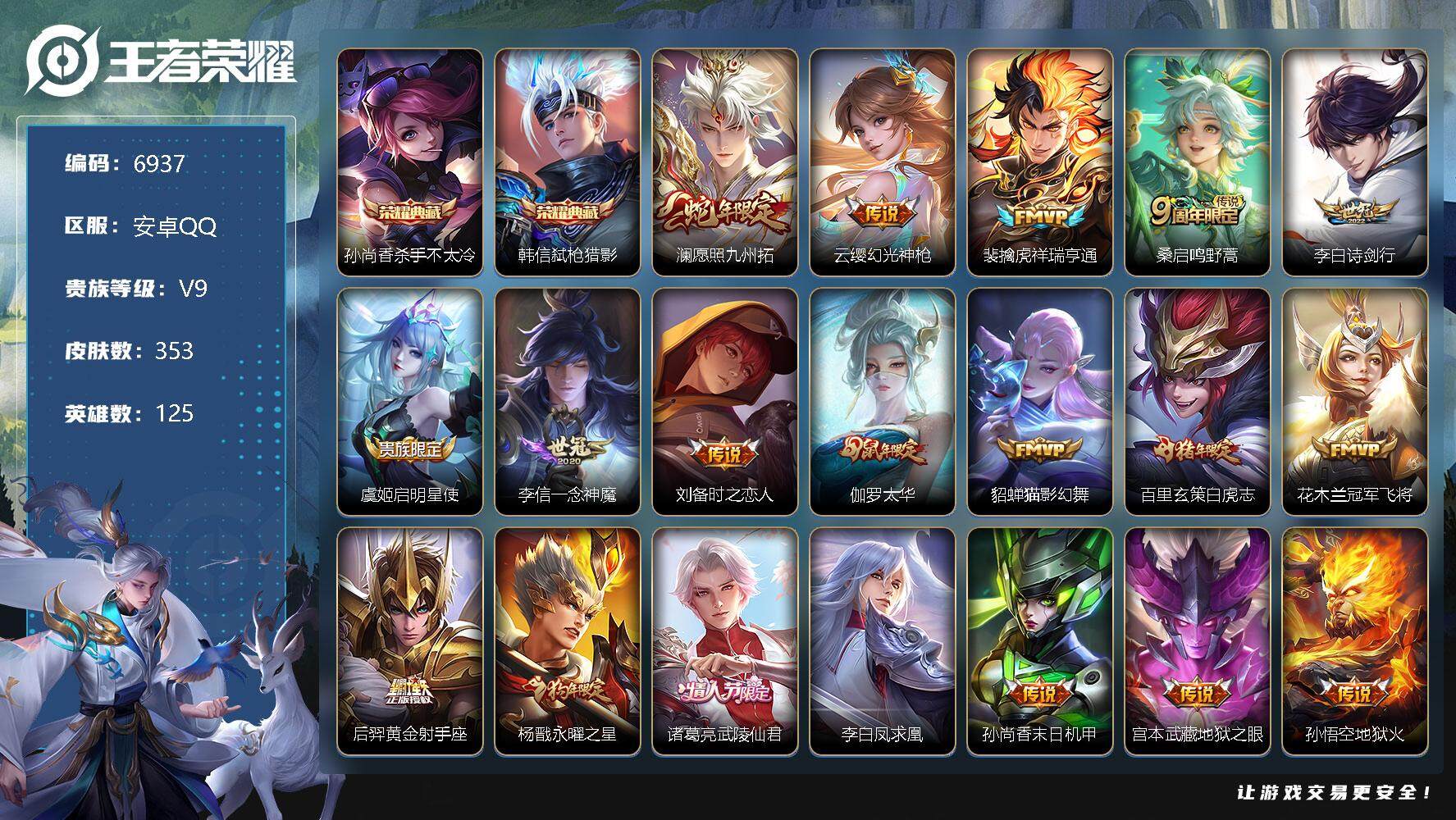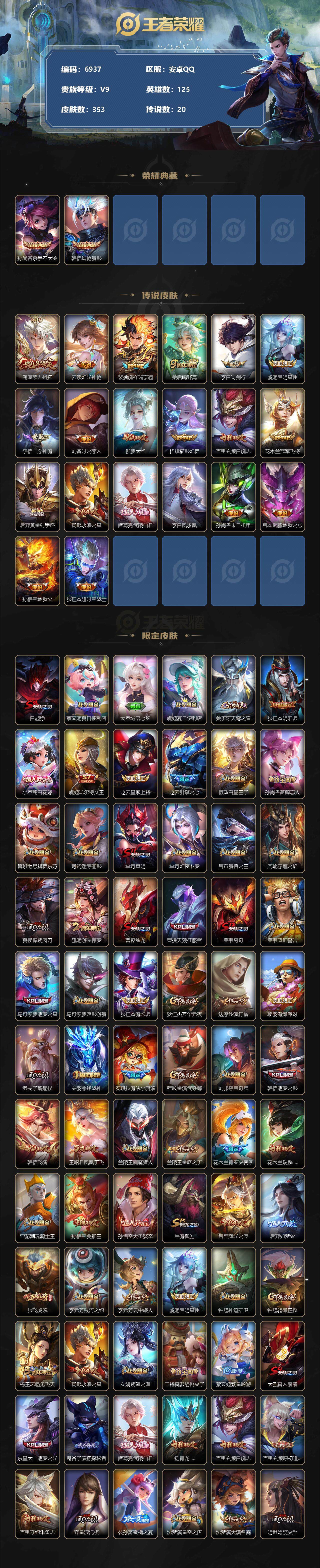 [13866349]安卓Q-V9-至尊星耀IV段位-125英雄-353皮肤-2典藏-0珍品无双-0无双-0珍品传说-20传说-103史诗 【荣耀典藏】:孙尚香杀手不太冷,韩信弑枪猎影 【传说皮肤】:澜愿照九州拓,云缨幻光神枪,裴擒虎祥瑞亨通,桑启鸣野蒿,李白诗剑行,虞姬启明星使,李信一念神魔,刘备时之恋人,伽罗太华,貂蝉猫影幻舞,百里玄策白虎志,花木兰冠军飞将,后羿黄金射手座,杨戬永曜之星,诸葛亮武陵仙君,李白凤求凰,孙尚香末日机甲,宫本武藏地狱之眼,孙悟空地狱火,狄仁杰超时空战士 【限定皮肤】:白起狰,蔡文姬夏日便利店,大乔绒语心约,虞姬夏日便利店,姜子牙天穹之誓,狄仁杰阴阳师,小乔纯白花嫁,虞姬凯尔特女王,赵云皇家上将,赵云引擎之心,嬴政白昼王子,孙尚香蔷薇恋人,鲁班七号狮舞东方,阿轲迷踪丽影,芈月重明,芈月幻夜卜梦,吕布猎兽之王,周瑜赤莲之焰,夏侯惇朔风刀,甄姬游园惊梦,曹操烛龙,曹操天狼征服者,典韦穷奇,典韦蓝屏警告,马可波罗逐梦之星,马可波罗暗影游猎,狄仁杰魔术师,狄仁杰万华元夜,达摩沙漠行僧,项羽海滩派对,老夫子醍醐杖,关羽冰锋战神,安琪拉魔法小厨娘,程咬金演武夺筹,刘邦夺宝奇兵,韩信逐梦之影,韩信飞衡,王昭君凤凰于飞,兰陵王驯魔猎人,兰陵王金庭之子,花木兰青春决赛季,花木兰瑞麟志,亚瑟潮玩骑士王,孙悟空美猴王,孙悟空大圣娶亲,牛魔御旌,后羿辉光之辰,后羿如梦令,张飞虎魄,李元芳银河之约,李元芳云中旅人,虞姬启明星使,钟馗神迹守卫,钟馗驱傩正仪,杨玉环遇见飞天,杨戬永曜之星,女娲朔望之晖,干将莫邪胡桃夹子,蔡文姬繁星吟游,太乙真人饕餮,东皇太一逐梦之光,鬼谷子原初探秘者,诸葛亮武陵仙君,铠青龙志,百里玄策白虎志,百里玄策原初追逐者,百里守约朱雀志,弈星混沌棋,公孙离蜜橘之夏,沈梦溪星空之诺,沈梦溪大漠名商,明世隐疑决卦,裴擒虎天狼狩猎者,裴擒虎李小龙,裴擒虎擒涛扼浪,狂铁御狮,米莱狄御霄,伽罗太华,盾山御銮,猪八戒西部大镖客,上官婉儿梁祝,上官婉儿天狼绘梦者,嫦娥拒霜思,西施玲珑珍味,鲁班大师探海日志,桑启海盐诗旅,艾琳女武神,艾琳流音漫舞,司空震地狱燃心,阿古朵江河有灵,张良古海寻踪,裴擒虎梅西,蒙犽百解令,蒙恬荣光圣徽,鬼谷子天穹祈灯,沈梦溪龙舞盛年,鲁班七号蔬乡物语,李元芳蔬乡物语,刘邦剑破天穹,程咬金群星魔术团,镜青焰无极,项羽苍威无极,海诺心动手记,周瑜熔金海岸