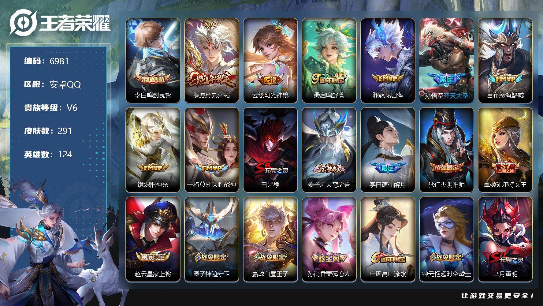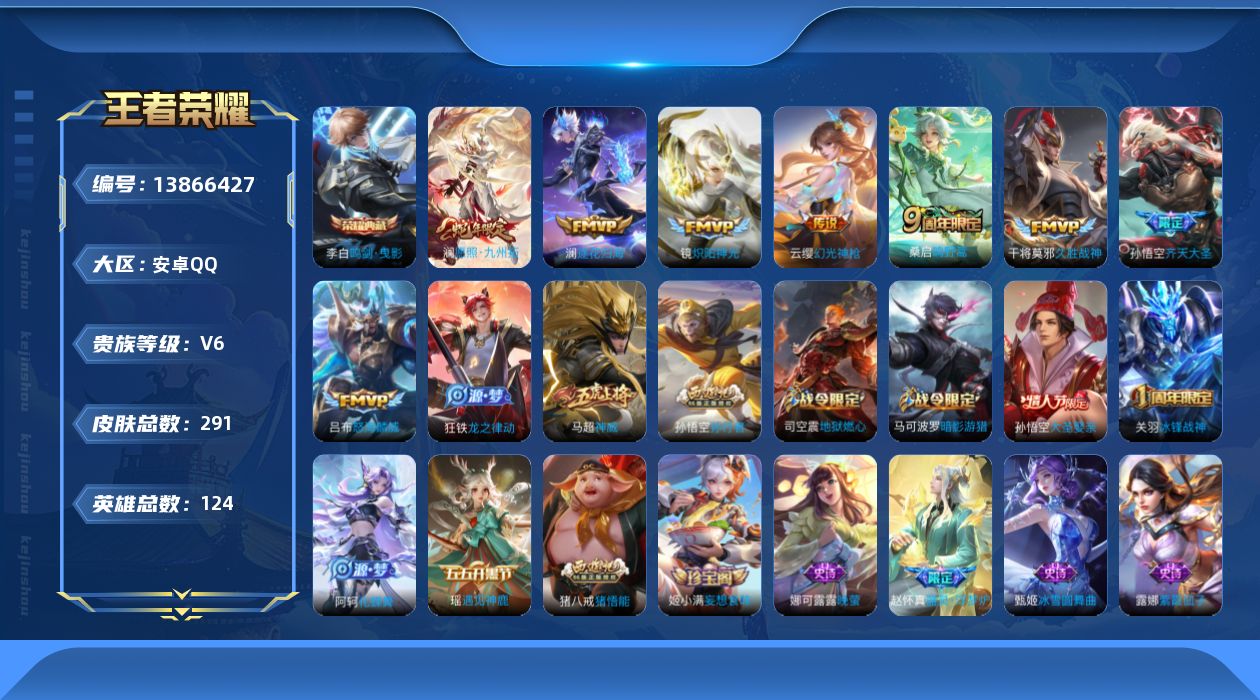 [13866427]安卓Q-V6-至尊星耀IV段位-124英雄-291皮肤-1典藏-0珍品无双-0无双-0珍品传说-8传说-79史诗