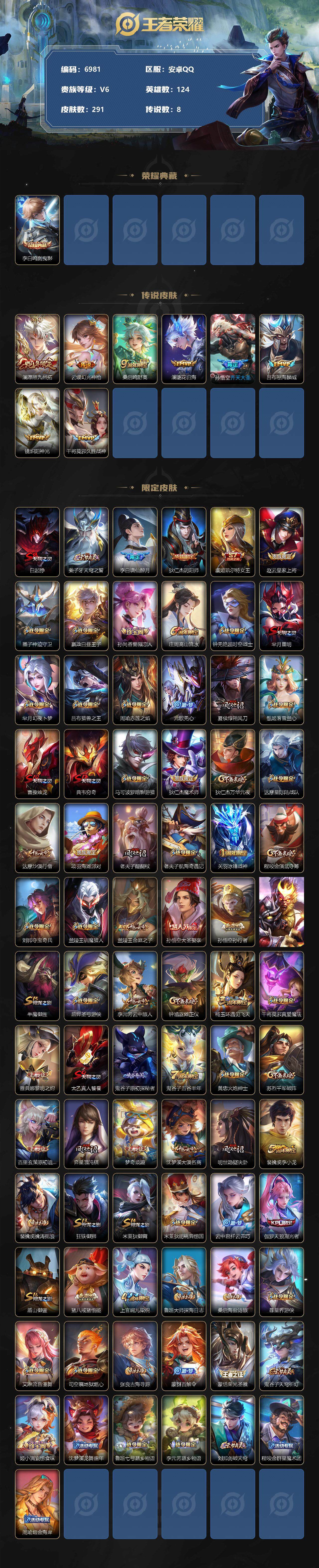 [13866427]安卓Q-V6-至尊星耀IV段位-124英雄-291皮肤-1典藏-0珍品无双-0无双-0珍品传说-8传说-79史诗 【荣耀典藏】:李白鸣剑曳影 【传说皮肤】:澜愿照九州拓,云缨幻光神枪,桑启鸣野蒿,澜逐花归海,孙悟空齐天大圣,吕布怒海麟威,镜炽阳神光,干将莫邪久胜战神 【限定皮肤】:白起狰,姜子牙天穹之誓,李白谪仙醉月,狄仁杰阴阳师,虞姬凯尔特女王,赵云皇家上将,墨子神迹守卫,嬴政白昼王子,孙尚香蔷薇恋人,庄周高山流水,钟无艳超时空战士,芈月重明,芈月幻夜卜梦,吕布猎兽之王,周瑜赤莲之焰,元歌无心,夏侯惇朔风刀,甄姬落雪兰心,曹操烛龙,典韦穷奇,马可波罗暗影游猎,狄仁杰魔术师,狄仁杰万华元夜,达摩星际陆战队,达摩沙漠行僧,项羽海滩派对,老夫子醍醐杖,老夫子航海奇遇记,关羽冰锋战神,程咬金演武夺筹,刘邦夺宝奇兵,兰陵王驯魔猎人,兰陵王金庭之子,孙悟空大圣娶亲,孙悟空孙行者,孙悟空齐天大圣,牛魔御旌,后羿圣弓游侠,李元芳云中旅人,钟馗驱傩正仪,杨玉环遇见飞天,干将莫邪真爱魔法,雅典娜黎明之约,太乙真人饕餮,鬼谷子原初探秘者,鬼谷子五谷丰年,黄忠火炮绅士,苏烈千军破阵,百里玄策原初追逐者,弈星混沌棋,梦奇顽趣,沈梦溪大漠名商,明世隐疑决卦,裴擒虎李小龙,裴擒虎擒涛扼浪,狂铁御狮,米莱狄御霄,米莱狄胡桃异想国,云中君纤云弄巧,伽罗天狼溯光者,盾山御銮,猪八戒猪悟能,上官婉儿梁祝,鲁班大师探海日志,桑启海盐诗旅,暃星界游侠,艾琳流音漫舞,司空震地狱燃心,张良古海寻踪,蒙犽百解令,蒙恬荣光圣徽,鬼谷子天穹祈灯,姬小满妄想食味,沈梦溪龙舞盛年,鲁班七号蔬乡物语,李元芳蔬乡物语,刘邦剑破天穹,程咬金群星魔术团,周瑜熔金海岸 【年限皮肤】:马超神威 【赛季限定】:白起狰,芈月重明,夏侯惇朔风刀,曹操烛龙,典韦穷奇,狄仁杰万华元夜,达摩沙漠行僧,老夫子醍醐杖,程咬金演武夺筹,兰陵王金庭之子,张良古海寻踪,牛魔御旌,李元芳云中旅人,虞姬凯尔特女王,钟馗驱傩正仪,雅典娜黎明之约,太乙真人饕餮,鬼谷子原初探秘者,苏烈千军破阵,百里玄策原初追逐者,弈星混沌棋,梦奇顽趣,沈梦溪大漠名商,明世隐疑决卦,裴擒虎擒涛扼浪,狂铁御狮,米莱狄御霄,盾山御銮,鲁班大师探海日志,桑启海盐诗旅,鬼谷子天穹祈灯,蒙恬荣光圣徽,刘邦剑破天穹,姜子牙天穹之誓 【战令限定】:墨子神迹守卫,嬴政白昼王子,钟无艳超时空战士