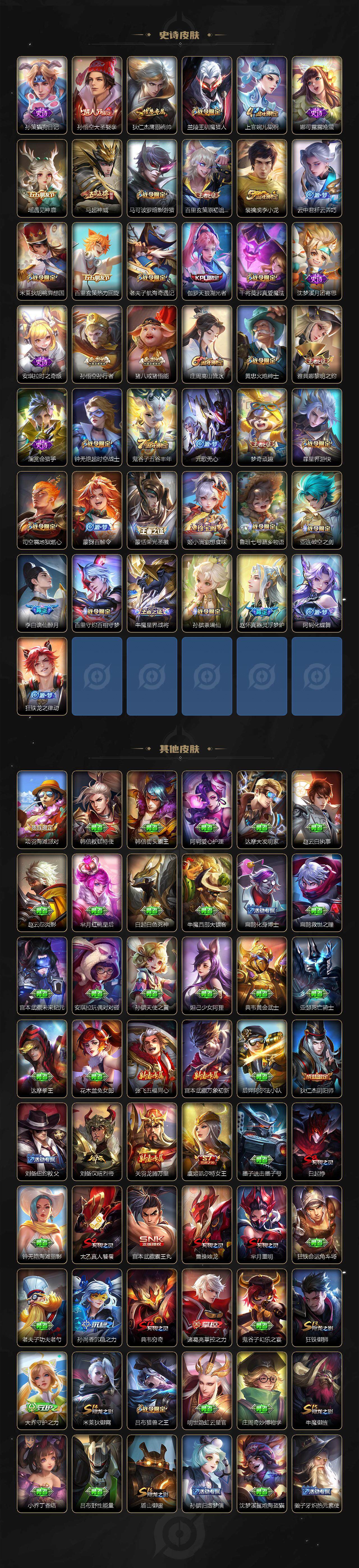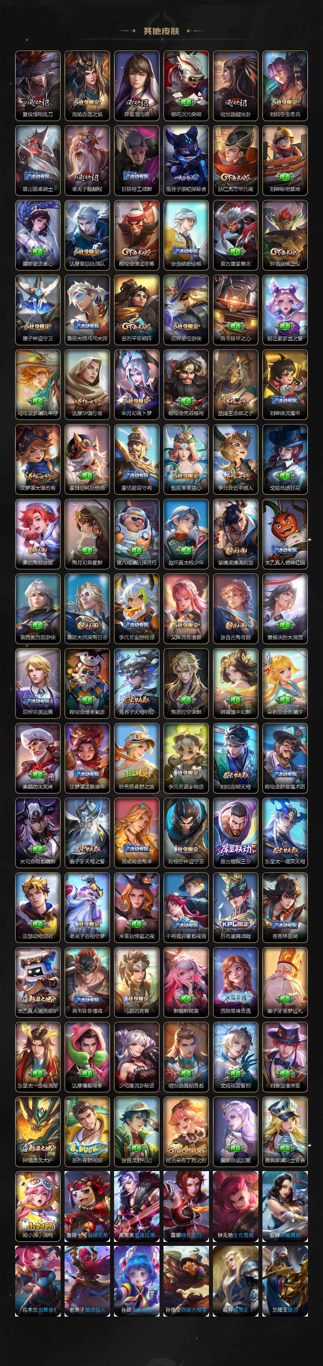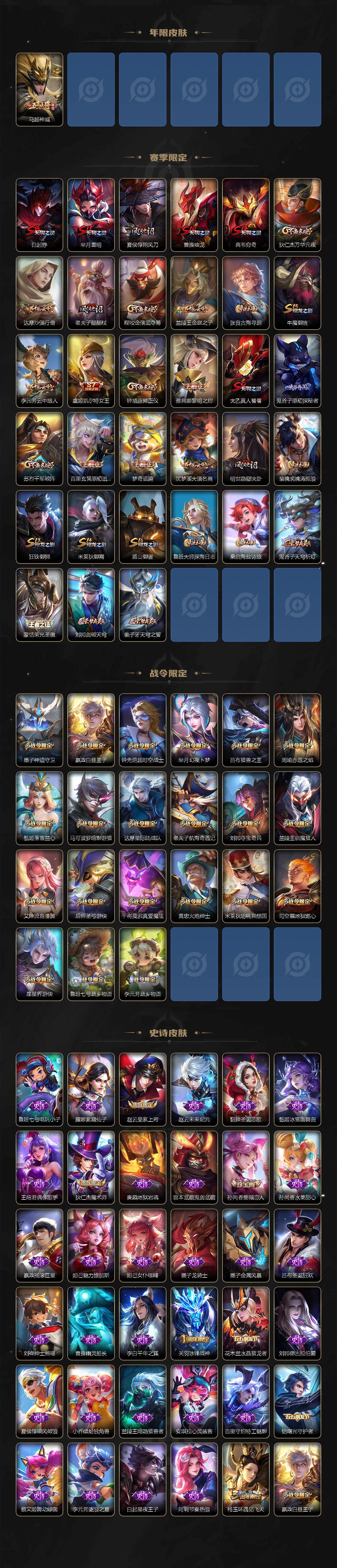 【限定皮肤】:白起狰,姜子牙天穹之誓,李白谪仙醉月,狄仁杰阴阳师,虞姬凯尔特女王,赵云皇家上将,墨子神迹守卫,嬴政白昼王子,孙尚香蔷薇恋人,庄周高山流水,钟无艳超时空战士,芈月重明,芈月幻夜卜梦,吕布猎兽之王,周瑜赤莲之焰,元歌无心,夏侯惇朔风刀,甄姬落雪兰心,曹操烛龙,典韦穷奇,马可波罗暗影游猎,狄仁杰魔术师,狄仁杰万华元夜,达摩星际陆战队,达摩沙漠行僧,项羽海滩派对,老夫子醍醐杖,老夫子航海奇遇记,关羽冰锋战神,程咬金演武夺筹,刘邦夺宝奇兵,兰陵王驯魔猎人,兰陵王金庭之子,孙悟空大圣娶亲,孙悟空孙行者,孙悟空齐天大圣,牛魔御旌,后羿圣弓游侠,李元芳云中旅人,钟馗驱傩正仪,杨玉环遇见飞天,干将莫邪真爱魔法,雅典娜黎明之约,太乙真人饕餮,鬼谷子原初探秘者,鬼谷子五谷丰年,黄忠火炮绅士,苏烈千军破阵,百里玄策原初追逐者,弈星混沌棋,梦奇顽趣,沈梦溪大漠名商,明世隐疑决卦,裴擒虎李小龙,裴擒虎擒涛扼浪,狂铁御狮,米莱狄御霄,米莱狄胡桃异想国,云中君纤云弄巧,伽罗天狼溯光者,盾山御銮,猪八戒猪悟能,上官婉儿梁祝,鲁班大师探海日志,桑启海盐诗旅,暃星界游侠,艾琳流音漫舞,司空震地狱燃心,张良古海寻踪,蒙犽百解令,蒙恬荣光圣徽,鬼谷子天穹祈灯,姬小满妄想食味,沈梦溪龙舞盛年,鲁班七号蔬乡物语,李元芳蔬乡物语,刘邦剑破天穹,程咬金群星魔术团,周瑜熔金海岸