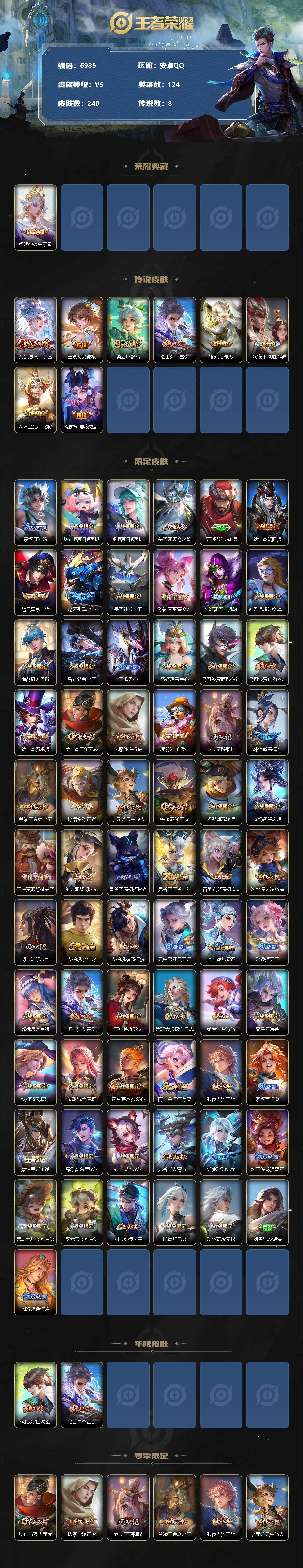 - [12258425]V8 1典藏 10传说 124英雄 260皮肤 可修改实名 优质装备:鸣剑·曳影,云鹰飞将(小将军),久胜战神,炽阳神光,地狱之眼,超时空战士-狄仁杰,无双飞将,琥珀纪元马超,涂山容容 珍宝阁皮:蔷薇恋人,玩趣恶龙 限定皮:鸣野蒿,至尊宝,飞衡(韩信年限),匿光决锋者,五谷丰年,梁祝,御风骁将(吕布年限),孙行者,寅虎·赤拳(老虎年限),山海·玄木吟(马可年限) 史诗皮:赞萌露比,龙之律动,百相守梦-黄忠,东方月初,决胜骁骑,蔬乡物语(鲁班七号),遇见神鹿,紫霞仙子,黄金分割率,特工魅影,千年之狐,永昼,冰冠公主,江河有灵,青蛇,百解令(蒙犽),高渐离燃音魔法,电玩·爆裂旋风,晚萤,偶像歌手,匿光破解者,末日机甲-吕布,猫狗日记-孙策,猫狗日记-大乔,乱世虎臣,节奏热浪,修罗,女仆咖啡,水果甜心,绅士熊喵,星夜王子,功夫厨神,德古拉伯爵,暗隐猎兽者,幽灵船长,鬼剑武藏,心灵战警,舞动绿茵,地狱岩魂,诗语江南,拒霜思,缤纷独角兽,逐浪之夏,水晶猎龙者,曙光守护者,热力回旋,箭羽风息,唤灵魅影,金属风暴,圣诞狂欢,鹰眼统帅,魅力维加斯,赏金猎手,无心,未来纪元-赵云