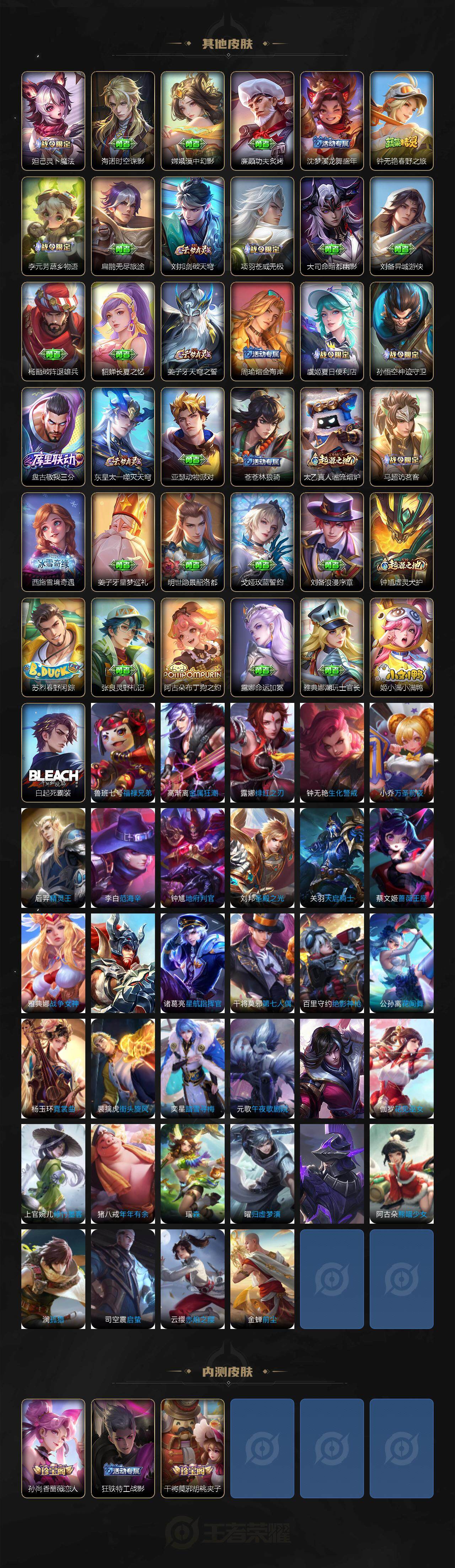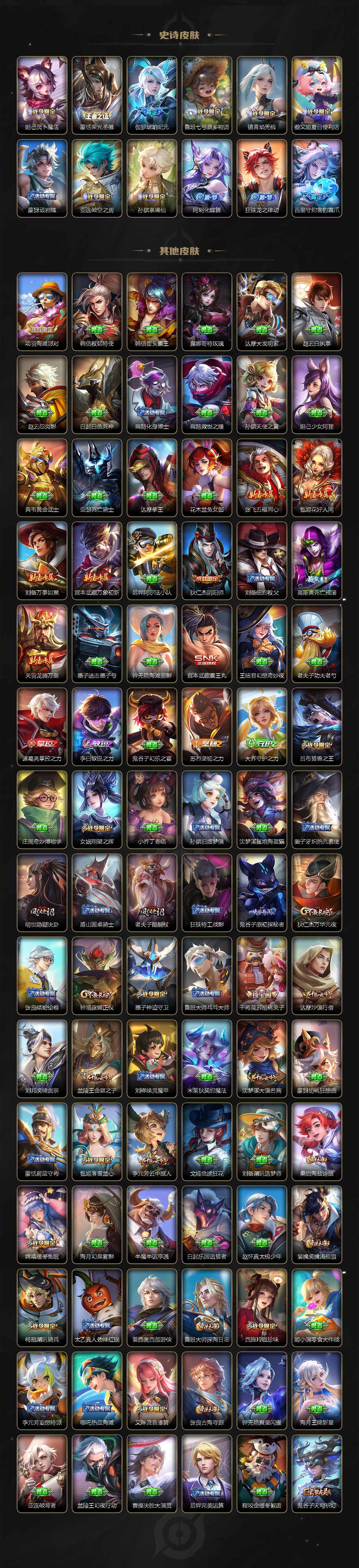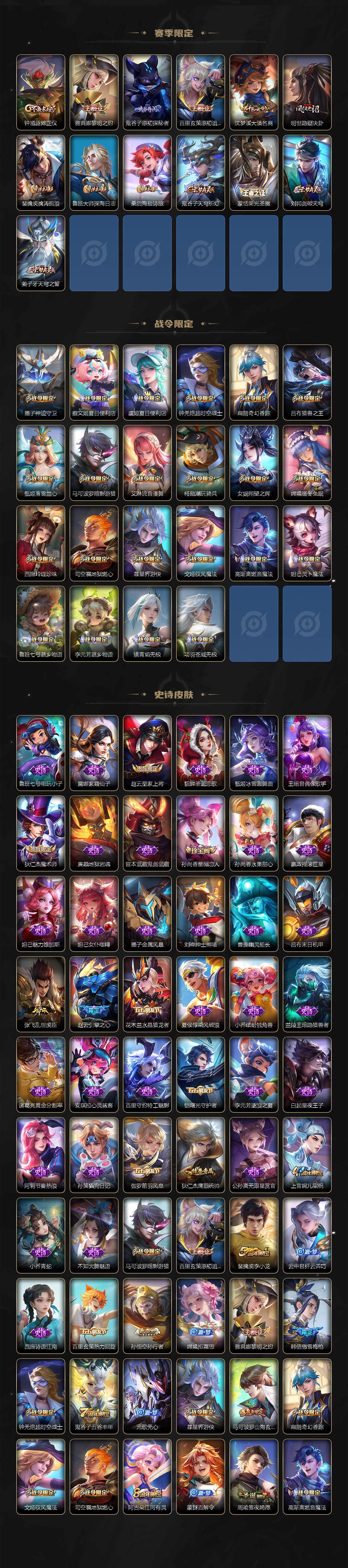【限定皮肤】:蒙犽顽岩魄,蔡文姬夏日便利店,虞姬夏日便利店,姜子牙天穹之誓,杨戬破阵退雄兵,狄仁杰阴阳师,赵云皇家上将,赵云引擎之心,墨子神迹守卫,孙尚香蔷薇恋人,高渐离死亡摇滚,钟无艳超时空战士,扁鹊奇幻香踪,吕布猎兽之王,元歌无心,甄姬落雪兰心,马可波罗暗影游猎,马可波罗山海玄木吟,狄仁杰魔术师,狄仁杰万华元夜,达摩沙漠行僧,项羽海滩派对,老夫子醍醐杖,韩信傲雪梅枪,兰陵王金庭之子,孙悟空孙行者,李元芳云中旅人,钟馗驱傩正仪,杨戬潮玩骑兵,女娲朔望之晖,干将莫邪胡桃夹子,雅典娜黎明之约,鬼谷子原初探秘者,鬼谷子五谷丰年,百里玄策原初追逐者,沈梦溪大漠名商,明世隐疑决卦,裴擒虎李小龙,裴擒虎擒涛扼浪,云中君纤云弄巧,上官婉儿梁祝,嫦娥拒霜思,嫦娥暖冬兔眠,曜山海苍雷引,西施玲珑珍味,鲁班大师探海日志,桑启海盐诗旅,暃星界游侠,戈娅驭风魔法,艾琳流音漫舞,司空震地狱燃心,阿古朵江河有灵,张良古海寻踪,蒙犽百解令,蒙恬荣光圣徽,高渐离燃音魔法,妲己灵卜魔法,鬼谷子天穹祈灯,伽罗琥珀纪元,沈梦溪龙舞盛年,鲁班七号蔬乡物语,李元芳蔬乡物语,刘邦剑破天穹,镜青焰无极,项羽苍威无极,刘备异域游侠,周瑜熔金海岸