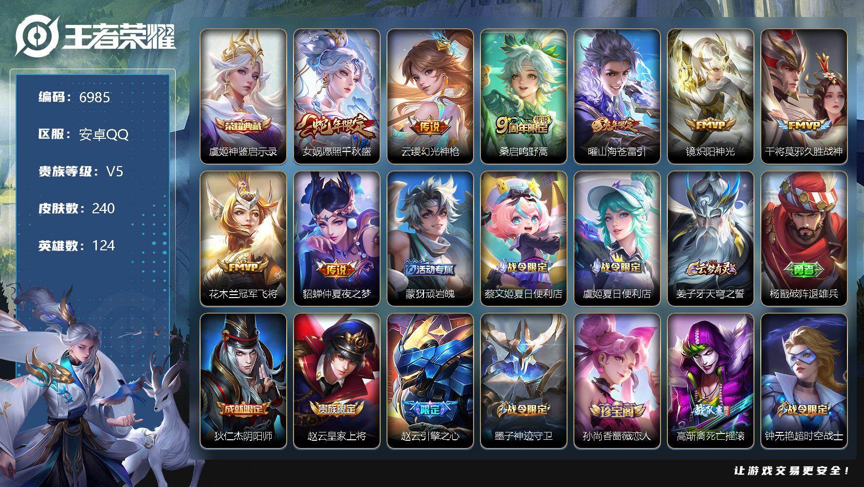 [13866457]安卓Q-V5-至尊星耀III段位-124英雄-240皮肤-1典藏-0珍品无双-0无双-0珍品传说-8传说-71史诗 【荣耀典藏】:虞姬神鉴启示录 【传说皮肤】:女娲愿照千秋盛,云缨幻光神枪,桑启鸣野蒿,曜山海苍雷引,镜炽阳神光,干将莫邪久胜战神,花木兰冠军飞将,貂蝉仲夏夜之梦 【限定皮肤】:蒙犽顽岩魄,蔡文姬夏日便利店,虞姬夏日便利店,姜子牙天穹之誓,杨戬破阵退雄兵,狄仁杰阴阳师,赵云皇家上将,赵云引擎之心,墨子神迹守卫,孙尚香蔷薇恋人,高渐离死亡摇滚,钟无艳超时空战士,扁鹊奇幻香踪,吕布猎兽之王,元歌无心,甄姬落雪兰心,马可波罗暗影游猎,马可波罗山海玄木吟,狄仁杰魔术师,狄仁杰万华元夜,达摩沙漠行僧,项羽海滩派对,老夫子醍醐杖,韩信傲雪梅枪,兰陵王金庭之子,孙悟空孙行者,李元芳云中旅人,钟馗驱傩正仪,杨戬潮玩骑兵,女娲朔望之晖,干将莫邪胡桃夹子,雅典娜黎明之约,鬼谷子原初探秘者,鬼谷子五谷丰年,百里玄策原初追逐者,沈梦溪大漠名商,明世隐疑决卦,裴擒虎李小龙,裴擒虎擒涛扼浪,云中君纤云弄巧,上官婉儿梁祝,嫦娥拒霜思,嫦娥暖冬兔眠,曜山海苍雷引,西施玲珑珍味,鲁班大师探海日志,桑启海盐诗旅,暃星界游侠,戈娅驭风魔法,艾琳流音漫舞,司空震地狱燃心,阿古朵江河有灵,张良古海寻踪,蒙犽百解令,蒙恬荣光圣徽,高渐离燃音魔法,妲己灵卜魔法,鬼谷子天穹祈灯,伽罗琥珀纪元,沈梦溪龙舞盛年,鲁班七号蔬乡物语,李元芳蔬乡物语,刘邦剑破天穹,镜青焰无极,项羽苍威无极,刘备异域游侠,周瑜熔金海岸 【年限皮肤】:马可波罗山海玄木吟,曜山海苍雷引 【赛季限定】:狄仁杰万华元夜,达摩沙漠行僧,老夫子醍醐杖,兰陵王金庭之子,张良古海寻踪,李元芳云中旅人,钟馗驱傩正仪,雅典娜黎明之约,鬼谷子原初探秘者,百里玄策原初追逐者,沈梦溪大漠名商,明世隐疑决卦,裴擒虎擒涛扼浪,鲁班大师探海日志,桑启海盐诗旅,鬼谷子天穹祈灯,蒙恬荣光圣徽,刘邦剑破天穹,姜子牙天穹之誓 【战令限定】:墨子神迹守卫,蔡文姬夏日便利店,虞姬夏日便利店,钟无艳超时空战士,扁鹊奇幻香踪,吕布猎兽之王,甄姬落雪兰心,马可波罗暗影游猎,艾琳流音漫舞,杨戬潮玩骑兵,女娲朔望之晖,嫦娥暖冬兔眠,西施玲珑珍味,司空震地狱燃心,暃星界游侠,戈娅驭风魔法,高渐离燃音魔法,妲己灵卜魔法,鲁班七号蔬乡物语,李元芳蔬乡物语,镜青焰无极,项羽苍威无极 【史