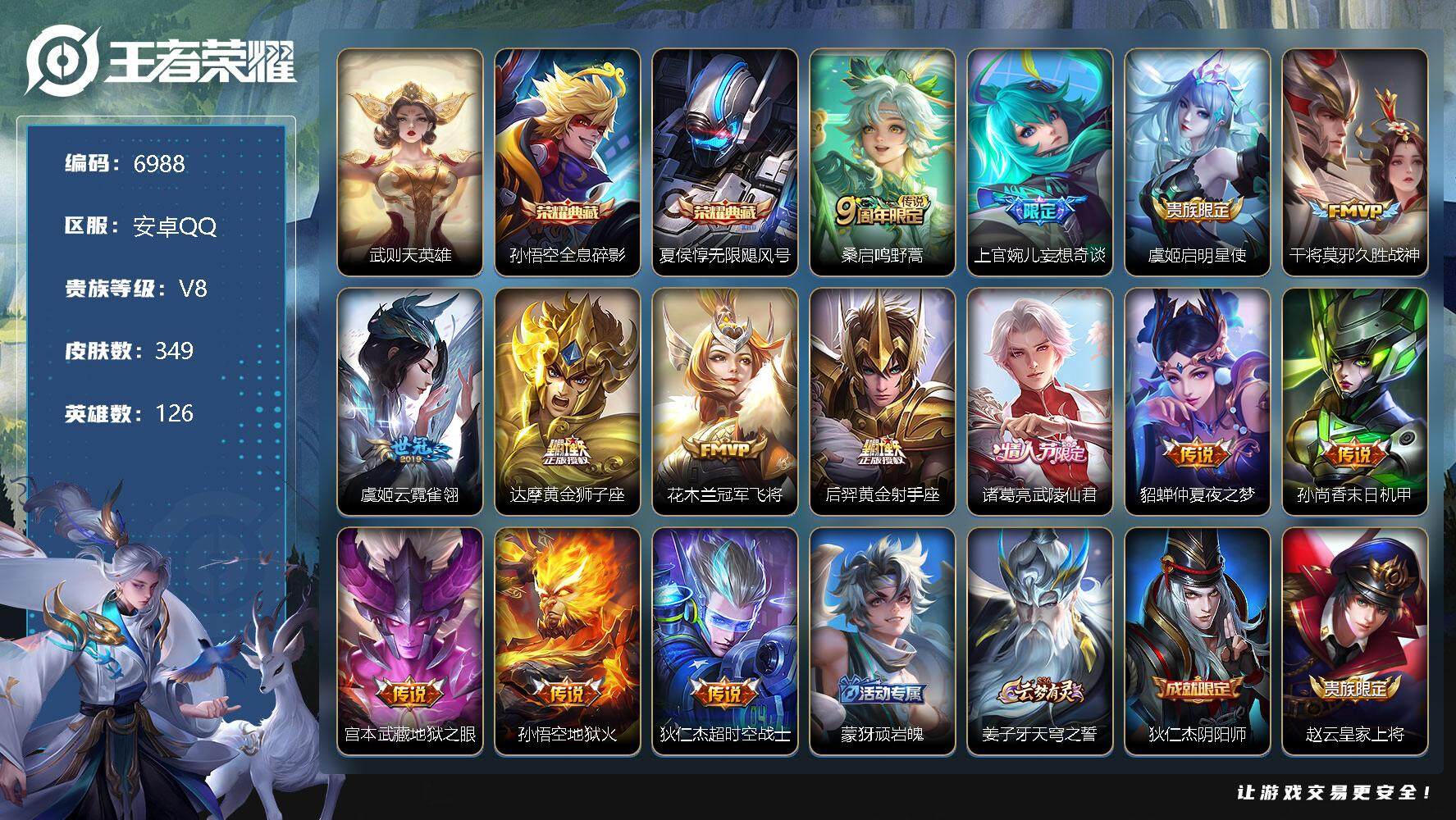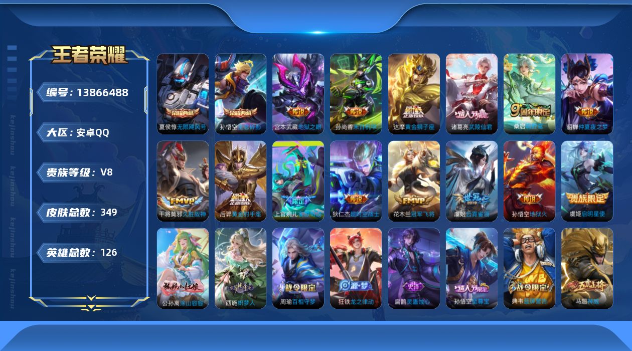 [13866488]安卓Q-V8-永恒钻石III段位-126英雄-349皮肤-2典藏-0珍品无双-0无双-0珍品传说-14传说-103史诗 【荣耀典藏】:武则天英雄,孙悟空全息碎影,夏侯惇无限飓风号 【传说皮肤】:桑启鸣野蒿,上官婉儿妄想奇谈,虞姬启明星使,干将莫邪久胜战神,虞姬云霓雀翎,达摩黄金狮子座,花木兰冠军飞将,后羿黄金射手座,诸葛亮武陵仙君,貂蝉仲夏夜之梦,孙尚香末日机甲,宫本武藏地狱之眼,孙悟空地狱火,狄仁杰超时空战士 【限定皮肤】:蒙犽顽岩魄,姜子牙天穹之誓,狄仁杰阴阳师,赵云皇家上将,墨子神迹守卫,嬴政优雅恋人,嬴政白昼王子,孙尚香蔷薇恋人,鲁班七号狮舞东方,庄周高山流水,高渐离死亡摇滚,阿轲迷踪丽影,钟无艳王者之锤,钟无艳超时空战士,扁鹊奇幻香踪,白起夜都怪侠,芈月重明,芈月幻夜卜梦,吕布猎兽之王,周瑜赤莲之焰,元歌云间偶戏,元歌无心,夏侯惇朔风刀,甄姬游园惊梦,甄姬落雪兰心,曹操烛龙,典韦穷奇,典韦蓝屏警告,马可波罗暗影游猎,马可波罗山海玄木吟,狄仁杰魔术师,狄仁杰万华元夜,达摩星际陆战队,达摩沙漠行僧,项羽海滩派对,老夫子醍醐杖,老夫子航海奇遇记,程咬金演武夺筹,刘邦夺宝奇兵,韩信飞衡,王昭君午后时光,兰陵王驯魔猎人,兰陵王金庭之子,花木兰默契交锋,亚瑟潮玩骑士王,孙悟空美猴王,孙悟空至尊宝,孙悟空大圣娶亲,孙悟空孙行者,牛魔御旌,后羿如梦令,后羿圣弓游侠,李元芳银河之约,李元芳云中旅人,虞姬启明星使,钟馗神迹守卫,钟馗驱傩正仪,杨玉环遇见飞天,杨戬潮玩骑兵,女娲朔望之晖,干将莫邪真爱魔法,雅典娜单词大作战,雅典娜黎明之约,蔡文姬繁星吟游,太乙真人华丽摇滚,鬼谷子原初探秘者,鬼谷子五谷丰年,诸葛亮武陵仙君,黄忠火炮绅士,苏烈千军破阵,百里玄策原初追逐者,百里守约朱雀志,弈星混沌棋,梦奇顽趣,公孙离蜜橘之夏,沈梦溪星空之诺,沈梦溪大漠名商,沈梦溪匿光破解者,明世隐疑决卦,明世隐吟游魔法,裴擒虎天狼狩猎者,裴擒虎李小龙,裴擒虎擒涛扼浪,狂铁御狮,狂铁电玩高手,米莱狄御霄,米莱狄胡桃异想国,云中君纤云弄巧,盾山御銮,猪八戒西部大镖客,上官婉儿梁祝,上官婉儿天狼绘梦者,上官婉儿妄想奇谈,嫦娥暖冬兔眠,西施玲珑珍味,蒙犽狂想玩偶喵,鲁班大师探海日志,桑启海盐诗旅,暃星界游侠,戈娅驭风魔法,艾琳女武神,张良古海寻踪,蒙恬荣光圣徽,鬼谷子天穹祈灯,刘邦剑破天穹,周瑜熔金海岸