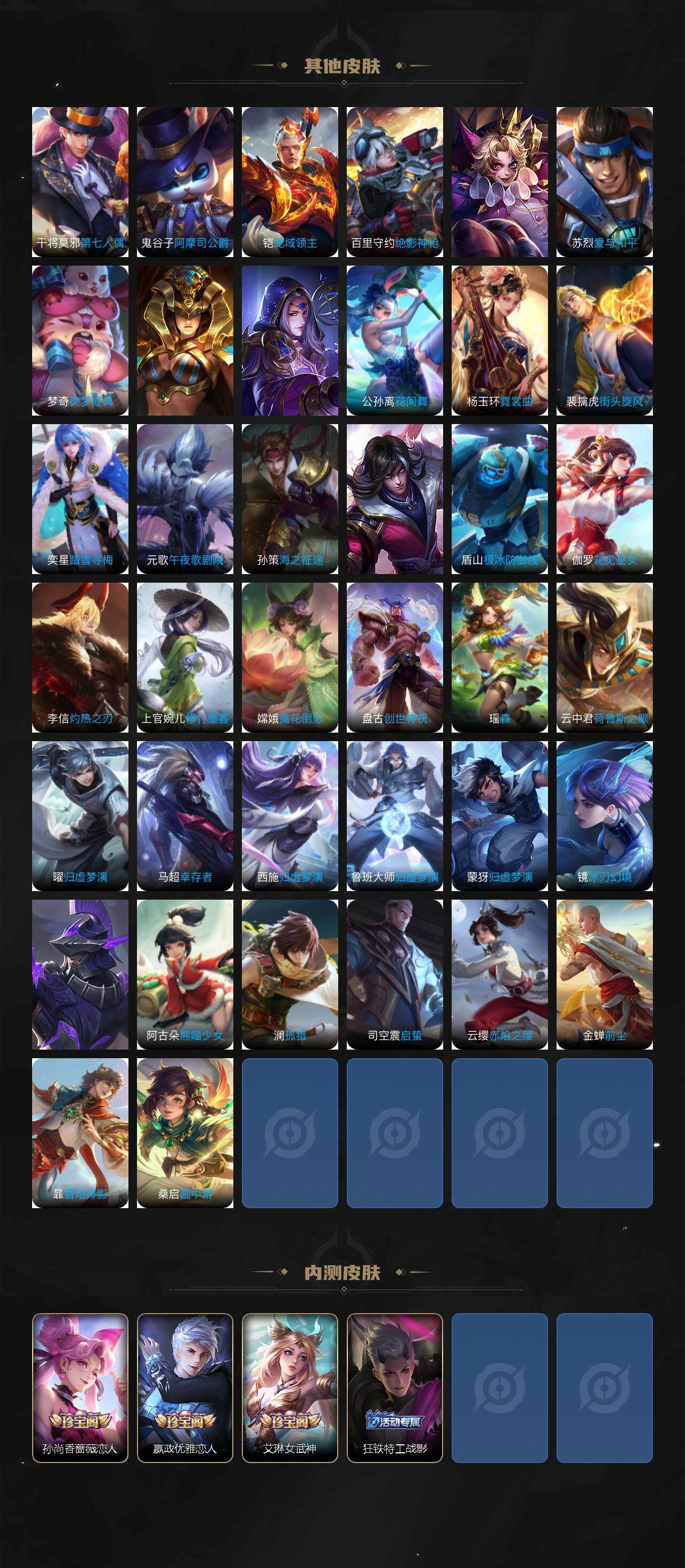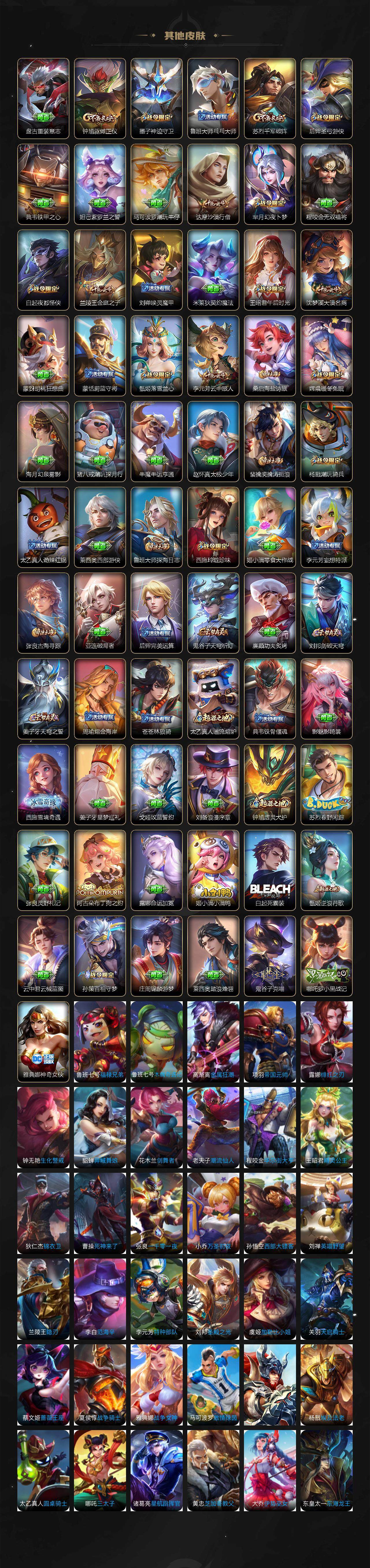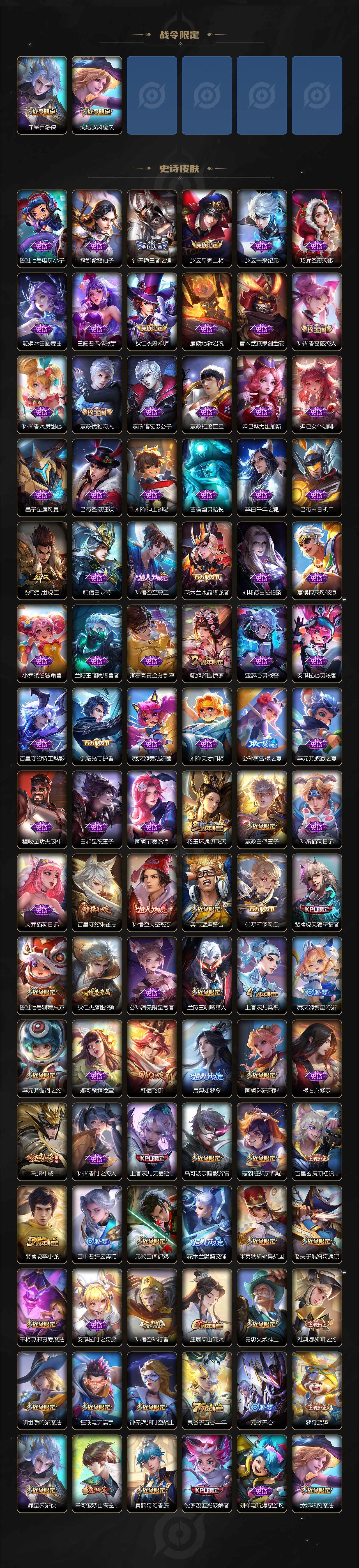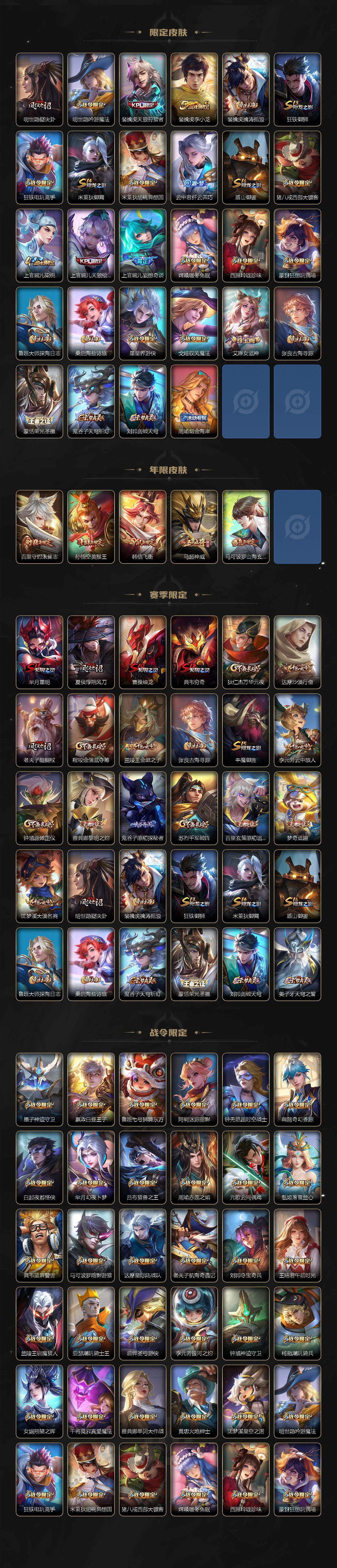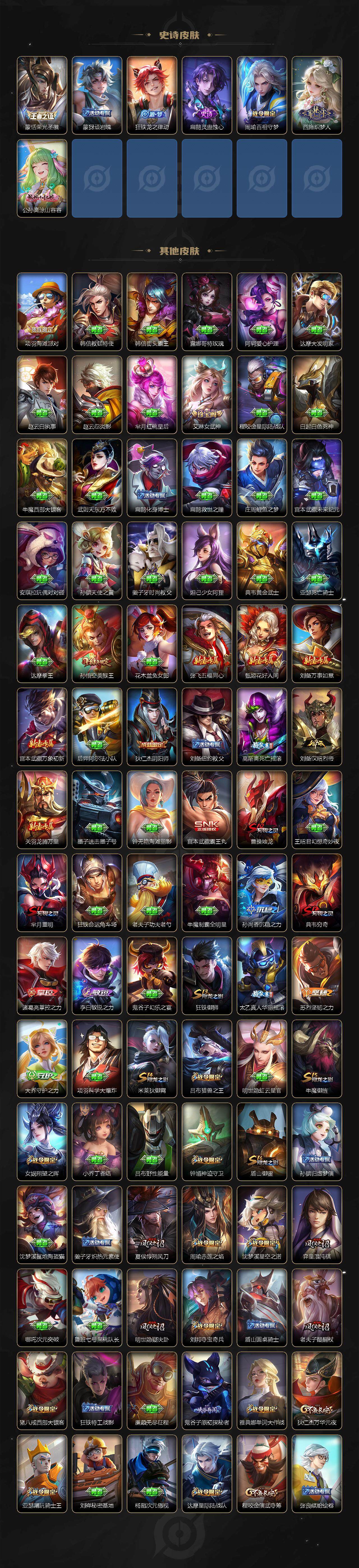【限定皮肤】:蒙犽顽岩魄,姜子牙天穹之誓,狄仁杰阴阳师,赵云皇家上将,墨子神迹守卫,嬴政优雅恋人,嬴政白昼王子,孙尚香蔷薇恋人,鲁班七号狮舞东方,庄周高山流水,高渐离死亡摇滚,阿轲迷踪丽影,钟无艳王者之锤,钟无艳超时空战士,扁鹊奇幻香踪,白起夜都怪侠,芈月重明,芈月幻夜卜梦,吕布猎兽之王,周瑜赤莲之焰,元歌云间偶戏,元歌无心,夏侯惇朔风刀,甄姬游园惊梦,甄姬落雪兰心,曹操烛龙,典韦穷奇,典韦蓝屏警告,马可波罗暗影游猎,马可波罗山海玄木吟,狄仁杰魔术师,狄仁杰万华元夜,达摩星际陆战队,达摩沙漠行僧,项羽海滩派对,老夫子醍醐杖,老夫子航海奇遇记,程咬金演武夺筹,刘邦夺宝奇兵,韩信飞衡,王昭君午后时光,兰陵王驯魔猎人,兰陵王金庭之子,花木兰默契交锋,亚瑟潮玩骑士王,孙悟空美猴王,孙悟空至尊宝,孙悟空大圣娶亲,孙悟空孙行者,牛魔御旌,后羿如梦令,后羿圣弓游侠,李元芳银河之约,李元芳云中旅人,虞姬启明星使,钟馗神迹守卫,钟馗驱傩正仪,杨玉环遇见飞天,杨戬潮玩骑兵,女娲朔望之晖,干将莫邪真爱魔法,雅典娜单词大作战,雅典娜黎明之约,蔡文姬繁星吟游,太乙真人华丽摇滚,鬼谷子原初探秘者,鬼谷子五谷丰年,诸葛亮武陵仙君,黄忠火炮绅士,苏烈千军破阵,百里玄策原初追逐者,百里守约朱雀志,弈星混沌棋,梦奇顽趣,公孙离蜜橘之夏,沈梦溪星空之诺,沈梦溪大漠名商,沈梦溪匿光破解者,明世隐疑决卦,明世隐吟游魔法,裴擒虎天狼狩猎者,裴擒虎李小龙,裴擒虎擒涛扼浪,狂铁御狮,狂铁电玩高手,米莱狄御霄,米莱狄胡桃异想国,云中君纤云弄巧,盾山御銮,猪八戒西部大镖客,上官婉儿梁祝,上官婉儿天狼绘梦者,上官婉儿妄想奇谈,嫦娥暖冬兔眠,西施玲珑珍味,蒙犽狂想玩偶喵,鲁班大师探海日志,桑启海盐诗旅,暃星界游侠,戈娅驭风魔法,艾琳女武神,张良古海寻踪,蒙恬荣光圣徽,鬼谷子天穹祈灯,刘邦剑破天穹,周瑜熔金海岸
