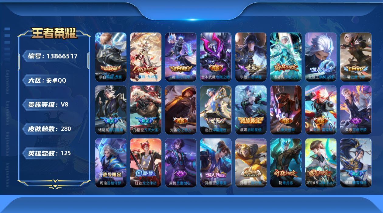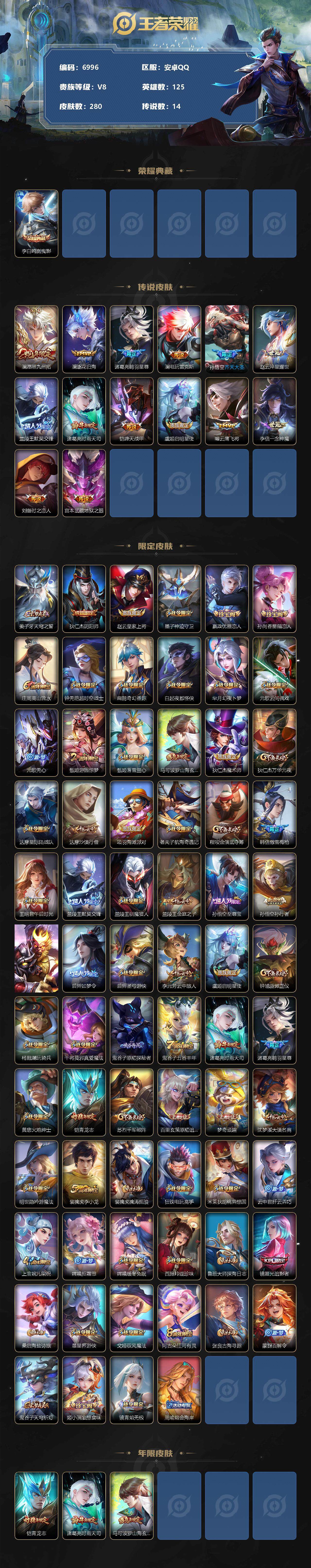 [13866517]安卓Q-V8-永恒钻石I段位-125英雄-280皮肤-1典藏-0珍品无双-0无双-0珍品传说-14传说-76史诗 【荣耀典藏】:李白鸣剑曳影 【传说皮肤】:澜愿照九州拓,澜逐花归海,诸葛亮鹤羽星尊,澜电玩雷克斯,孙悟空齐天大圣,赵云淬星耀世,兰陵王默契交锋,诸葛亮时雨天司,铠绛天战甲,虞姬启明星使,曜云鹰飞将,李信一念神魔,刘备时之恋人,宫本武藏地狱之眼 【限定皮肤】:姜子牙天穹之誓,狄仁杰阴阳师,赵云皇家上将,墨子神迹守卫,嬴政优雅恋人,孙尚香蔷薇恋人,庄周高山流水,钟无艳超时空战士,扁鹊奇幻香踪,白起夜都怪侠,芈月幻夜卜梦,元歌云间偶戏,元歌无心,甄姬游园惊梦,甄姬落雪兰心,马可波罗山海玄木吟,狄仁杰魔术师,狄仁杰万华元夜,达摩星际陆战队,达摩沙漠行僧,项羽海滩派对,老夫子航海奇遇记,程咬金演武夺筹,韩信傲雪梅枪,王昭君午后时光,兰陵王默契交锋,兰陵王驯魔猎人,兰陵王金庭之子,孙悟空至尊宝,孙悟空孙行者,孙悟空齐天大圣,后羿如梦令,后羿圣弓游侠,李元芳云中旅人,虞姬启明星使,钟馗驱傩正仪,杨戬潮玩骑兵,干将莫邪真爱魔法,鬼谷子原初探秘者,鬼谷子五谷丰年,诸葛亮时雨天司,诸葛亮鹤羽星尊,黄忠火炮绅士,铠青龙志,苏烈千军破阵,百里玄策原初追逐者,梦奇顽趣,沈梦溪大漠名商,明世隐吟游魔法,裴擒虎李小龙,裴擒虎擒涛扼浪,狂铁电玩高手,米莱狄胡桃异想国,云中君纤云弄巧,上官婉儿梁祝,嫦娥拒霜思,嫦娥暖冬兔眠,西施玲珑珍味,鲁班大师探海日志,镜匿光追影者,桑启海盐诗旅,暃星界游侠,戈娅驭风魔法,阿古朵江河有灵,张良古海寻踪,蒙犽百解令,鬼谷子天穹祈灯,姬小满妄想食味,镜青焰无极,周瑜熔金海岸 【年限皮肤】:铠青龙志,诸葛亮时雨天司,马可波罗山海玄木吟 【赛季限定】:狄仁杰万华元夜,达摩沙漠行僧,程咬金演武夺筹,兰陵王金庭之子,张良古海寻踪,李元芳云中旅人,钟馗驱傩正仪,鬼谷子原初探秘者,苏烈千军破阵,百里玄策原初追逐者,梦奇顽趣,沈梦溪大漠名商,裴擒虎擒涛扼浪,鲁班大师探海日志,桑启海盐诗旅,鬼谷子天穹祈灯,姜子牙天穹之誓 【战令限定】:墨子神迹守卫,钟无艳超时空战士,扁鹊奇幻香踪,白起夜都怪侠,芈月幻夜卜梦,元歌云间偶戏,甄姬落雪兰心,达摩星际陆战队,老夫子航海奇遇记,王昭君午后时光,兰陵王驯魔猎人,后羿圣弓游侠,杨戬潮玩骑兵,干将莫邪真爱魔法,黄忠火炮绅士,明世隐吟游