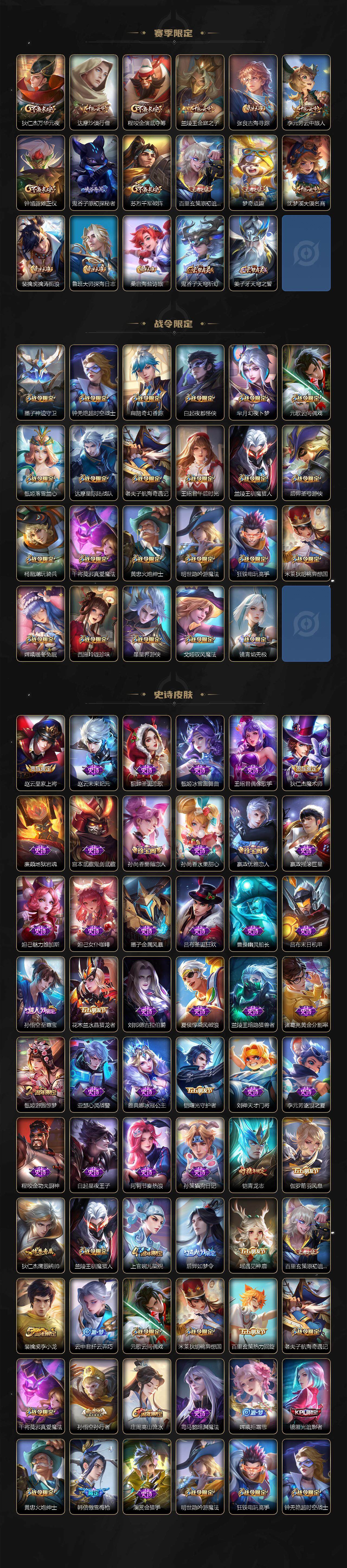 【赛季限定】:狄仁杰万华元夜,达摩沙漠行僧,程咬金演武夺筹,兰陵王金庭之子,张良古海寻踪,李元芳云中旅人,钟馗驱傩正仪,鬼谷子原初探秘者,苏烈千军破阵,百里玄策原初追逐者,梦奇顽趣,沈梦溪大漠名商,裴擒虎擒涛扼浪,鲁班大师探海日志,桑启海盐诗旅,鬼谷子天穹祈灯,姜子牙天穹之誓