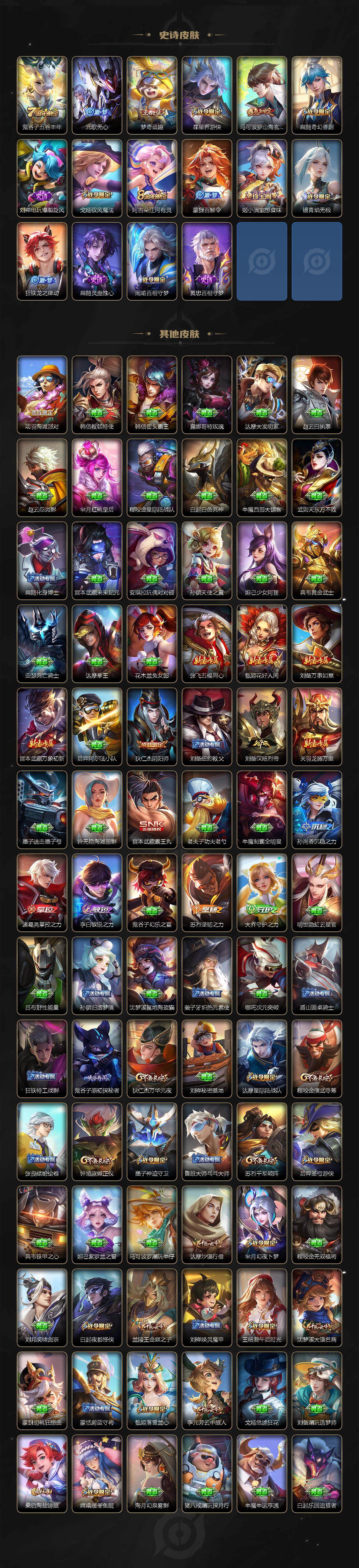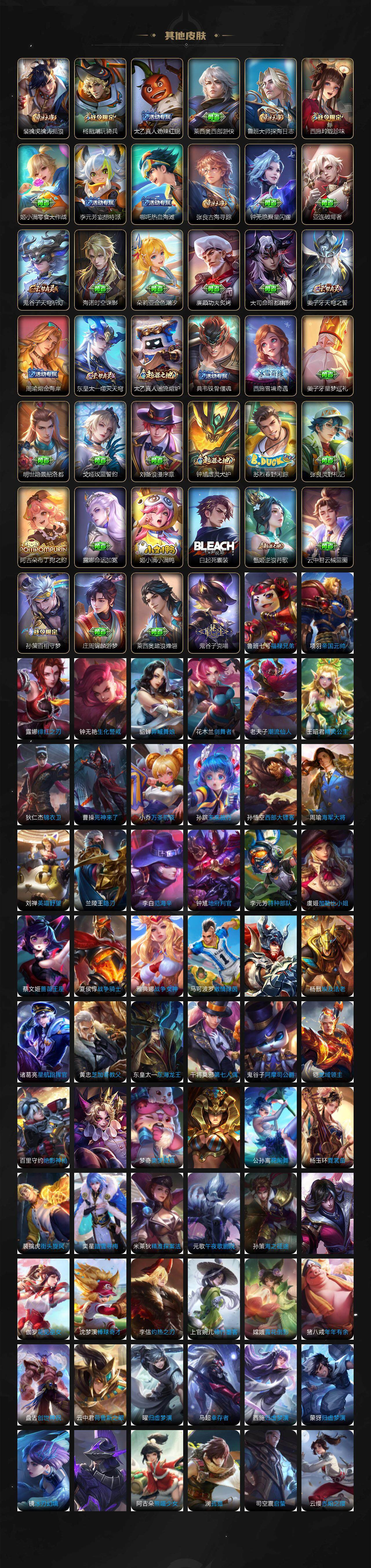 【限定皮肤】:姜子牙天穹之誓,狄仁杰阴阳师,赵云皇家上将,墨子神迹守卫,嬴政优雅恋人,孙尚香蔷薇恋人,庄周高山流水,钟无艳超时空战士,扁鹊奇幻香踪,白起夜都怪侠,芈月幻夜卜梦,元歌云间偶戏,元歌无心,甄姬游园惊梦,甄姬落雪兰心,马可波罗山海玄木吟,狄仁杰魔术师,狄仁杰万华元夜,达摩星际陆战队,达摩沙漠行僧,项羽海滩派对,老夫子航海奇遇记,程咬金演武夺筹,韩信傲雪梅枪,王昭君午后时光,兰陵王默契交锋,兰陵王驯魔猎人,兰陵王金庭之子,孙悟空至尊宝,孙悟空孙行者,孙悟空齐天大圣,后羿如梦令,后羿圣弓游侠,李元芳云中旅人,虞姬启明星使,钟馗驱傩正仪,杨戬潮玩骑兵,干将莫邪真爱魔法,鬼谷子原初探秘者,鬼谷子五谷丰年,诸葛亮时雨天司,诸葛亮鹤羽星尊,黄忠火炮绅士,铠青龙志,苏烈千军破阵,百里玄策原初追逐者,梦奇顽趣,沈梦溪大漠名商,明世隐吟游魔法,裴擒虎李小龙,裴擒虎擒涛扼浪,狂铁电玩高手,米莱狄胡桃异想国,云中君纤云弄巧,上官婉儿梁祝,嫦娥拒霜思,嫦娥暖冬兔眠,西施玲珑珍味,鲁班大师探海日志,镜匿光追影者,桑启海盐诗旅,暃星界游侠,戈娅驭风魔法,阿古朵江河有灵,张良古海寻踪,蒙犽百解令,鬼谷子天穹祈灯,姬小满妄想食味,镜青焰无极,周瑜熔金海岸