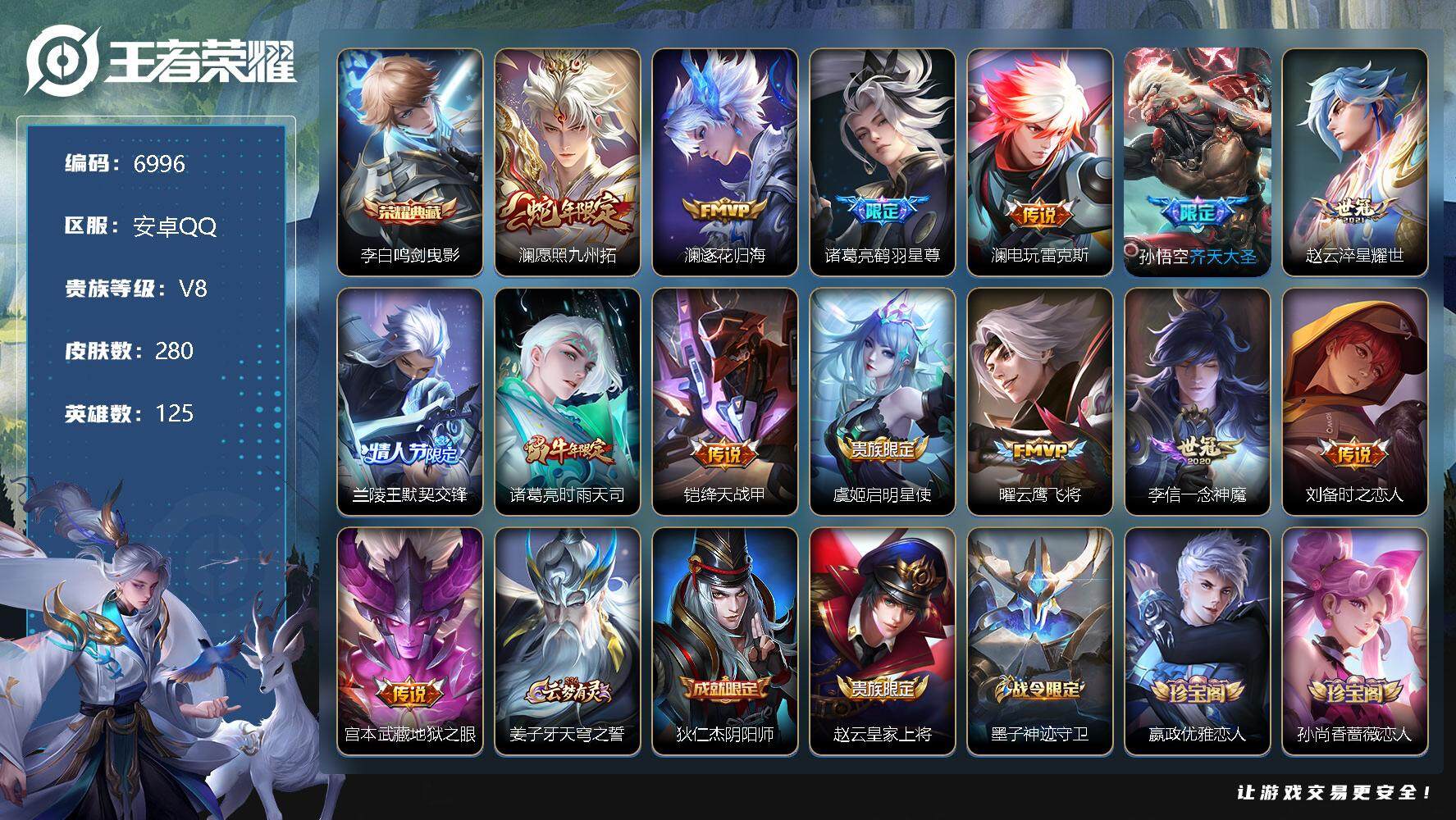 [13866517]安卓Q-V8-永恒钻石I段位-125英雄-280皮肤-1典藏-0珍品无双-0无双-0珍品传说-14传说-76史诗