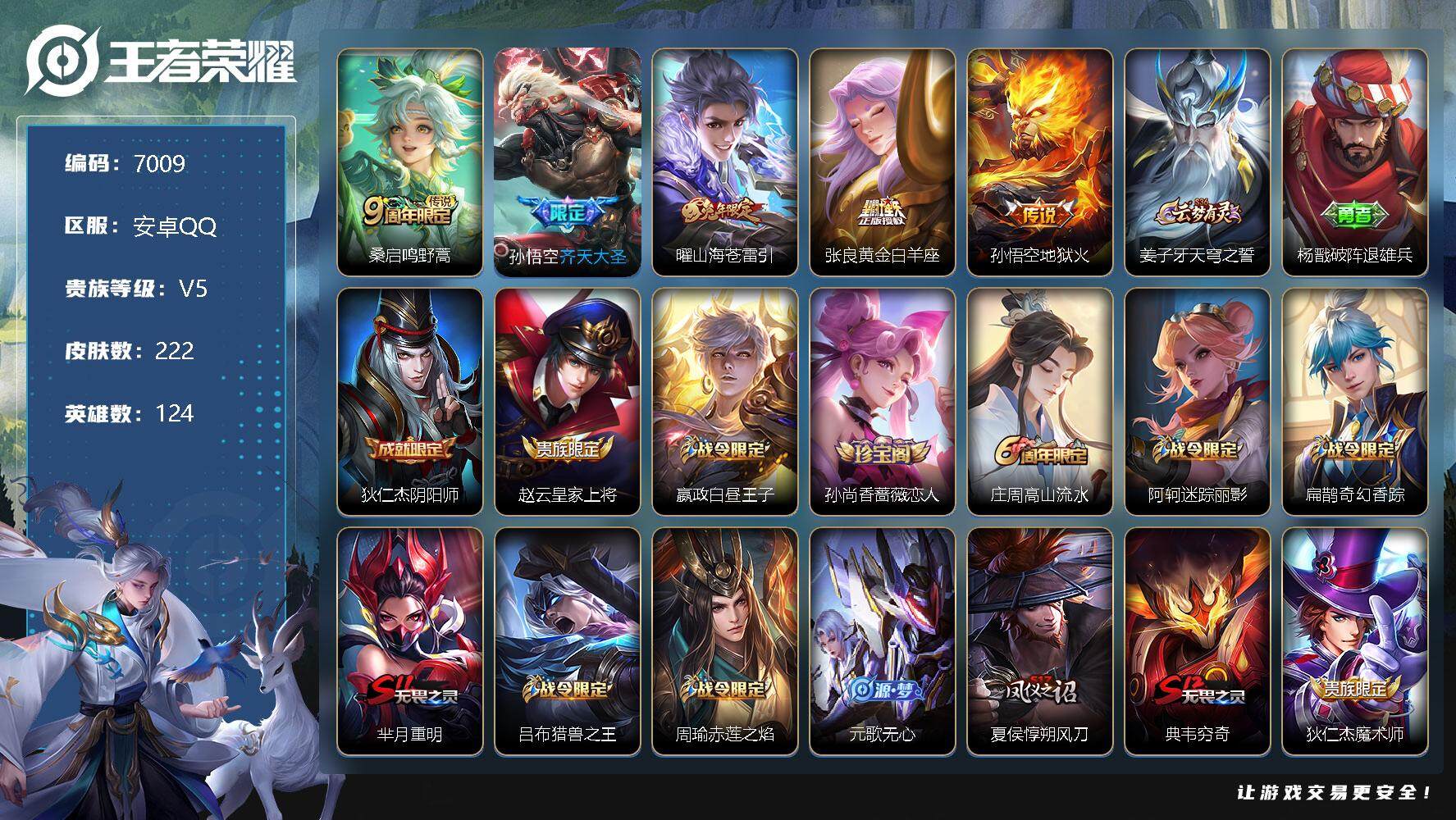 [13866562]安卓Q-V5-永恒钻石I段位-124英雄-222皮肤-0典藏-0珍品无双-0无双-0珍品传说-5传说-44史诗 【传说皮肤】:桑启鸣野蒿,孙悟空齐天大圣,曜山海苍雷引,张良黄金白羊座,孙悟空地狱火 【限定皮肤】:姜子牙天穹之誓,杨戬破阵退雄兵,狄仁杰阴阳师,赵云皇家上将,嬴政白昼王子,孙尚香蔷薇恋人,庄周高山流水,阿轲迷踪丽影,扁鹊奇幻香踪,芈月重明,吕布猎兽之王,周瑜赤莲之焰,元歌无心,夏侯惇朔风刀,典韦穷奇,狄仁杰魔术师,项羽海滩派对,老夫子醍醐杖,刘邦夺宝奇兵,兰陵王驯魔猎人,孙悟空美猴王,孙悟空至尊宝,孙悟空大圣娶亲,孙悟空齐天大圣,牛魔御旌,李元芳云中旅人,杨戬潮玩骑兵,雅典娜单词大作战,弈星混沌棋,沈梦溪大漠名商,明世隐疑决卦,裴擒虎擒涛扼浪,狂铁御狮,米莱狄御霄,盾山御銮,上官婉儿梁祝,嫦娥暖冬兔眠,曜山海苍雷引,西施玲珑珍味,鲁班大师探海日志,桑启海盐诗旅,暃星界游侠,戈娅驭风魔法,艾琳流音漫舞,司空震地狱燃心,阿古朵江河有灵,张良古海寻踪,鬼谷子天穹祈灯,沈梦溪龙舞盛年,刘邦剑破天穹,刘备异域游侠,周瑜熔金海岸 【年限皮肤】:孙悟空美猴王,曜山海苍雷引 【赛季限定】:芈月重明,夏侯惇朔风刀,典韦穷奇,老夫子醍醐杖,张良古海寻踪,牛魔御旌,李元芳云中旅人,弈星混沌棋,沈梦溪大漠名商,明世隐疑决卦,裴擒虎擒涛扼浪,狂铁御狮,米莱狄御霄,盾山御銮,鲁班大师探海日志,桑启海盐诗旅,鬼谷子天穹祈灯,刘邦剑破天穹,姜子牙天穹之誓 【战令限定】:嬴政白昼王子,阿轲迷踪丽影,扁鹊奇幻香踪,吕布猎兽之王,周瑜赤莲之焰,刘邦夺宝奇兵,兰陵王驯魔猎人,艾琳流音漫舞,杨戬潮玩骑兵,雅典娜单词大作战,嫦娥暖冬兔眠,西施玲珑珍味,司空震地狱燃心,暃星界游侠,戈娅驭风魔法 【史诗皮肤】:鲁班七号电玩小子,露娜紫霞仙子,赵云皇家上将,甄姬冰雪圆舞曲,狄仁杰魔术师,宫本武藏鬼剑武藏,孙尚香蔷薇恋人,孙尚香水果甜心,嬴政摇滚巨星,妲己魅力维加斯,妲己女仆咖啡,墨子金属风暴,吕布圣诞狂欢,李白千年之狐,韩信白龙吟,孙悟空至尊宝,花木兰水晶猎龙者,刘邦德古拉伯爵,诸葛亮黄金分割率,安琪拉心灵骇客,百里守约特工魅影,铠曙光守护者,阿轲节奏热浪,嬴政白昼王子,孙策猫狗日记,孙悟空大圣娶亲,伽罗箭羽风息,狄仁杰鹰眼统帅,兰陵王驯魔猎人,上官婉儿梁祝,娜可露露晚萤,阿轲迷踪丽影,孙尚香时之恋人