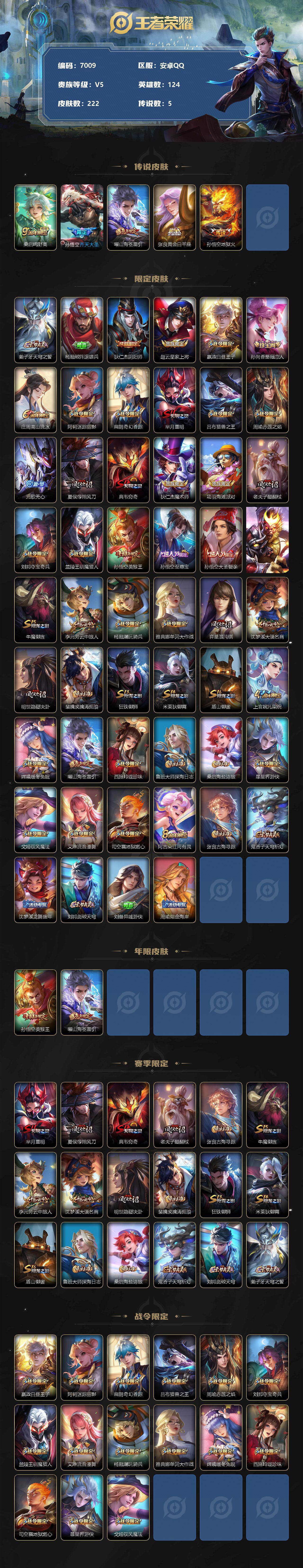 [13866562]安卓Q-V5-永恒钻石I段位-124英雄-222皮肤-0典藏-0珍品无双-0无双-0珍品传说-5传说-44史诗