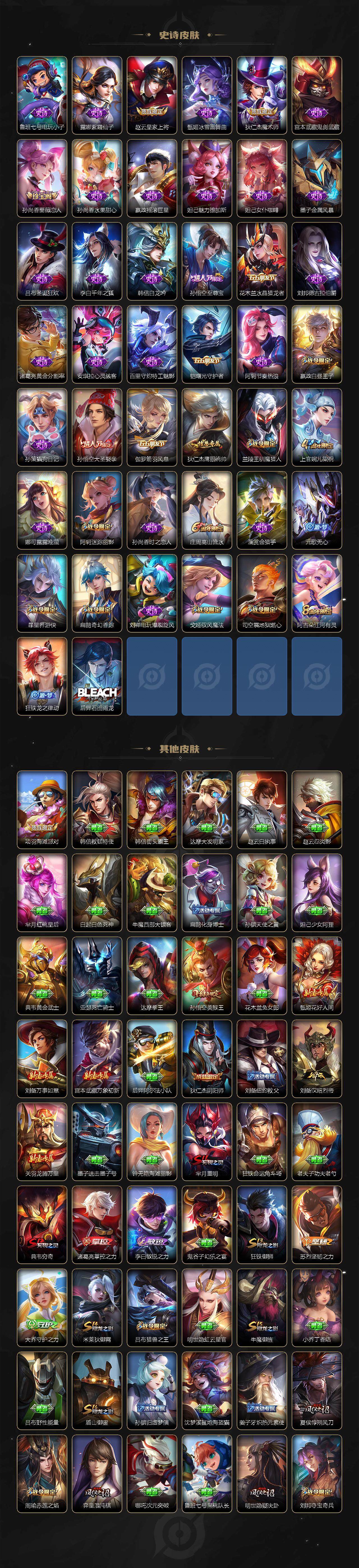 【史诗皮肤】:鲁班七号电玩小子,露娜紫霞仙子,赵云皇家上将,甄姬冰雪圆舞曲,狄仁杰魔术师,宫本武藏鬼剑武藏,孙尚香蔷薇恋人,孙尚香水果甜心,嬴政摇滚巨星,妲己魅力维加斯,妲己女仆咖啡,墨子金属风暴,吕布圣诞狂欢,李白千年之狐,韩信白龙吟,孙悟空至尊宝,花木兰水晶猎龙者,刘邦德古拉伯爵,诸葛亮黄金分割率,安琪拉心灵骇客,百里守约特工魅影,铠曙光守护者,阿轲节奏热浪,嬴政白昼王子,孙策猫狗日记,孙悟空大圣娶亲,伽罗箭羽风息,狄仁杰鹰眼统帅,兰陵王驯魔猎人,上官婉儿梁祝,娜可露露晚萤,阿轲迷踪丽影,孙尚香时之恋人