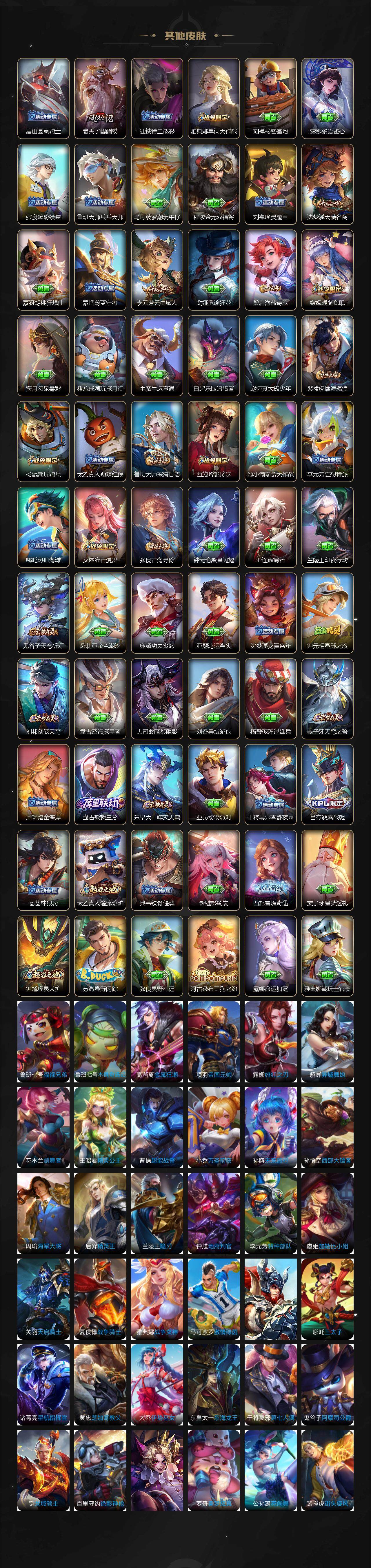 【限定皮肤】:姜子牙天穹之誓,杨戬破阵退雄兵,狄仁杰阴阳师,赵云皇家上将,嬴政白昼王子,孙尚香蔷薇恋人,庄周高山流水,阿轲迷踪丽影,扁鹊奇幻香踪,芈月重明,吕布猎兽之王,周瑜赤莲之焰,元歌无心,夏侯惇朔风刀,典韦穷奇,狄仁杰魔术师,项羽海滩派对,老夫子醍醐杖,刘邦夺宝奇兵,兰陵王驯魔猎人,孙悟空美猴王,孙悟空至尊宝,孙悟空大圣娶亲,孙悟空齐天大圣,牛魔御旌,李元芳云中旅人,杨戬潮玩骑兵,雅典娜单词大作战,弈星混沌棋,沈梦溪大漠名商,明世隐疑决卦,裴擒虎擒涛扼浪,狂铁御狮,米莱狄御霄,盾山御銮,上官婉儿梁祝,嫦娥暖冬兔眠,曜山海苍雷引,西施玲珑珍味,鲁班大师探海日志,桑启海盐诗旅,暃星界游侠,戈娅驭风魔法,艾琳流音漫舞,司空震地狱燃心,阿古朵江河有灵,张良古海寻踪,鬼谷子天穹祈灯,沈梦溪龙舞盛年,刘邦剑破天穹,刘备异域游侠,周瑜熔金海岸