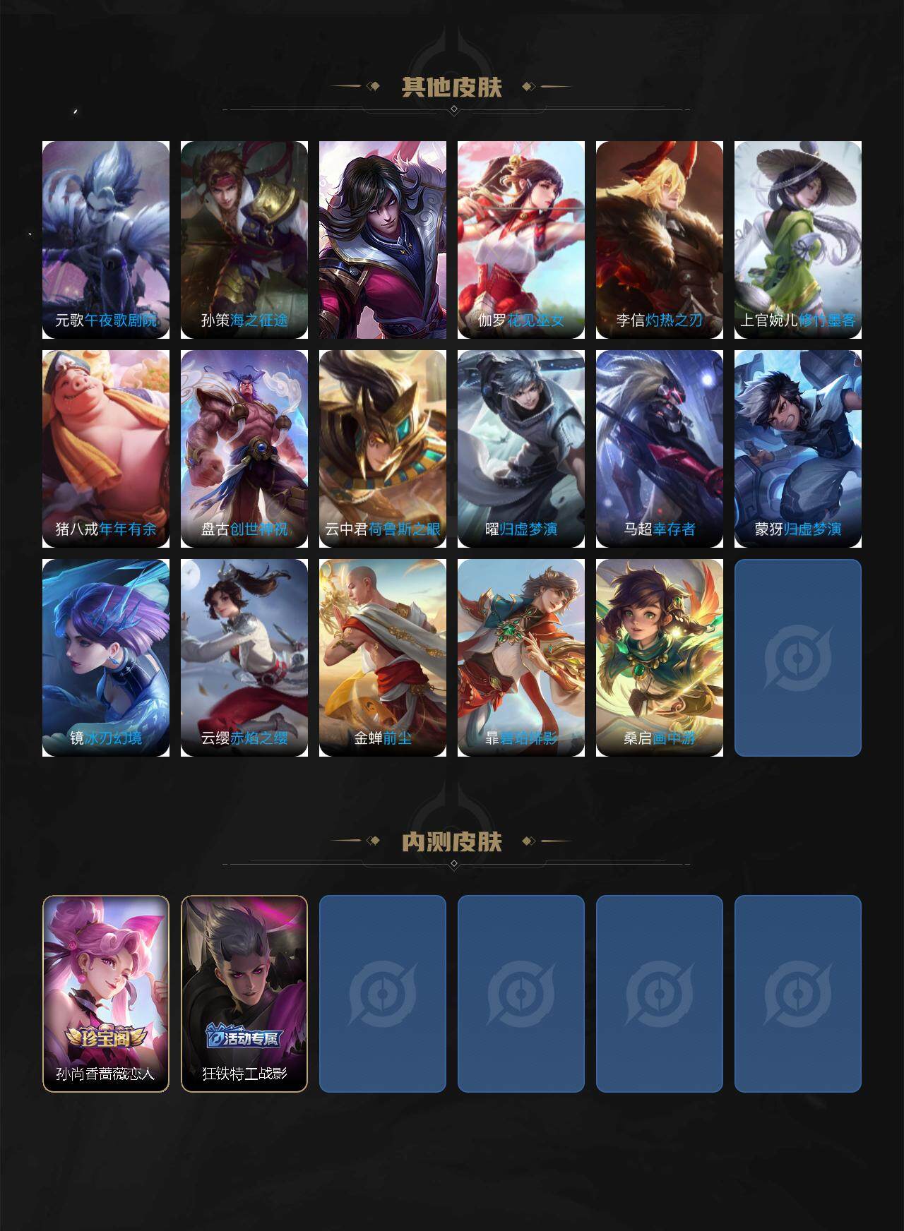 【赛季限定】:芈月重明,夏侯惇朔风刀,典韦穷奇,老夫子醍醐杖,张良古海寻踪,牛魔御旌,李元芳云中旅人,弈星混沌棋,沈梦溪大漠名商,明世隐疑决卦,裴擒虎擒涛扼浪,狂铁御狮,米莱狄御霄,盾山御銮,鲁班大师探海日志,桑启海盐诗旅,鬼谷子天穹祈灯,刘邦剑破天穹,姜子牙天穹之誓
