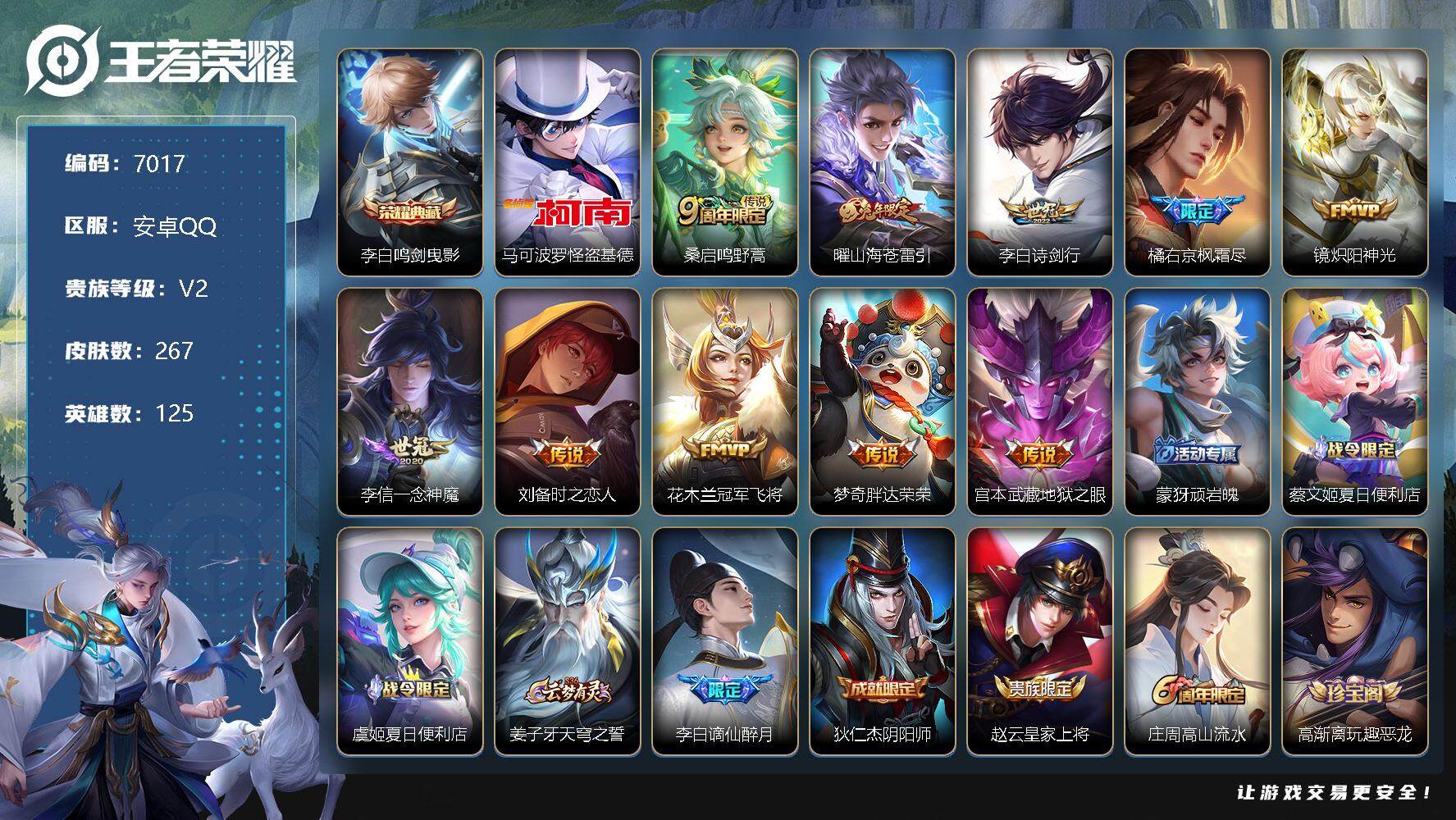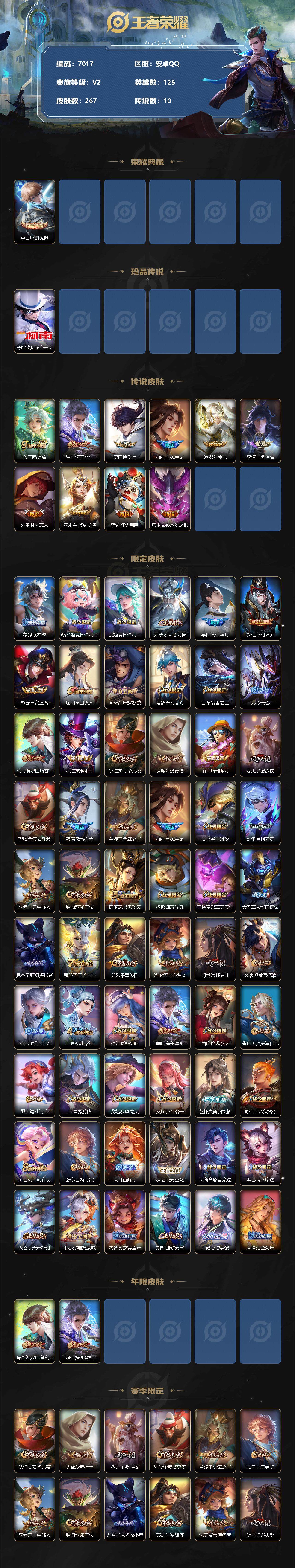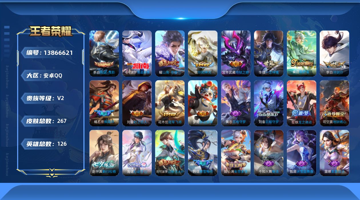 [13866621]安卓Q-V2-最强王者段位-125英雄-267皮肤-1典藏-0珍品无双-0无双-1珍品传说-10传说-74史诗
