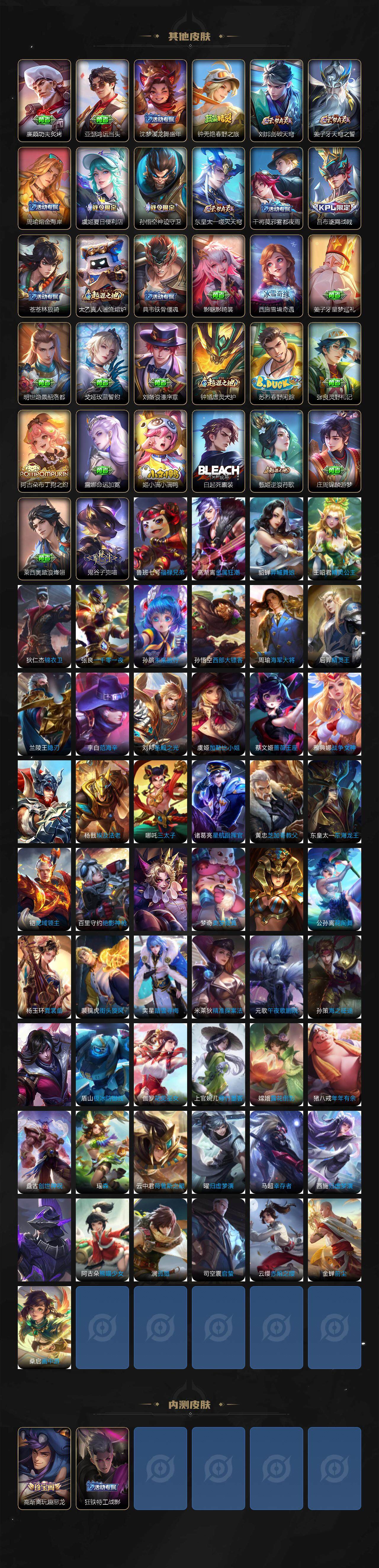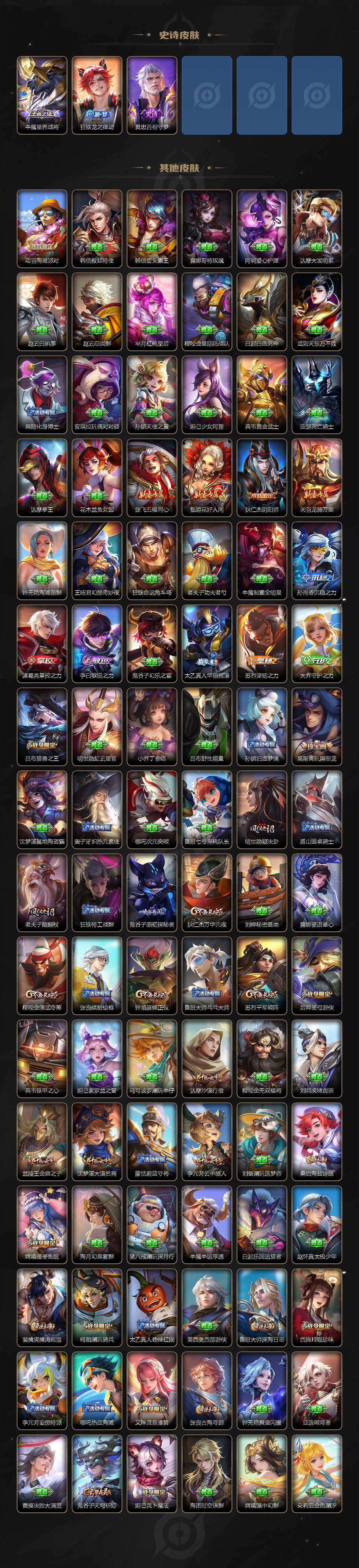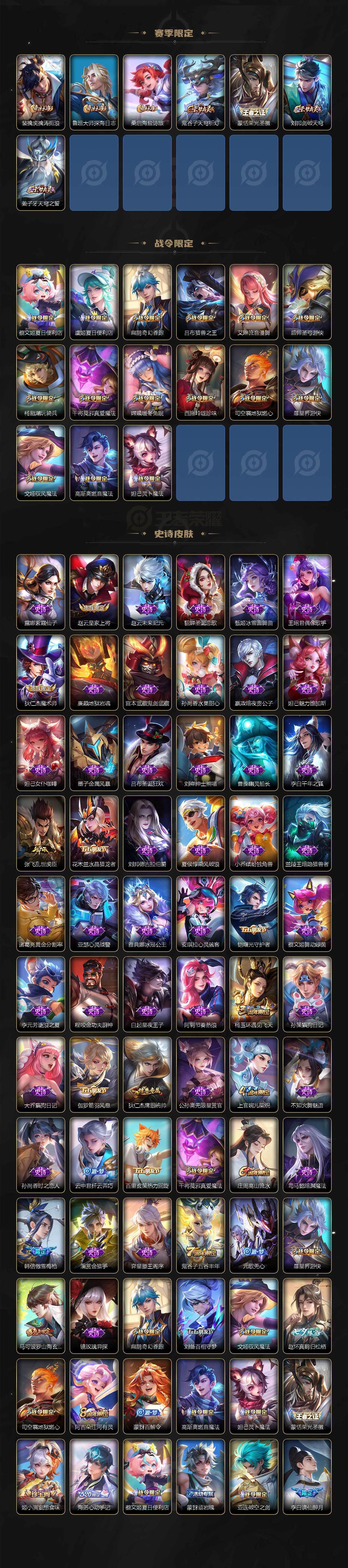【赛季限定】:狄仁杰万华元夜,达摩沙漠行僧,老夫子醍醐杖,程咬金演武夺筹,兰陵王金庭之子,张良古海寻踪,李元芳云中旅人,钟馗驱傩正仪,鬼谷子原初探秘者,苏烈千军破阵,沈梦溪大漠名商,明世隐疑决卦,裴擒虎擒涛扼浪,鲁班大师探海日志,桑启海盐诗旅,鬼谷子天穹祈灯,蒙恬荣光圣徽,刘邦剑破天穹,姜子牙天穹之誓