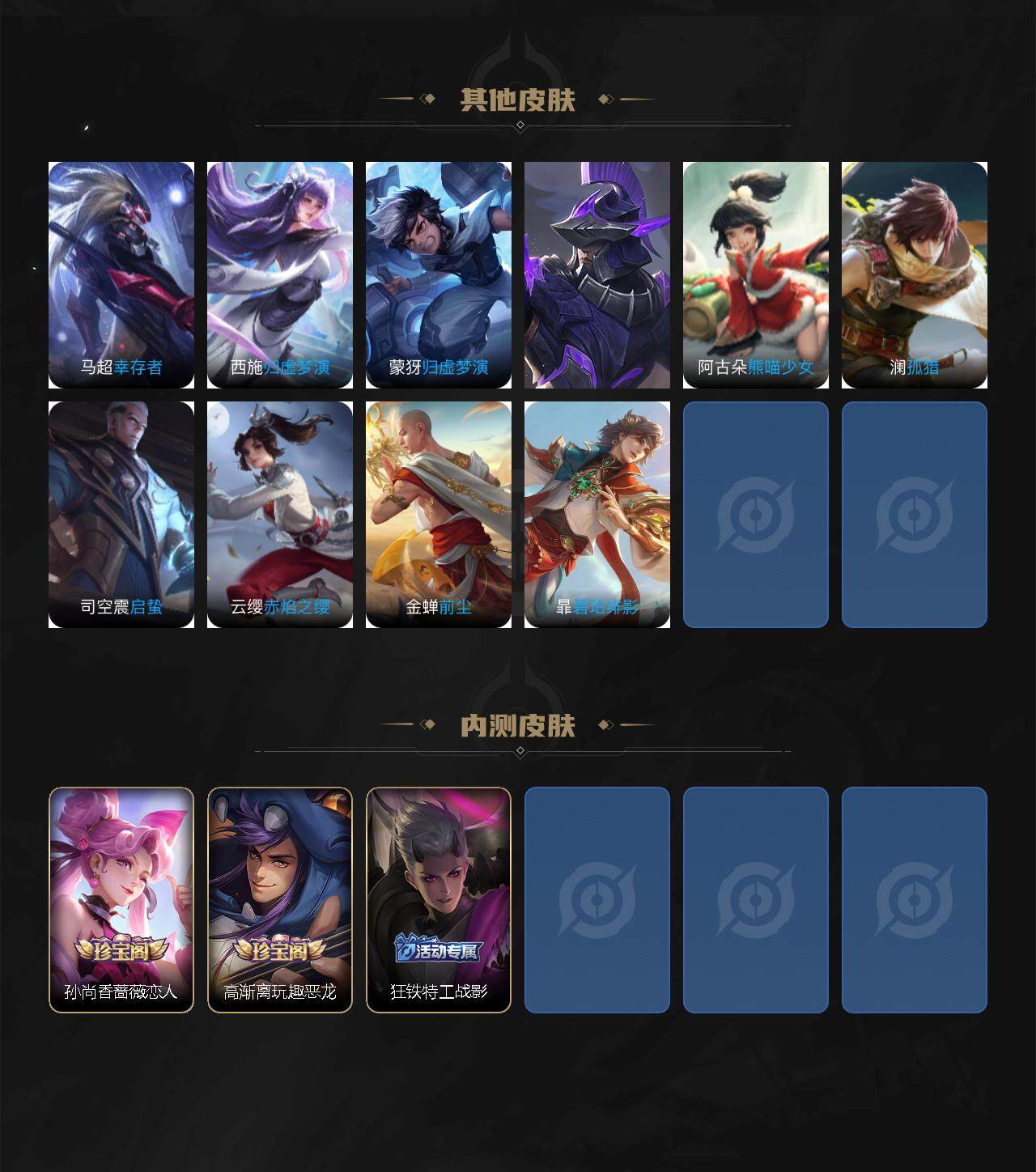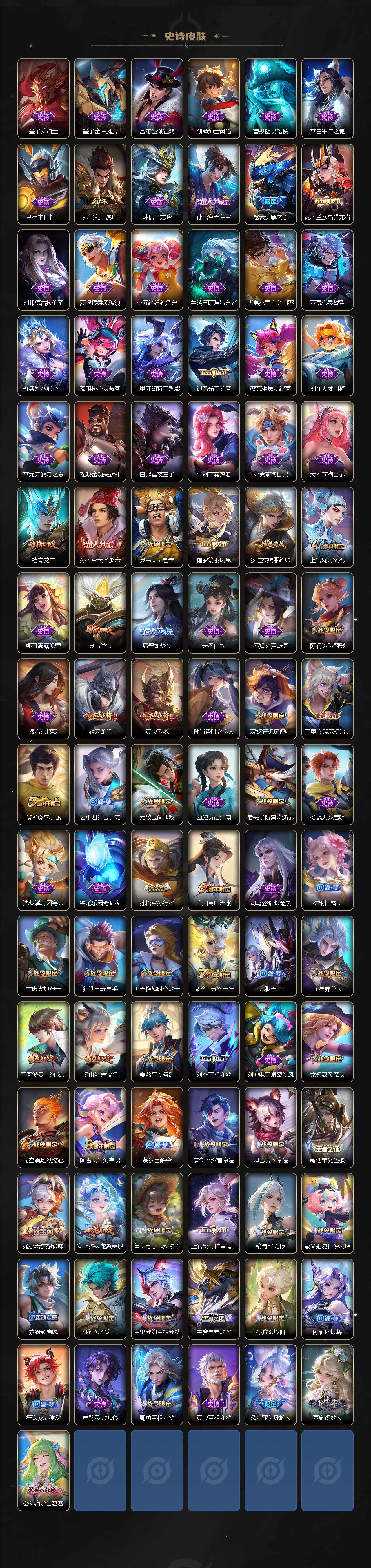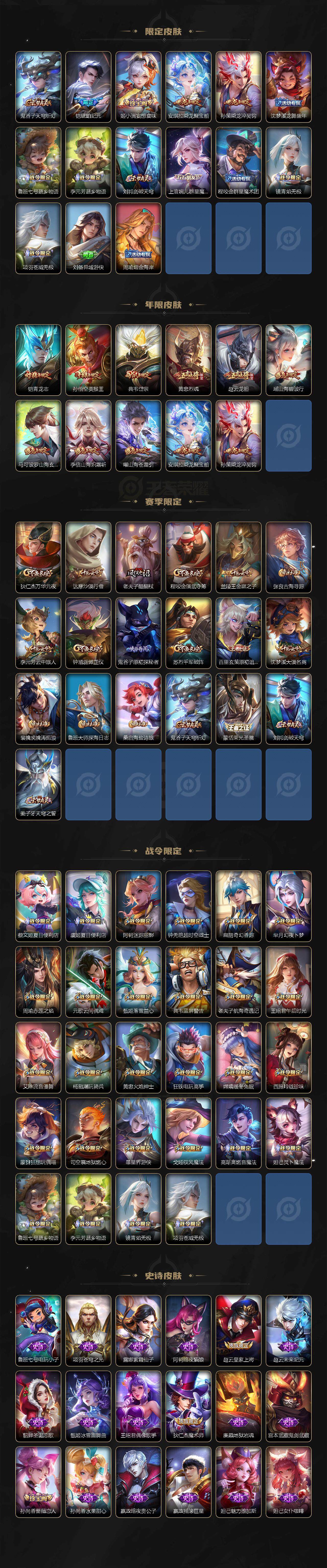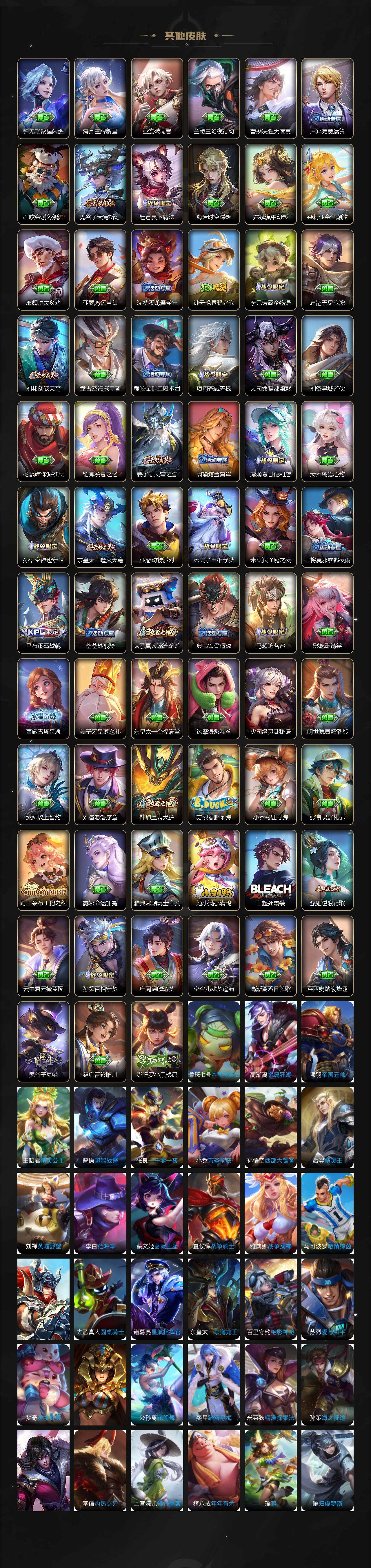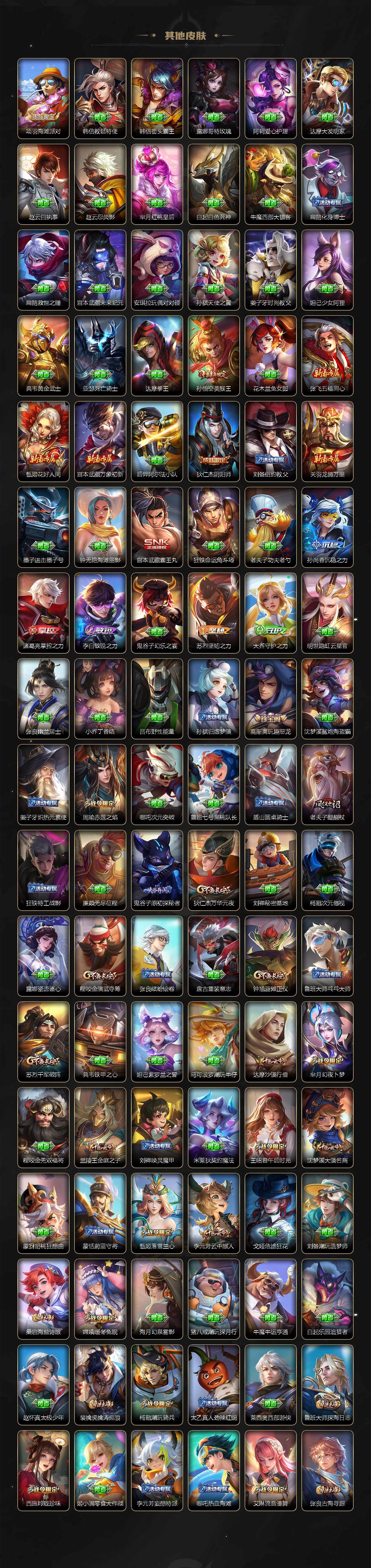 【限定皮肤】:蒙犽顽岩魄,蔡文姬夏日便利店,大乔绒语心约,虞姬夏日便利店,姜子牙天穹之誓,杨戬破阵退雄兵,狄仁杰阴阳师,赵云皇家上将,赵云引擎之心,赵云龙胆,孙尚香蔷薇恋人,庄周高山流水,高渐离玩趣恶龙,阿轲迷踪丽影,钟无艳超时空战士,扁鹊奇幻香踪,芈月幻夜卜梦,周瑜赤莲之焰,元歌云间偶戏,元歌无心,甄姬落雪兰心,典韦蓝屏警告,典韦岱宗,马可波罗山海玄木吟,狄仁杰魔术师,狄仁杰万华元夜,达摩沙漠行僧,项羽海滩派对,老夫子醍醐杖,老夫子航海奇遇记,程咬金演武夺筹,王昭君午后时光,兰陵王影龙天霄,兰陵王金庭之子,孙悟空美猴王,孙悟空至尊宝,孙悟空大圣娶亲,孙悟空零号赤焰,孙悟空孙行者,孙悟空齐天大圣,后羿如梦令,刘备百相守梦,李元芳云中旅人,虞姬启明星使,钟馗驱傩正仪,杨戬潮玩骑兵,鬼谷子原初探秘者,鬼谷子五谷丰年,黄忠烈魂,黄忠火炮绅士,铠青龙志,苏烈千军破阵,百里玄策原初追逐者,沈梦溪大漠名商,裴擒虎李小龙,裴擒虎擒涛扼浪,狂铁电玩高手,瑶山海碧波行,云中君纤云弄巧,李信山海炽霜斩,上官婉儿梁祝,嫦娥拒霜思,嫦娥暖冬兔眠,曜山海苍雷引,西施玲珑珍味,蒙犽狂想玩偶喵,鲁班大师探海日志,桑启海盐诗旅,暃星界游侠,戈娅驭风魔法,艾琳流音漫舞,司空震地狱燃心,阿古朵江河有灵,张良古海寻踪,蒙犽百解令,蒙恬荣光圣徽,高渐离燃音魔法,妲己灵卜魔法,鬼谷子天穹祈灯,铠琥珀纪元,姬小满妄想食味,安琪拉乘龙聚宝船,孙策乘龙淬吴钩,沈梦溪龙舞盛年,鲁班七号蔬乡物语,李元芳蔬乡物语,刘邦剑破天穹,上官婉儿群星魔术团,程咬金群星魔术团,镜青焰无极,项羽苍威无极,刘备异域游侠,周瑜熔金海岸