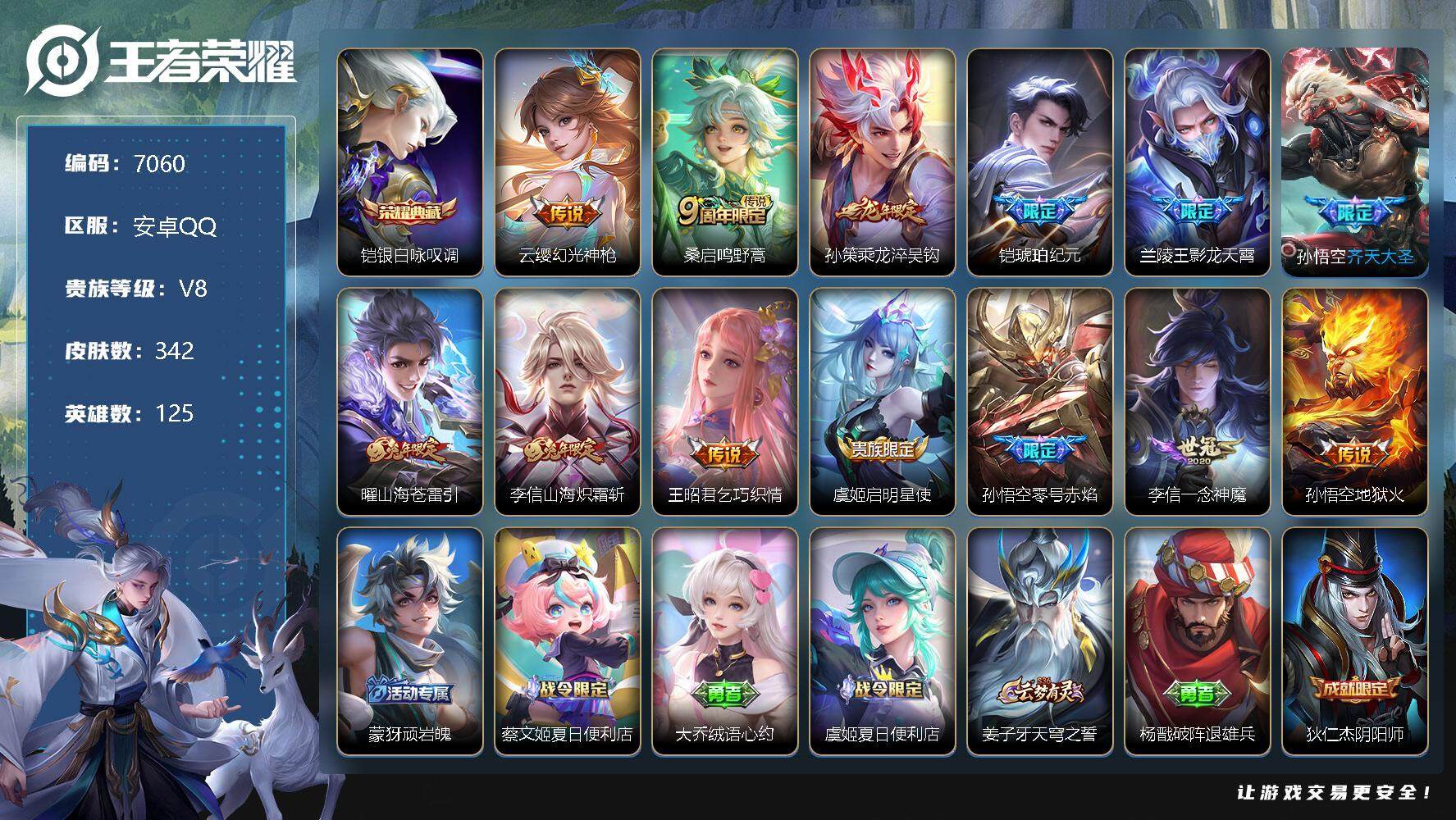 - [12111682]V8 2典藏 2珍品传说 22传说 125英雄 248皮肤 可修改实名 诸葛亮小国标 优质装备:鸣剑·曳影,星域神启(倪克斯贼亮),酷洛米之心,大耳狗之梦,黄金狮子座,绛天战甲(鸡嘴战神),末日机甲-孙尚香(绿蚂蚱),地狱之眼,飞鸢探春,淬星耀世,挚爱之约,无双飞将,山海·炽霜斩(李信年限),浮生妄,记忆之芯(机甲兔),霜月吟,涂山容容 传说皮:九山相柳,星之鸣奏,祥瑞亨通,幻光神枪 珍宝阁皮:优雅恋人,女武神,玩趣恶龙 限定皮:愿照·岁时盈(虞姬年限),鸣野蒿,至尊宝,武陵仙君(小桃花),傲雪梅枪,前尘镜,五谷丰年,御风骁将(吕布年限),默契交锋-花木兰,孙行者,猪悟能,深海之息(深海大菠萝),时之奇旅-妲己,山海·玄木吟(马可年限) 史诗皮:鸭鸭历险记-刘禅,器灵·浮梦炉,化蝶舞,星界战将,龙之律动,雪豹·霜爪,藏狐·褐绒,石田雨龙,百相守梦-周瑜,茶境仙,幻珠鲛人,炽弈燎原,蔬乡物语(鲁班七号),百相守梦-黄忠,织梦人,守夜人,紫霞仙子,电玩小子(小书包),黄金分割率,千年之狐,魅语,高渐离燃音魔法,蒙恬荣光圣徽,冰冠公主,青蛇,偶像歌手,银翎春语,末日机甲-吕布,猫狗日记-孙策,乱世虎臣,女仆咖啡,水果甜心,绅士熊喵,时之奇旅-安琪拉,功夫厨神,德古拉伯爵,暗隐猎兽者,幽灵船长,鬼剑武藏,心灵战警,乐园奇幻夜,舞动绿茵,地狱岩魂,拒霜思,缤纷独角兽,乘风破浪,逐浪之夏,水晶猎龙者,曙光守护者,箭羽风息,唤灵魅影,金属风暴,圣诞狂欢,圣诞恋歌,鹰眼统帅,黎明之约,天秀·音浪,未来纪元-赵云