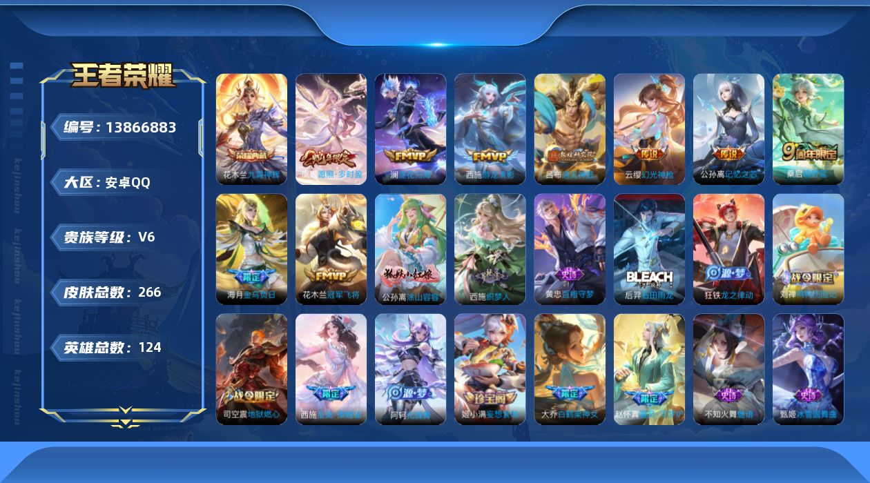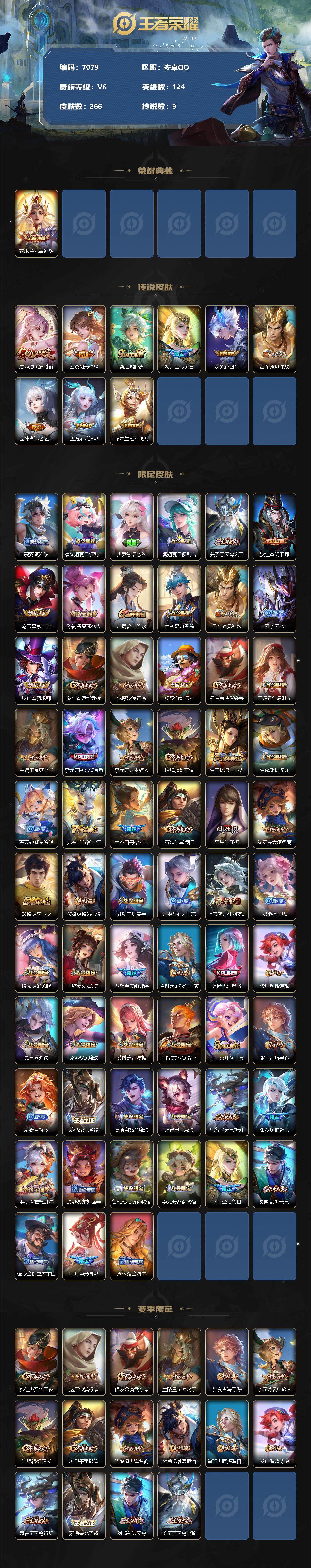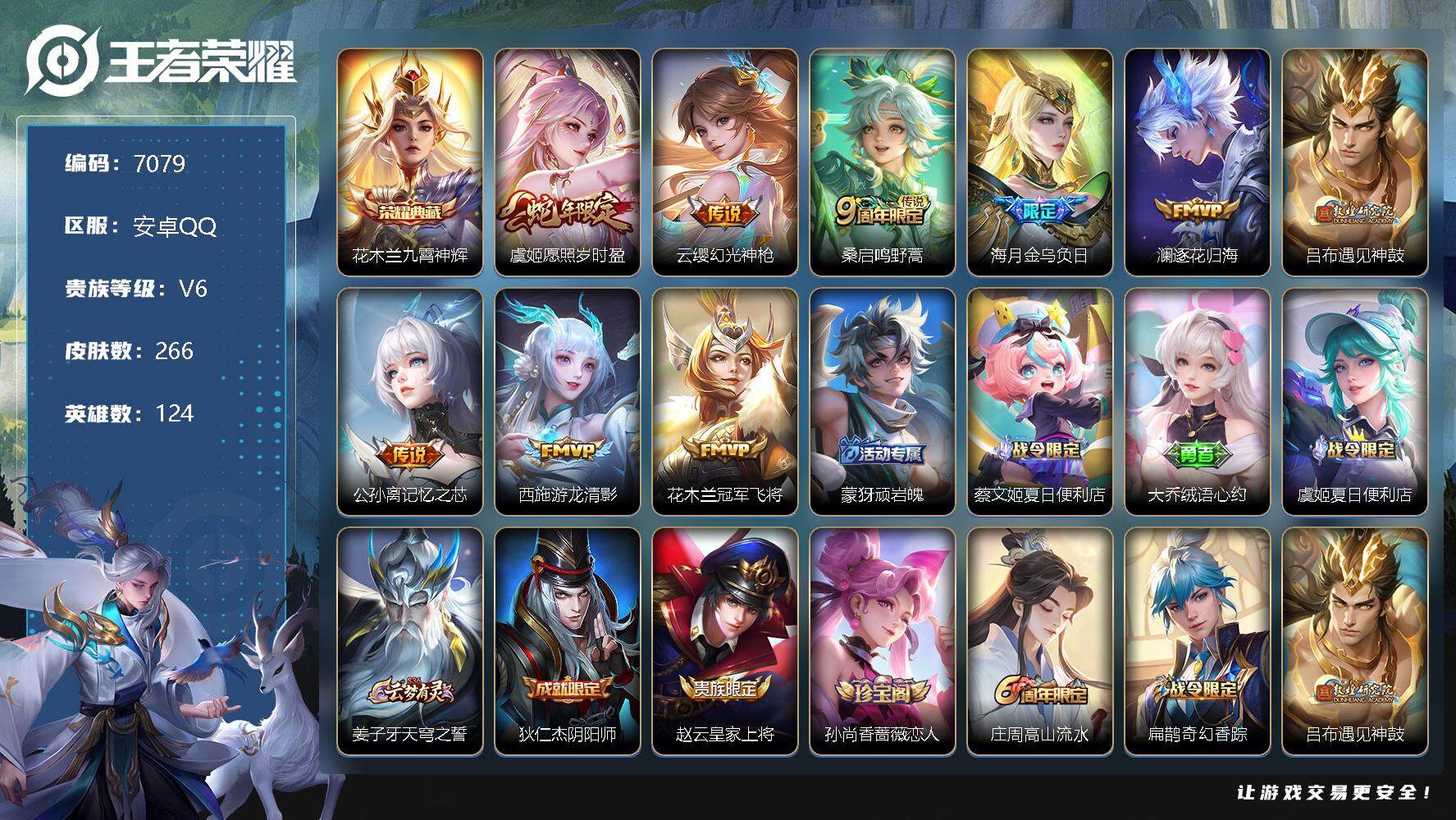 [13866883]安卓Q-V6-永恒钻石II段位-124英雄-266皮肤-1典藏-0珍品无双-0无双-0珍品传说-9传说-90史诗