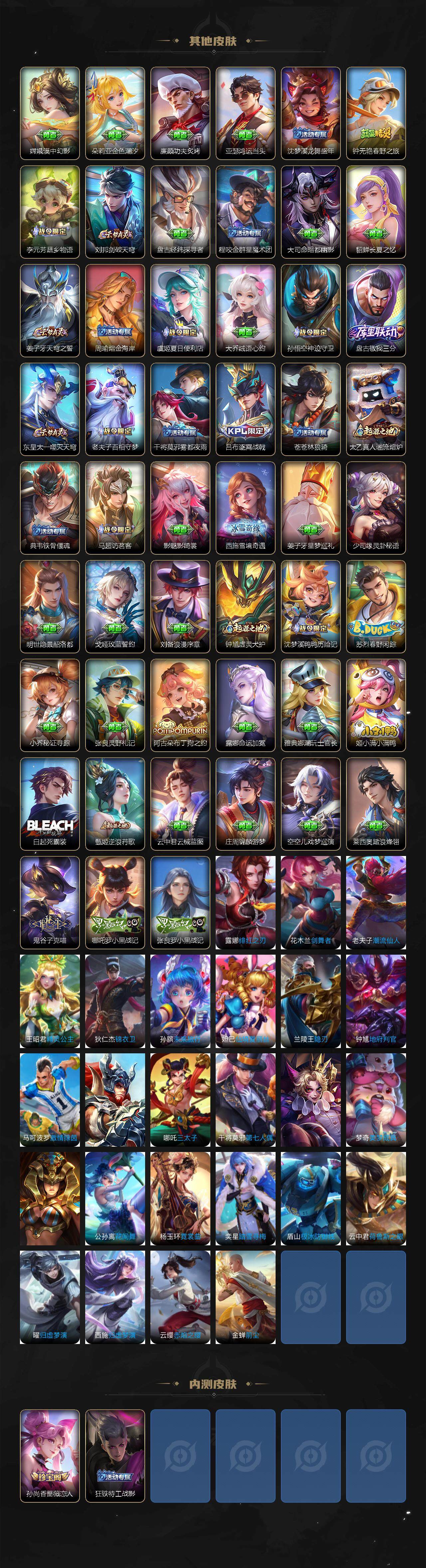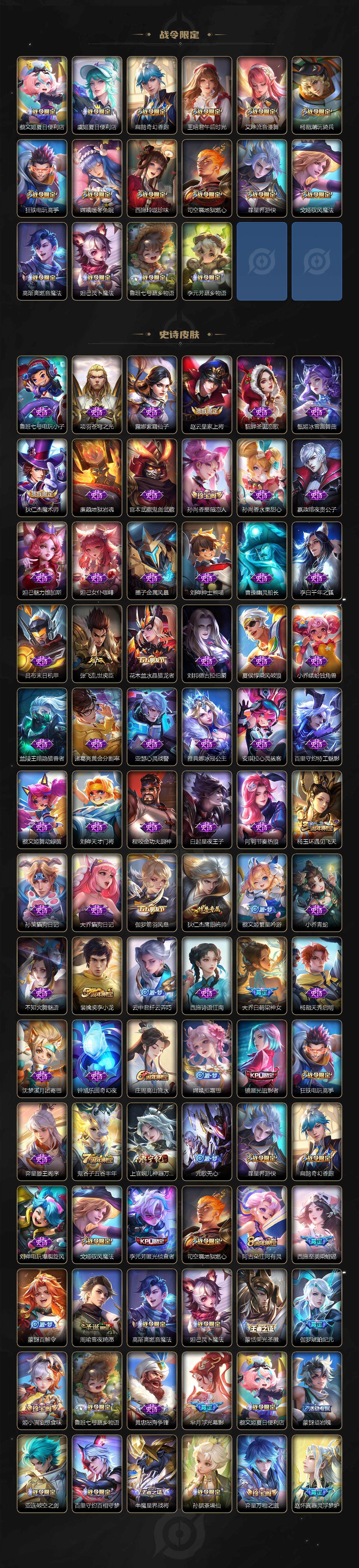 【限定皮肤】:蒙犽顽岩魄,蔡文姬夏日便利店,大乔绒语心约,虞姬夏日便利店,姜子牙天穹之誓,狄仁杰阴阳师,赵云皇家上将,孙尚香蔷薇恋人,庄周高山流水,扁鹊奇幻香踪,吕布遇见神鼓,元歌无心,狄仁杰魔术师,狄仁杰万华元夜,达摩沙漠行僧,项羽海滩派对,程咬金演武夺筹,王昭君午后时光,兰陵王金庭之子,李元芳匿光侦查者,李元芳云中旅人,钟馗驱傩正仪,杨玉环遇见飞天,杨戬潮玩骑兵,蔡文姬繁星吟游,鬼谷子五谷丰年,大乔白鹤梁神女,苏烈千军破阵,弈星混沌棋,沈梦溪大漠名商,裴擒虎李小龙,裴擒虎擒涛扼浪,狂铁电玩高手,云中君纤云弄巧,上官婉儿神器万象笔,嫦娥拒霜思,嫦娥暖冬兔眠,西施玲珑珍味,西施至美乘鲤谣,鲁班大师探海日志,镜匿光追影者,桑启海盐诗旅,暃星界游侠,戈娅驭风魔法,艾琳流音漫舞,司空震地狱燃心,阿古朵江河有灵,张良古海寻踪,蒙犽百解令,蒙恬荣光圣徽,高渐离燃音魔法,妲己灵卜魔法,鬼谷子天穹祈灯,伽罗琥珀纪元,姬小满妄想食味,沈梦溪龙舞盛年,鲁班七号蔬乡物语,李元芳蔬乡物语,海月金乌负日,刘邦剑破天穹,程咬金群星魔术团,芈月浮光幕影,周瑜熔金海岸